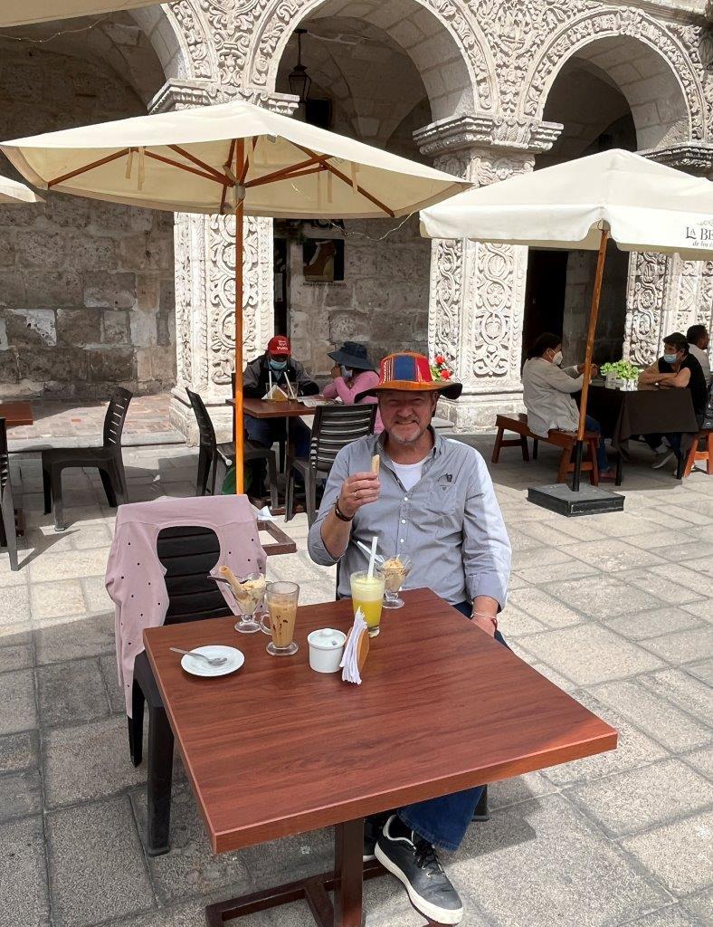 Misti Coffee er en lille café med udendørsservering i en af de hyggelige klostergårde, Claustros de La Compañia, som hører til kirken ved siden af. Her ender vi oftest med at tage en kop kaffe, når vi er inde i det historiske centrum, da selve gården er meget smuk, og her for det meste er sol midt på eftermiddagen. Vi tager altid enten kaffe latte, iskaffe eller juice, og så bliver det også næsten altid til en queso helado, Arequipas isspecialitet, som er rigtig lækker her.