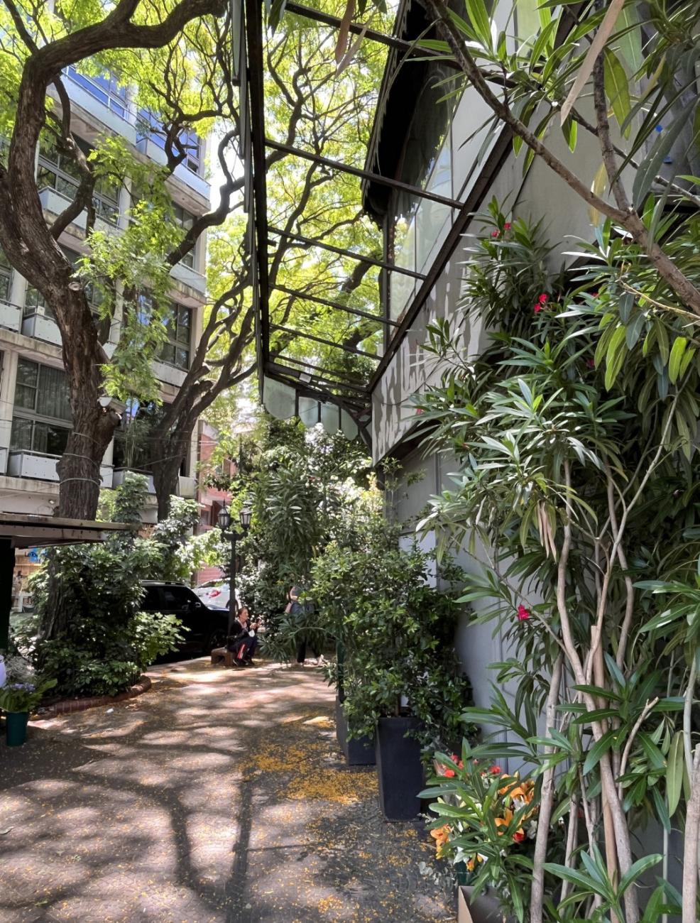 Syd for parkerne og vest for vores lejlighed ligger indkøbscenteret Alto Palermo, og derefter kommer Plaza Italia. Her tager vi ud for at kigge på jacarandatræer, og det er også her, udstillingen med Banksy er. Vi går flere gange hjem herfra, enten ad Av. Santa Fe eller ad de mindre gader parallelt hermed, hvor det er lidt hyggeligere at gå. En enkelt gang tager vi metroen ud til et større område med butikker og caféer, som hedder Distrito Arcos, hvor vi kigger på butikker og spiser en frokost.