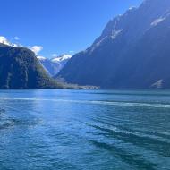 Milford Sound er en fjord, der løber ca. 15 km inde i landet fra Det Tasmanske Hav og er omgivet af klippevægge, der rejser sig 1.200 meter eller mere på begge sider. Vi er utrolig heldige med vejret, da vi har det smukkeste solskinsvejr på vores to timers sejltur; der falder ellers 7.000 mm regn i området om året, så mange oplever Milford Sound i regnvejr. Vi nyder turen i den flotte fjord med smukke bjerge og vandfald og er også heldige at se sæler og et par meget små pingviner.