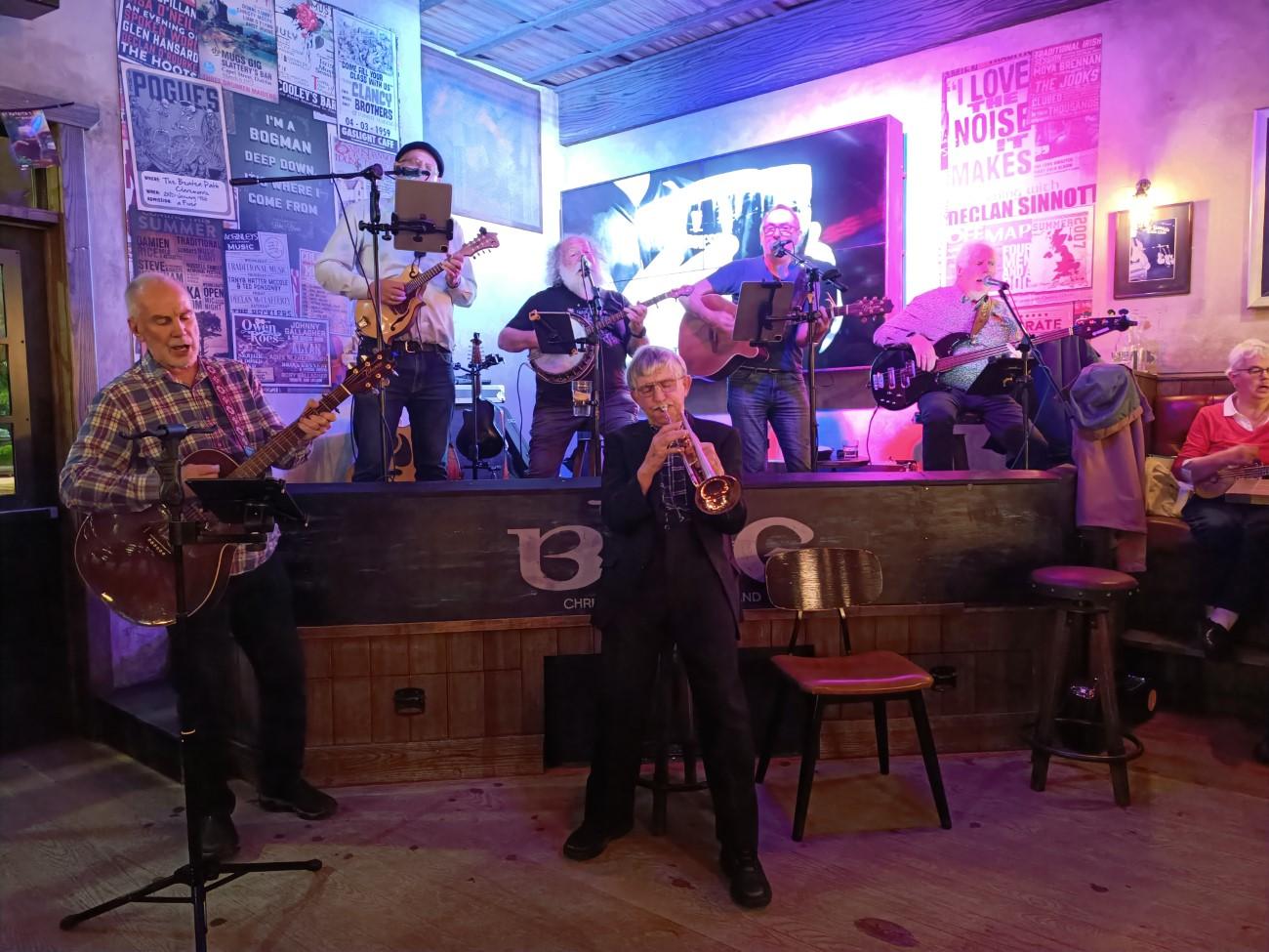Vi finder ud af, at The Jameson Irish Band er fast punkt på programmet hver tirsdag aften kl. 19.30. Selve bandet består af fire musikere, hvor sangeren og guitaristen Philip dels er meget karismatisk, dels synger rigtig godt. Ud over bandet deltager en række musikere, hvoraf mange er gengangere fra gang til gang, men hvor der også kommer nye indimellem. Alle kan komme ind fra gaden og deltage. Det er rigtig god gammeldags irsk folkemusik, og da der bliver uddelt sanghæfter med omkvædet på de fleste af sangene, er der virkelig lagt op til fællessang. Vi kan nu ikke altid finde ud af, hvilken sang der synges, men vi har det sjovt. Gennemsnitsalderen for musikerne ligger for de flestes vedkommende et godt stykke over de 70, og trompetisten Neville Wilkins, der også er et godt stykke oppe i årene, kommer hen og snakker med os i pausen og viser billeder fra sin tid i bandet The Viscounts, der blev stiftet, da vi blev født. Mange af musikerne bestiller varm kakao med Baileys i pausen, så det må vi også prøve.