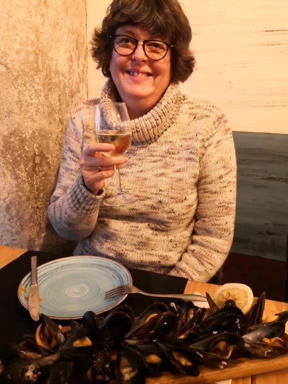 Entre Bateas ligger i restaurationsgaden Rúa Franja meget tæt på vores lejlighed. Vi besøger restauranten om eftermiddagen den anden dag i byen, hvor vi får et glas hvidvin ude på fortorvet og kigger på alle folk, der går forbi. Det er et meget lille sted, og vi bliver enige om at bestille bord til om aftenen, da de skaldyr, de andre får serveret, ser lækre ud, og vi bliver bestemt ikke skuffede. Vi får tre tallerkener til deling – blåmuslinger, grillede rejer og tun. Både muslingerne og rejerne er noget af det bedste, vi har prøvet, og vi kommer tilbage et par gange, da vi især er blevet ret glade for deres rejer. Vi får naturligvis Albariño til.