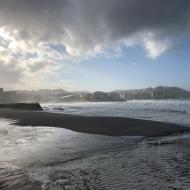 Vi går ofte en tur ned til stranden, da der er en bred promenade, så man kan gå en pænt lang tur. Den ligger i en lille bugt, der peger mod nordvest. Atlanterhavet rammer kysten uden nogen form for beskyttelse på vej ind, hvilket vil sige, at hvis man sejler lige ud med en båd fra midt på stranden, vil man ramme enten Grønland eller Canada.
