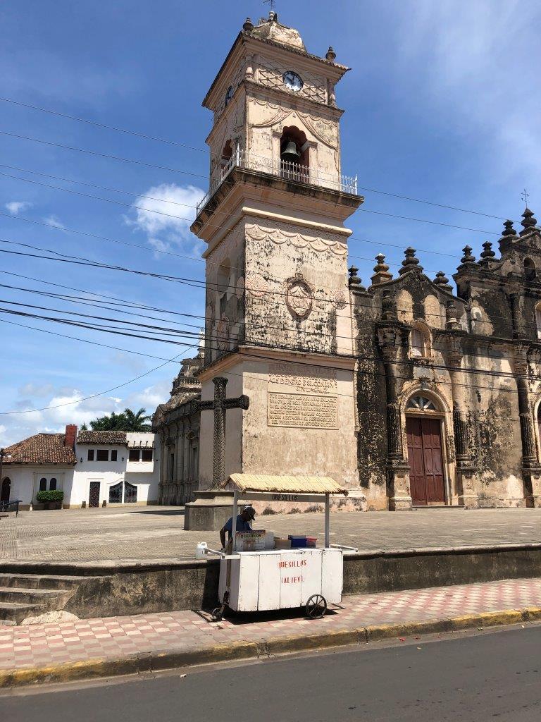 Kirken er en af de smukkeste i byen, og man kan se på facaden, at den har været i brand på et tidspunkt – vi får at vide, at man har valgt at bevare facaden på den måde, så man ikke glemmer branden. Vi går op i klokketårnet, hvor man er helt tæt på de store klokker, og hvor der er en flot udsigt ud over byen og katedralen med Nicaragua-søen bagved – trappen op er meget smal og lidt ubehagelig at gå på. De lukker ikke kirken i forbindelse med lockdown, men de sætter et skilt op, hvor de, så vidt vi kan læse os til, aflyser gudstjenesterne i kirken. Der plejer også at være et stort optog til påske, men det er desværre også aflyst.