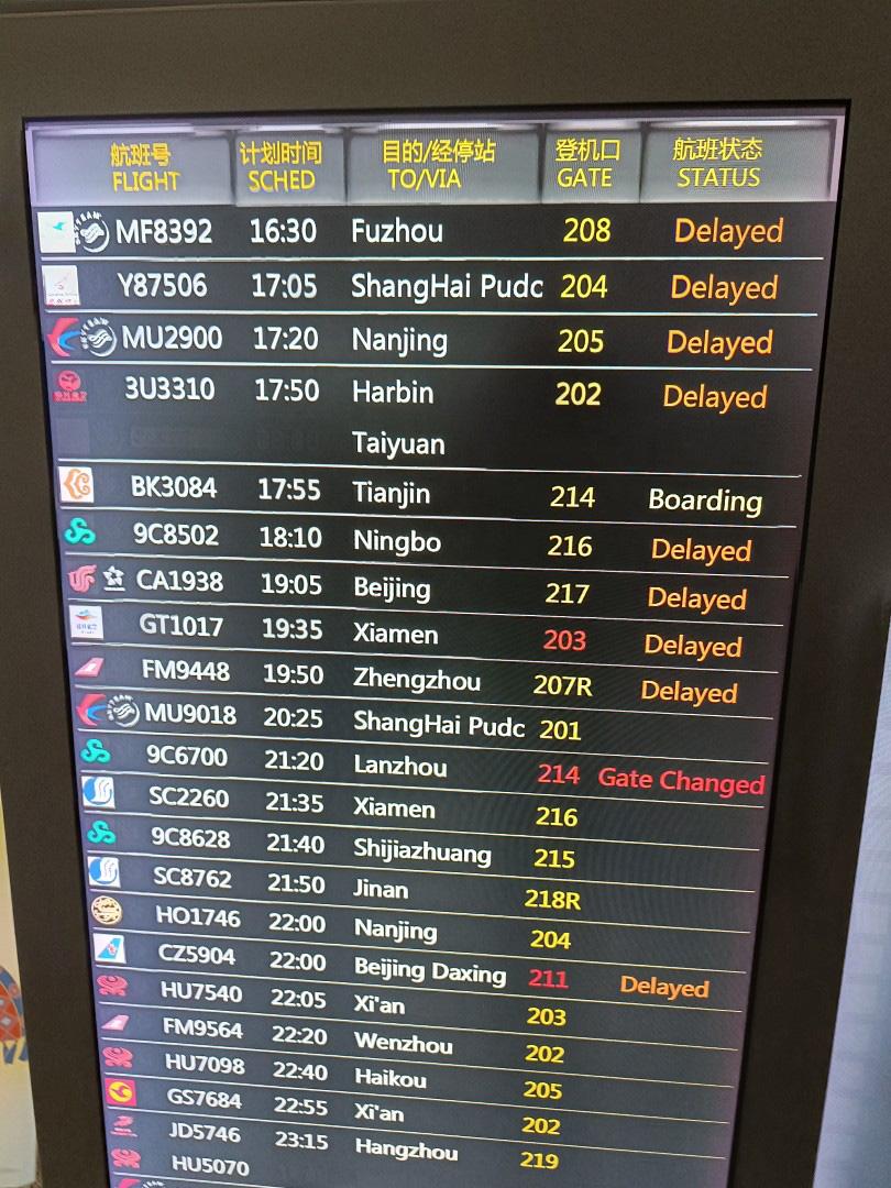 Så er det tid til noget koldt at drikke, hvorefter vi går ud til gaten. Det viser sig så, at vores fly er forsinket; vi skulle være lettet kl. 16.30, og vi kan ikke få at vide, hvornår de forventer at kunne komme afsted. Vi sidder der et par timer, hvorefter vi beslutter os for at tage noget at spise, da vi godt kan se, at det ender med at blive sent, inden vi er fremme i Fuzhou. Vi får en ikke særlig god steak, og endelig kan vi boarde flyet kl. 19.30. Vi er fremme i Fuzhou omkring kl. 22, får vores bagage og finder Xiamen Airlines’ skranke, hvor vi heldigvis uden problemer får en voucher til et hotelværelse på Fliport Garden Hotel Fuzhou og bliver vist ud til en shuttlebus. Der er rigtig mange, der skal overnatte i Fuzhou, men vi kommer heldigvis godt frem i køen og kan tjekke ind kl. ca. 23.15.