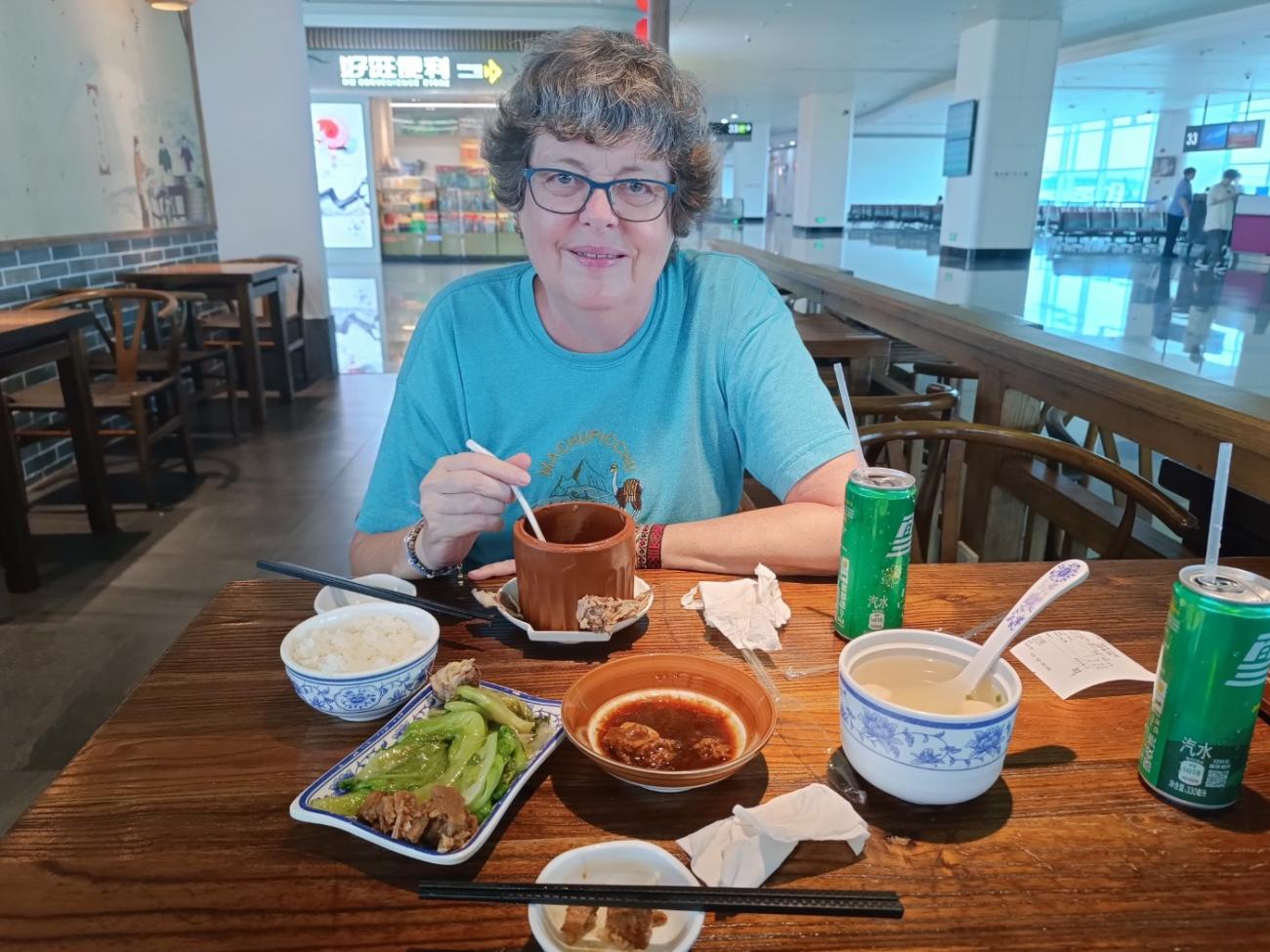 Det er herefter tid til sikkerhedstjek. Det viser sig, at vores ene kuffert er taget ud til kontrol, så Hanne må følge med ud bagved uden at kunne give Jens Peter besked. Det er ikke helt klart, hvad det er, de leder efter, men det ender med, at hun får besked om at tage et par små batterier med i håndbagagen, hvorefter de er tilfredse. Tilbage i sikkerhedskontrollen må hun derefter aflevere sin powerbank, som ikke er sikkerhedsgodkendt i Kina. Det gælder åbenbart kun indenrigsflyvninger, så det er lidt uheldigt, at vi ikke kan flyve direkte til Korea.