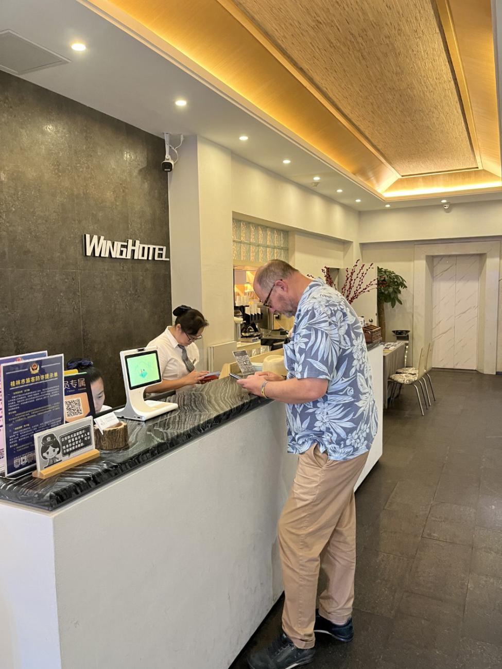 Vi kommer ind på hotellet, som gerne vil have betaling for alle 28 dage med det samme, men vi kan desværre ikke få hverken Alipay eller vores kreditkort til at virke, hvilket er ret irriterende efter 10 timer på farten. Det lykkes os dog at få betalt for den første nat, og efterfølgende finder de ud af at opkræve resten af beløbet gennem Hotels.com. Pigerne i receptionen vil så gerne give os en god service, selvom de kan meget lidt engelsk, så de synes, at de skal fortælle os alt om byen og tilbyde mulige udflugter samt vise, hvordan vaskemaskinen i stueetagen virker, inden vi får nøglen. Det ender med, at vi er lidt uhøflige, da vi virkelig gerne vil op på værelset og på toilettet, og vi har jo fire uger, så vi skal jo nok nå det hele. De er vist ikke vant til, at deres gæster bor her så længe.