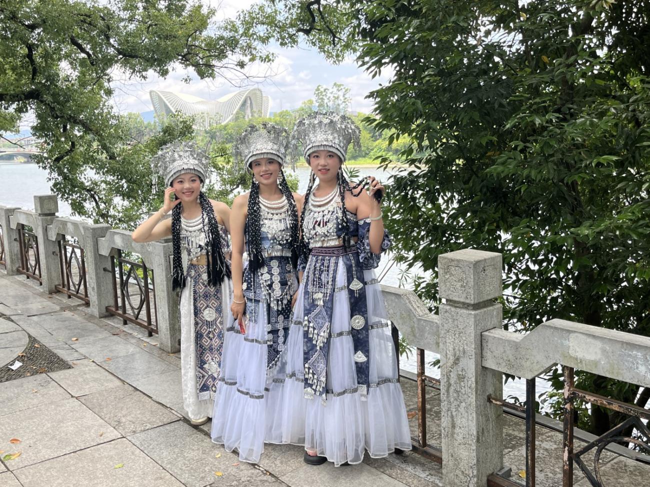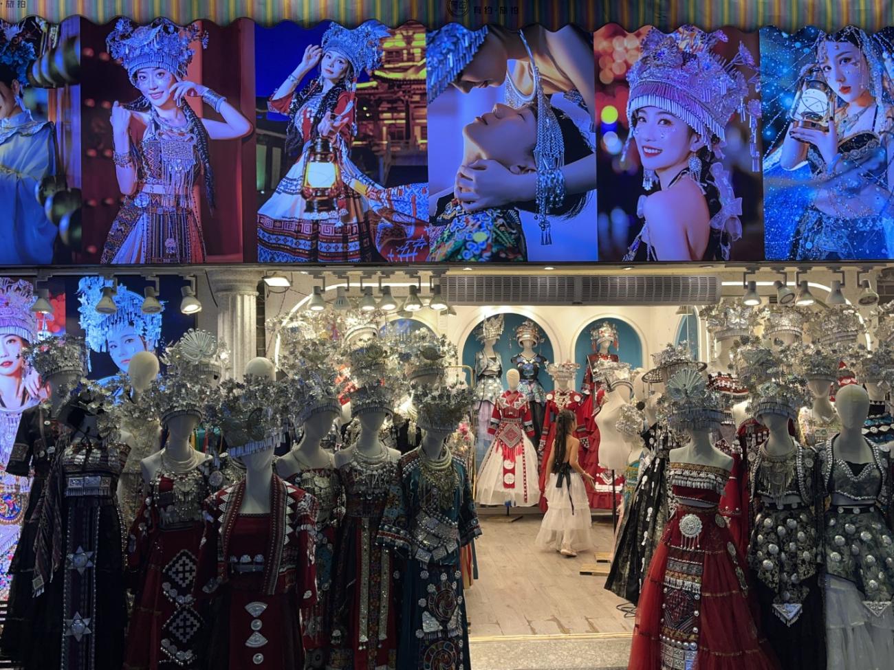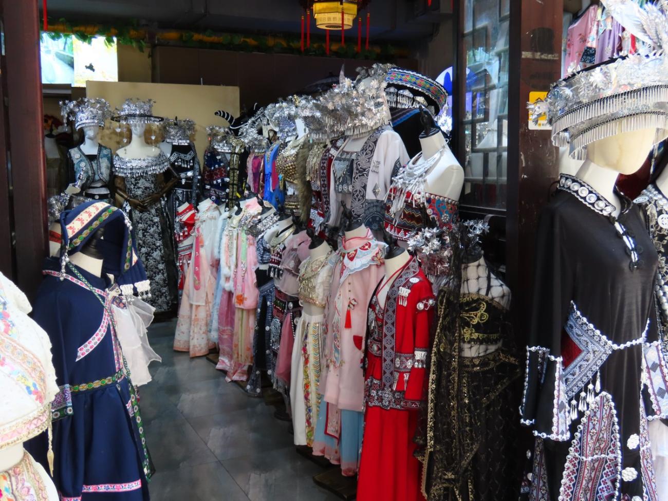 Alle steder i byen finder man butikker med traditionelle kinesiske klædedragter, hvor man kan blive sminket og leje tøj for en dag. Det er der rigtig mange af turisterne, der benytter sig af, og vi får lov at tage et billede af tre smukke piger nede ved floden.