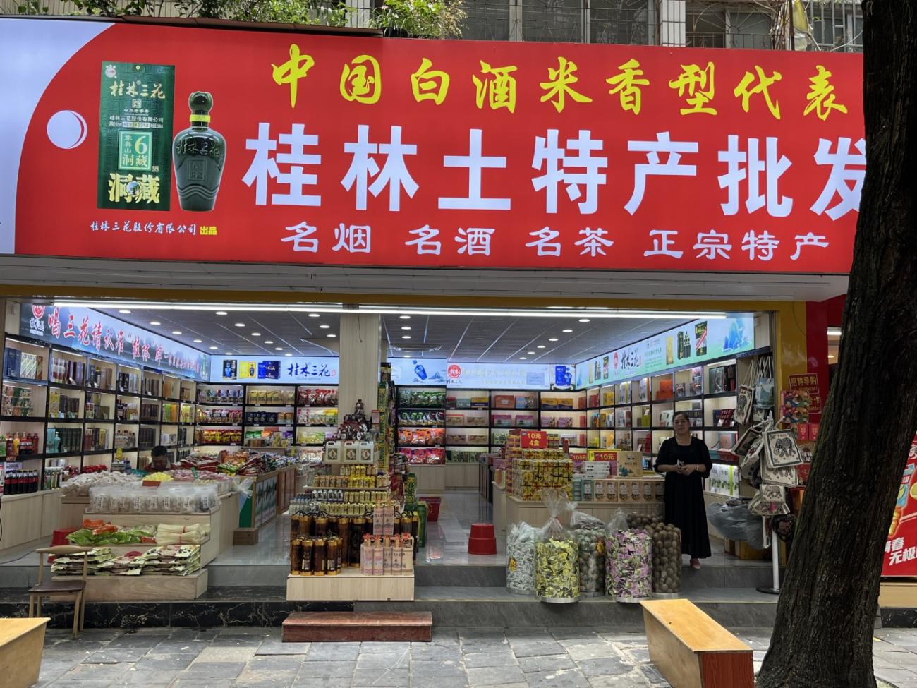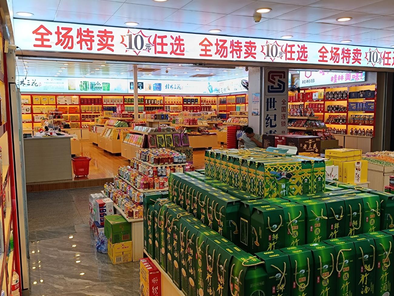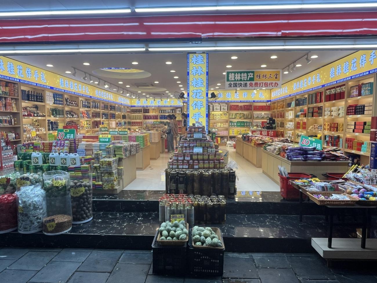 Da vi jo bor på hotel, har vi ikke brug for de store indkøb, men vi besøger dog supermarkedet i kælderen under varehuset Guilin Wangcheng Department Store et par gange for at købe kaffe, snacks og andre småting. Vi køber ekstra vand i et par butikker tæt på hotellet, og bageren Ton Gyan Wuyu nede på hjørnet har nogle udmærkede kager, som vi nogle gange køber med hjem på værelset om eftermiddagen. Deres små lidt søde kager med “danske” pølser smager lidt pudsigt, så dem køber Hanne kun én gang.