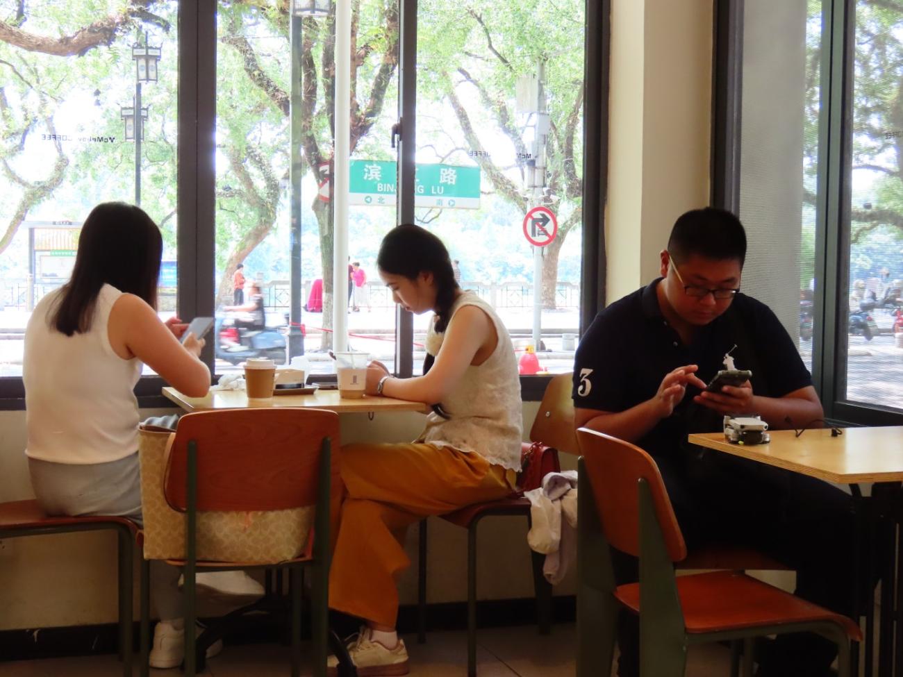 Der er ikke nogen morgenmadsrestaurant på hotellet, så vi går ud for at spise morgenmad hver morgen et sted mellem kl. 10 og 11. McMellow Coffee ligger nede for enden af vores vej på Binjiang Road, der går langs floden, og her ender vi med at spise så godt som hver dag, da her er rigtig hyggeligt. Vi får næsten altid en sandwich med skinke, æg og avokado samt en iste med citron. Der er kun en enkelt, der kan lidt engelsk, men vi klarer os med vores oversættelses-app. I starten bruger vi lidt tid på at forklare, at Hanne kun vil have halvt sukker i isteen, men der går ikke lang tid, før de har styr på, hvad vi skal have.