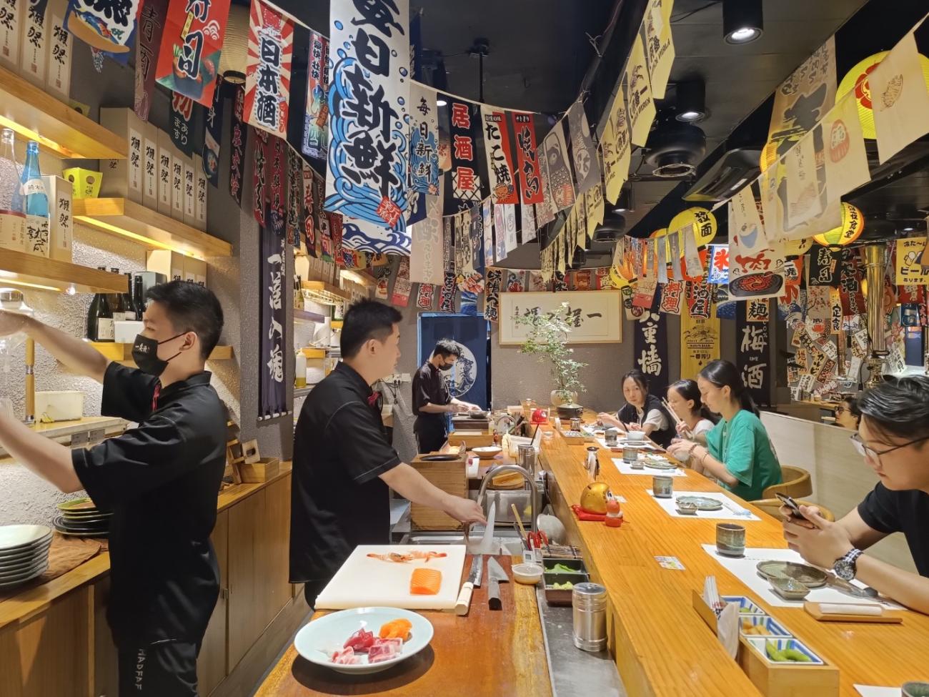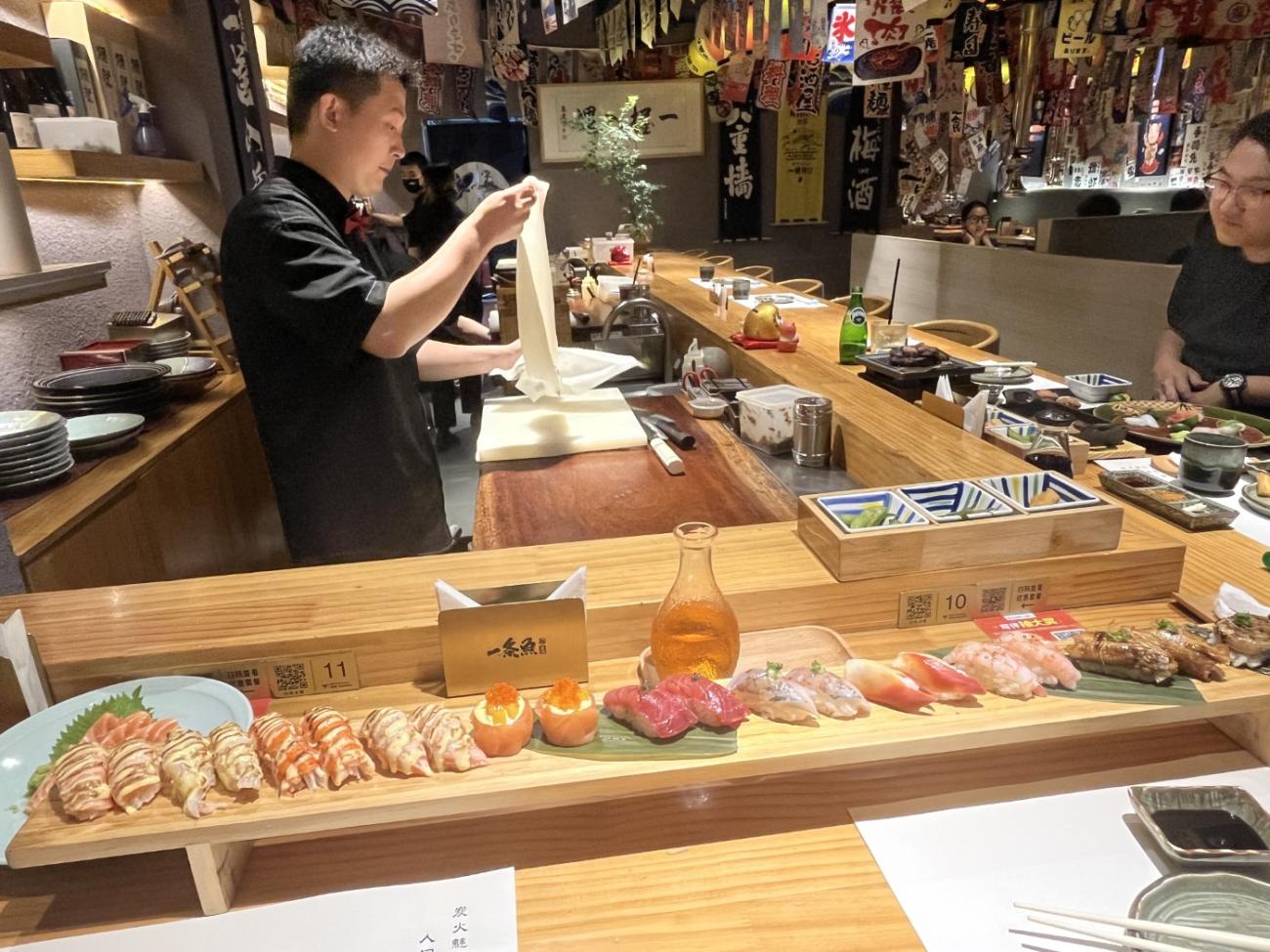 Yitiaoyu Qitanshao er en rigtig god sushirestaurant, som ligger på Binjiang Road. Det er også den dyreste restaurant, vi besøger i byen, selvom priserne dog stadig er lavere end i Danmark. Den første gang bestiller vi en meter sushi, men da det ikke er det hele, der er lige godt, bestiller vi efterfølgende lidt forskelligt sushi fra menuen og finder også ud af, at man kan få kød, som serveres på en varmeplade inde ved bordet. Det smager rigtig godt. Der serveres kogende vand til maden, hvilket ikke lige er os, så Hanne bestiller normalt en danskvand og Jens Peter en lidt speciel blommesaft.