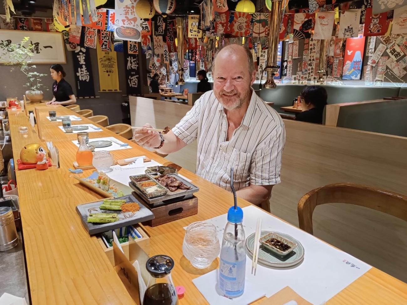 Der er ikke nogen, der taler engelsk, men vi får udleveret en iPad, hvor vi selv kan bestille, hvad vi vil have. Vi vil helst sidde ved bardisken, så vi kan se kokkene arbejde, og da vi kommer den sidste gang, har de allerede trukket stolene ud, hvor vi plejer at sidde. De har den bedste mad i byen, og servicen er god; eneste minus er, at man må ryge i restauranten. Det er lidt mærkeligt på en sushirestaurant, hvor maden tilberedes inde i lokalet, synes vi.