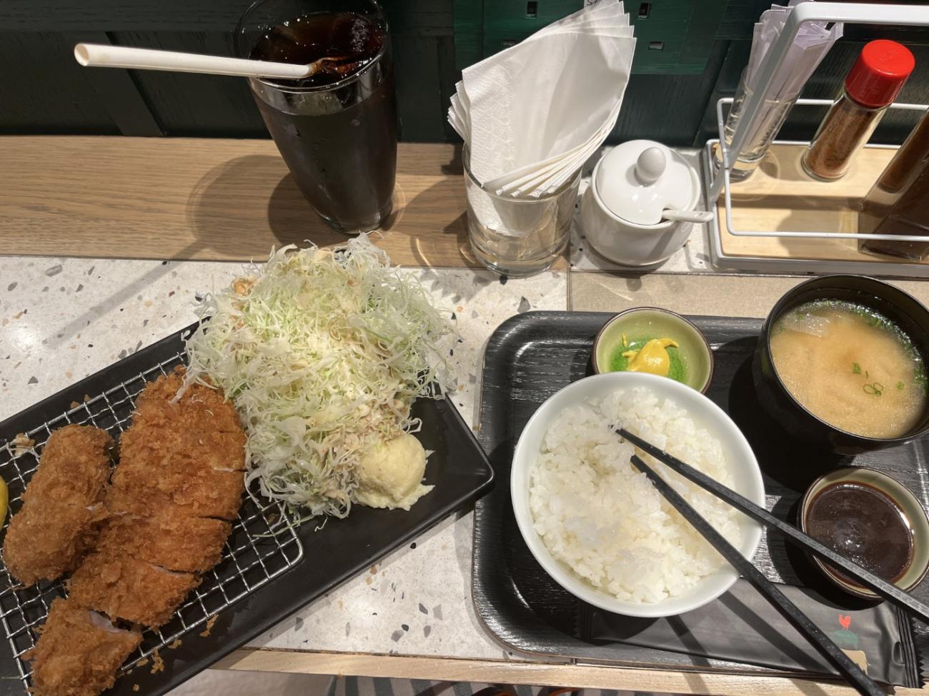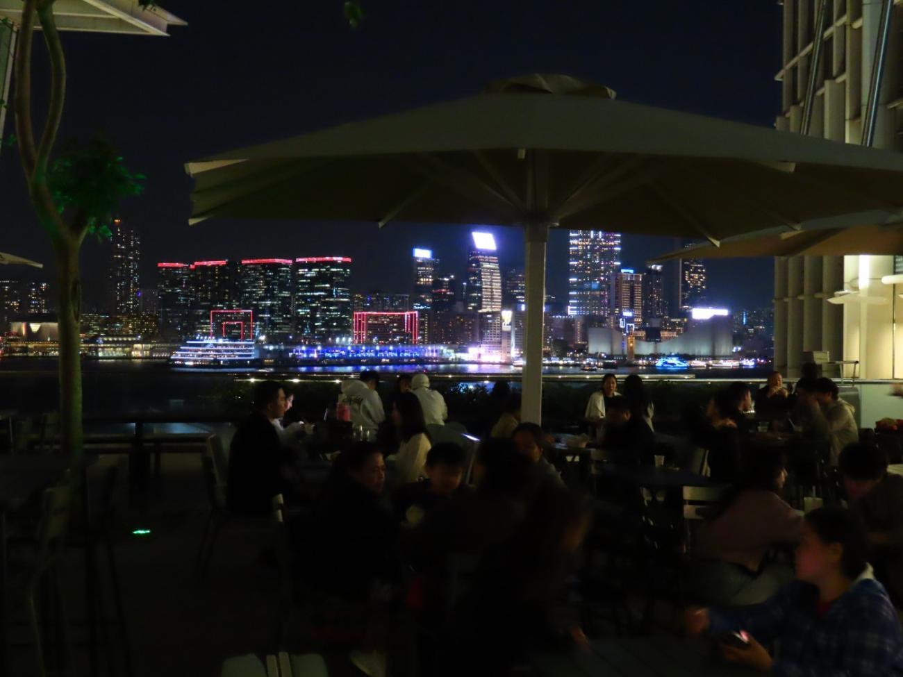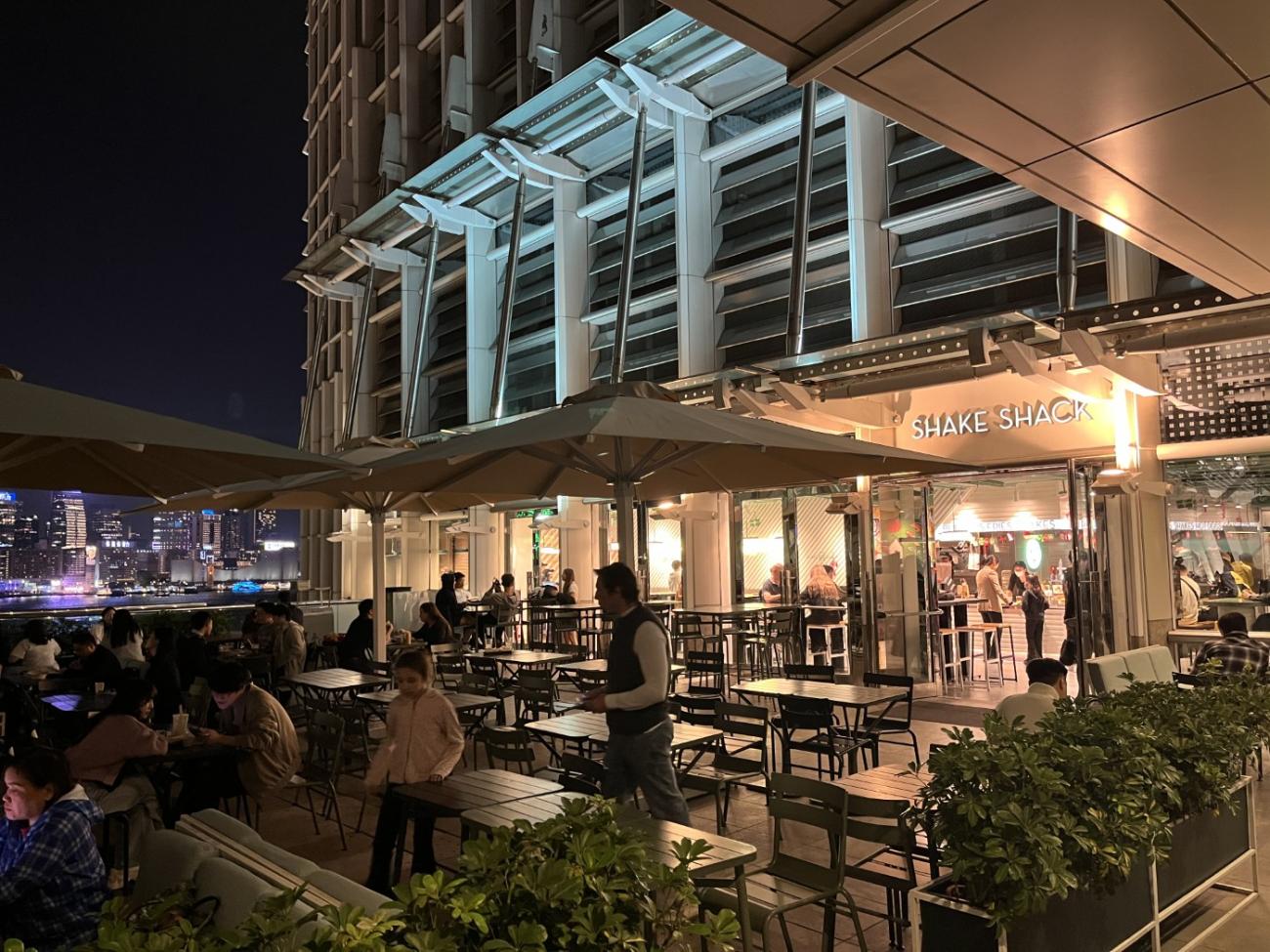 Vi besøger The Lasagna Factory den første aften i byen, hvor maden er god, men portionerne er lidt små; til gengæld bliver vi underholdt med italiensk harmonikamusik og sang til maden. Mama Mia Pizza & Pasta ligger tæt herpå, og her er vi to gange og får gode pizzaer. Hos Porker lige ved siden af rulletrappen får vi rigtig god tonkatsu, og vi får god ramen i den meget lille Nagahama No. 1 Ramen, hvor vi sidder i vinduet. Shake Shack ligger i indkøbscenteret ifc, og de har gode burgere og en terrasse med udsigt over havnen; vi kommer her to gange. Vi tager sandwich fra Subway med hjem på værelset to gange.