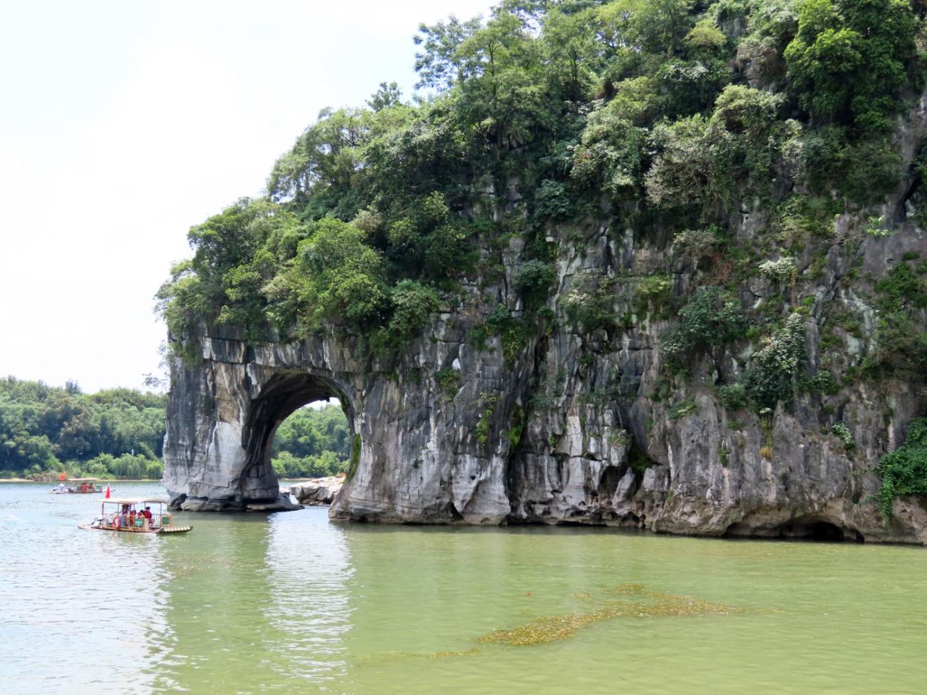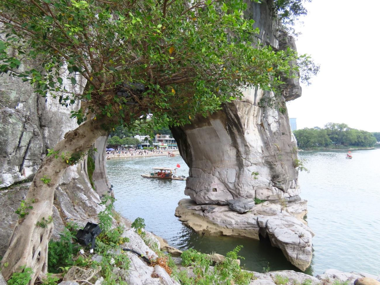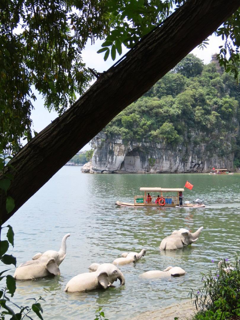 Navnet på det lille bjerg henviser til, at det med lidt god vilje ligner en elefant, der dypper sin snabel i Li-floden, så her er et gennemgående elefanttema, hvor en række stenelefanter ude i floden er de mest charmerende. Vi bruger lidt tid på at gå rundt i området, hvor vi bl.a. besøger et par helligdomme, og vi går en tur rundt om bjerget, så vi kan kigge gennem “snablen” ind på land. Det er muligt at gå en tur op på bjerget, men det fravælger vi, da det ligesom alle de andre dage er helt utroligt varmt.