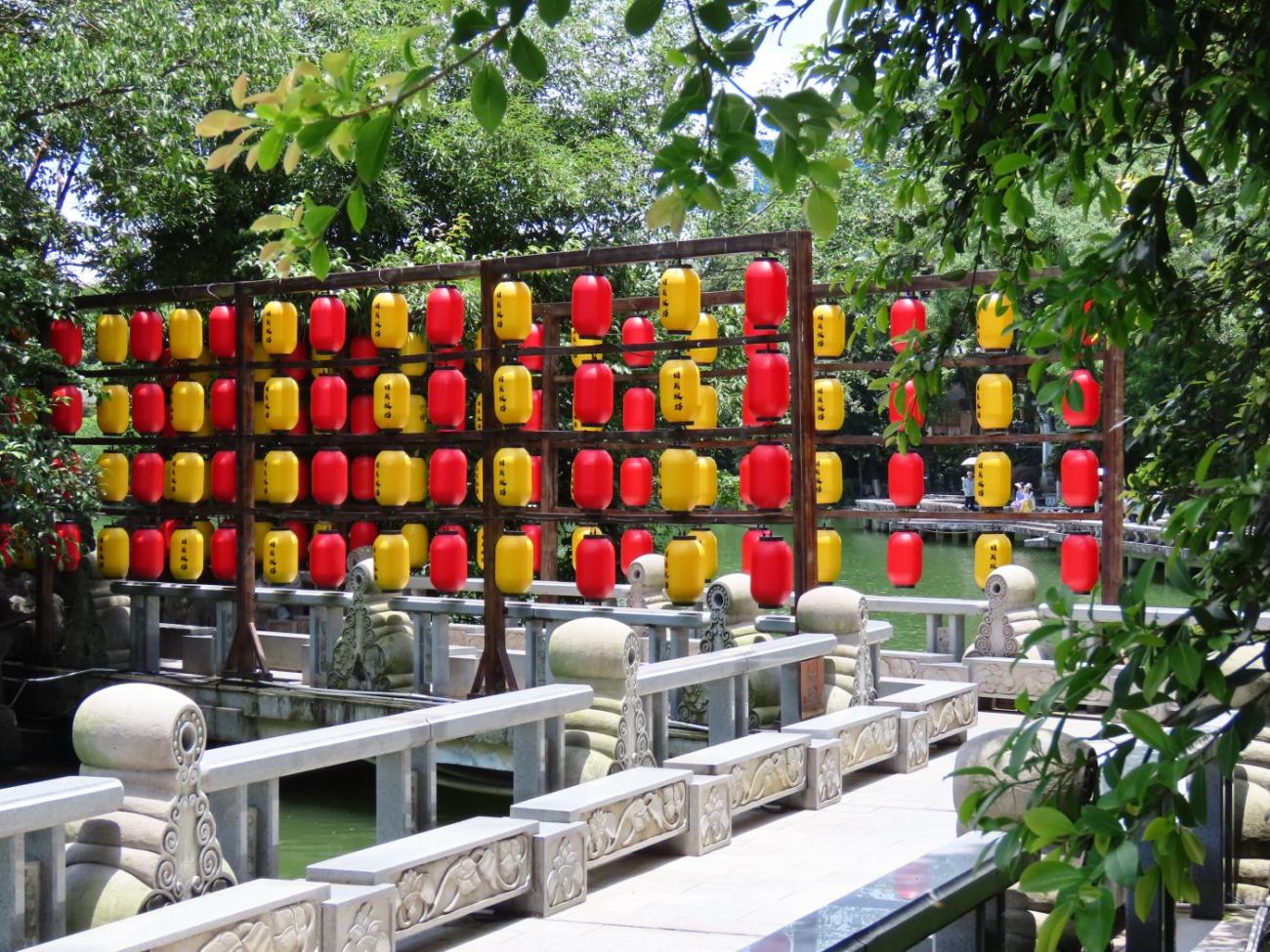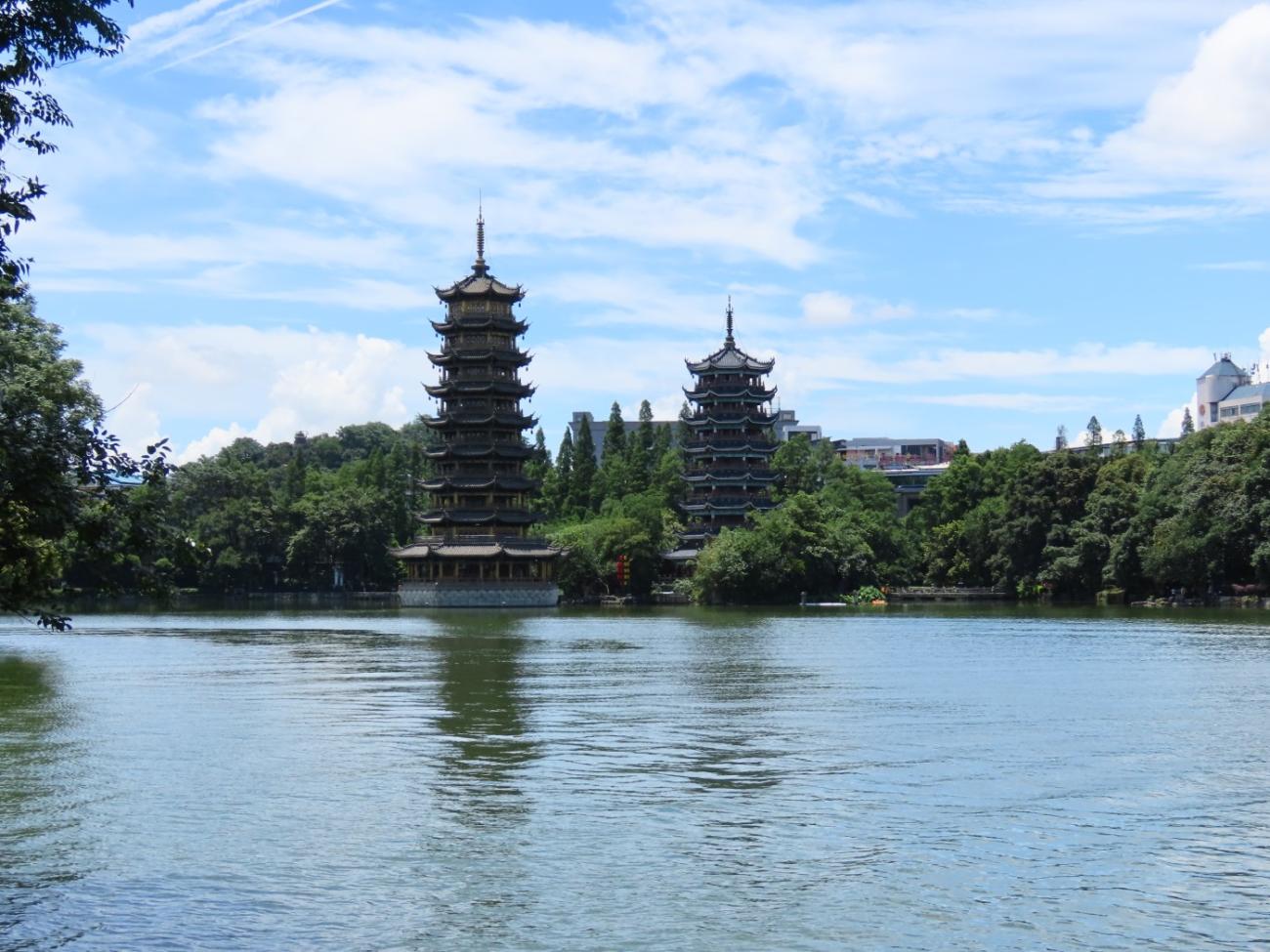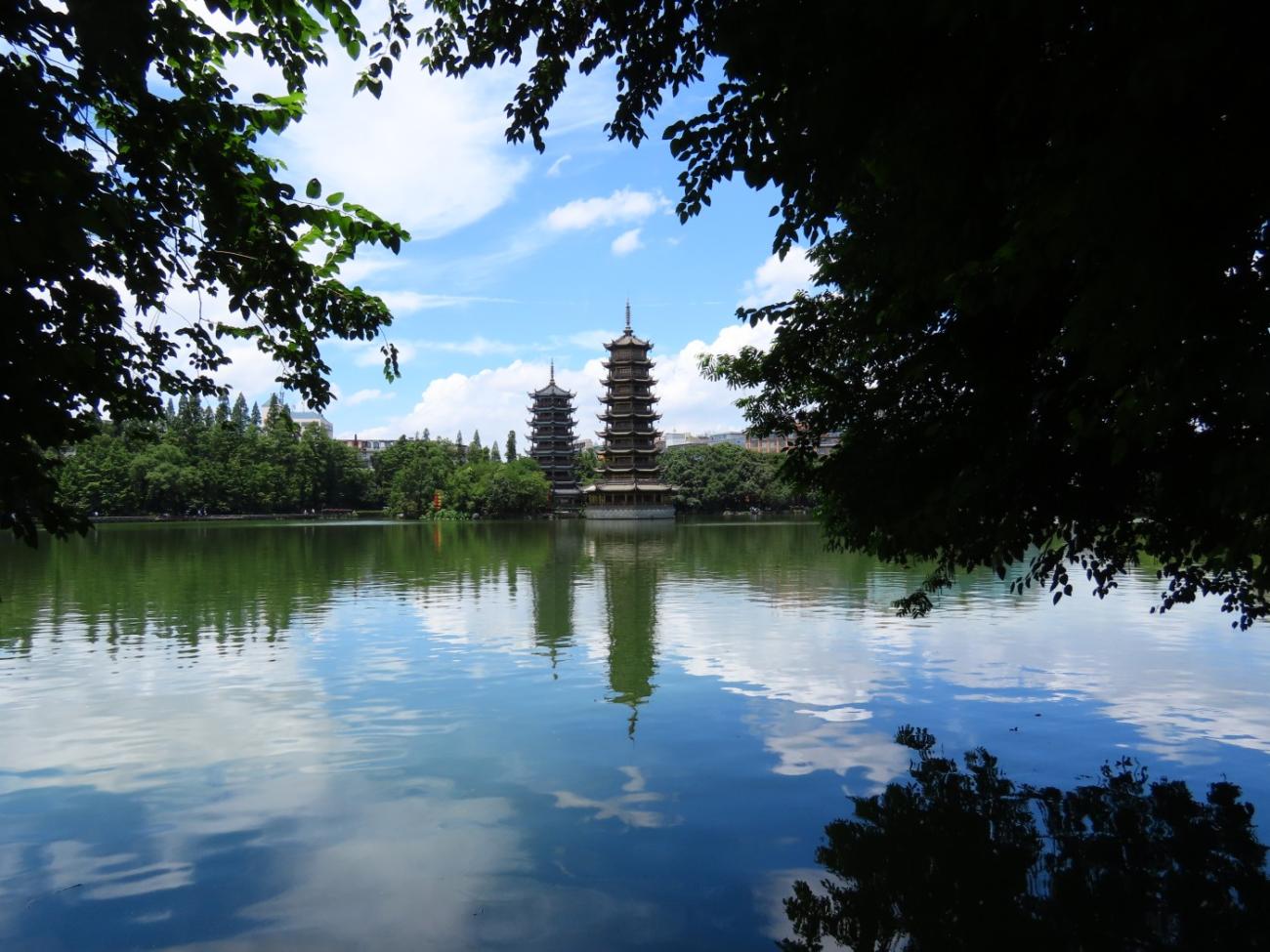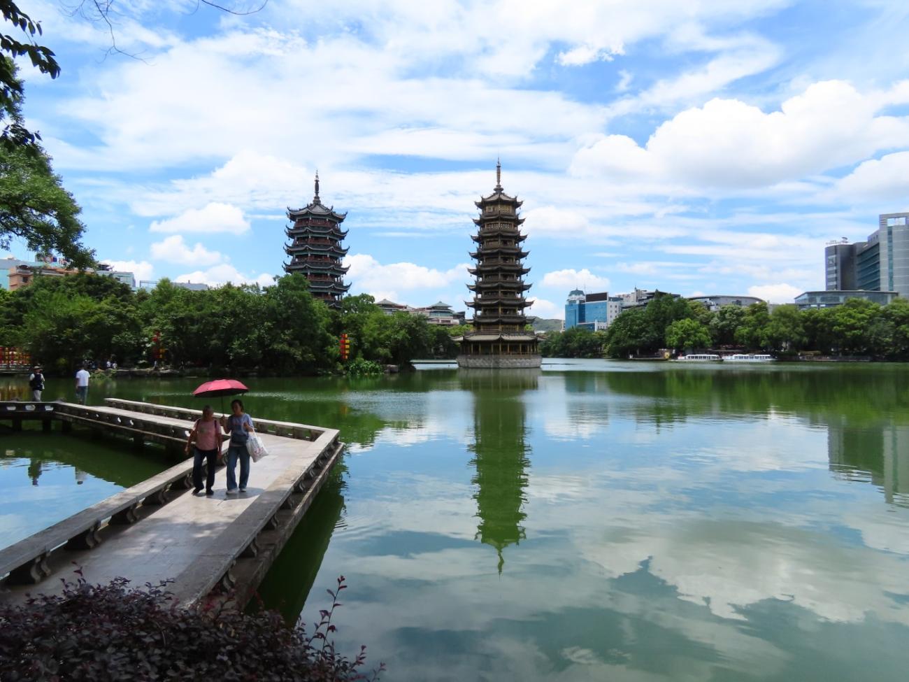 Allerede på vores første dag i Guilin går vi en tur i det smukke område Riyue Shuangta Cultural Park, hvor vi kommer forbi Solpagoden og Månepagoden, og vi beslutter os for et besøg. De to pagoder, der oprindeligt blev bygget i Guilins voldgrav under Tang-dynastiet, blev rekonstrueret i 2001 ved hjælp af historiske optegnelser.