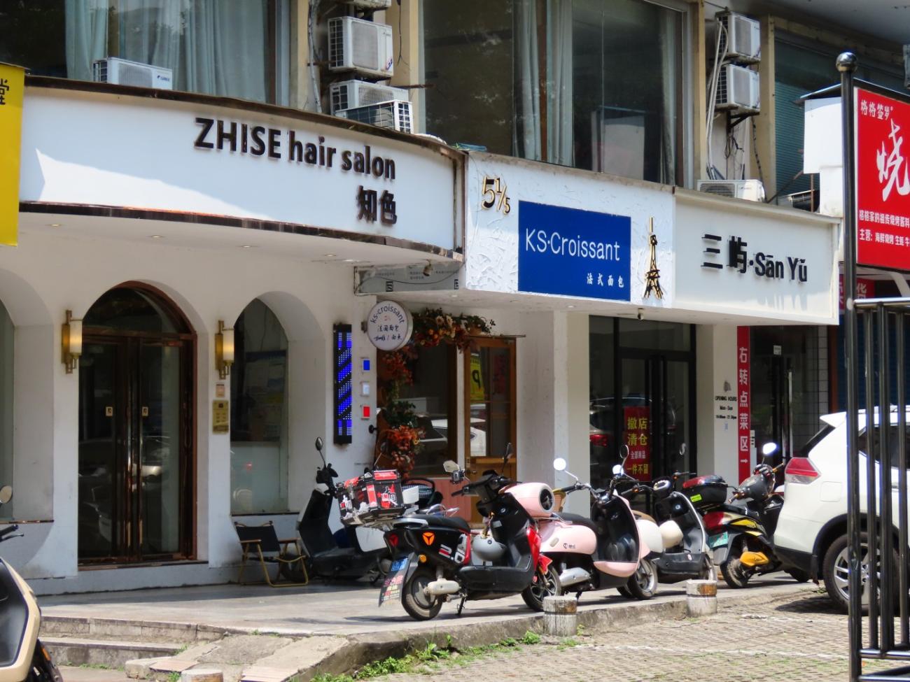 Vi spiser morgenmad hos KS Croissant France Bread en enkelt gang og køber også croissanter og boller med hjem herfra et par gange. Den ligger lige rundt om hjørnet fra Amani Italian Restaurant. Vi besøger tre caféer i området East West Alley. To Be Natural har noget meget kedeligt kold te på flaske, Wanfangxin Tea House er meget langsomme med at få serveret, og hos CoCo får vi nogle lækre smoothies. Vi besøger tecaféen Chagee i varehuset Guilin Wangcheng Department Store et par gange, men ellers drikker vi altid vores iste i gaden Wenhuagong Road, hvor vi både besøger No Yeye No Tea, Molly Tea, Hey Tea og Tea Expert. Vi får egentlig den bedste iste hos Molly Tea, men her er lidt halvtomt, så vi kommer oftest hos No Yeye No Tea, hvor der altid er travlt og en god stemning. Det er imponerende, hvor meget iste der bliver hentet af de forskellige bude i byen. Derudover besøger vi to caféer ude på den anden side af Shanhu Lake samt Ronghuyi Coffee, der ligger endnu længere væk.