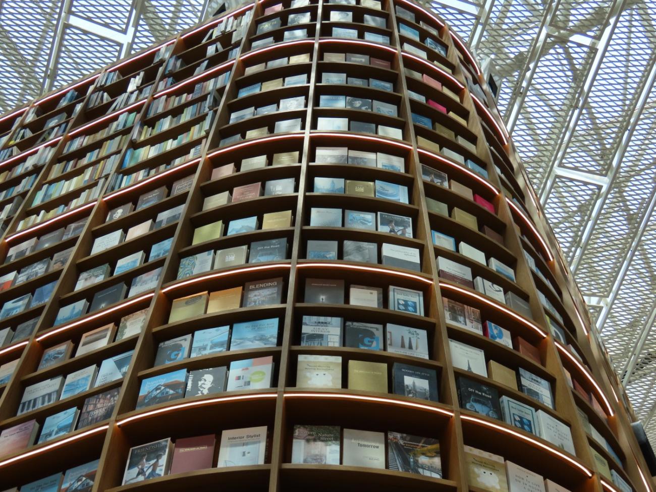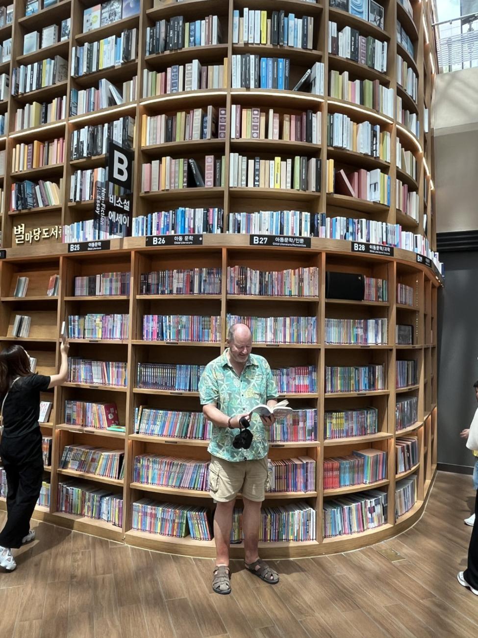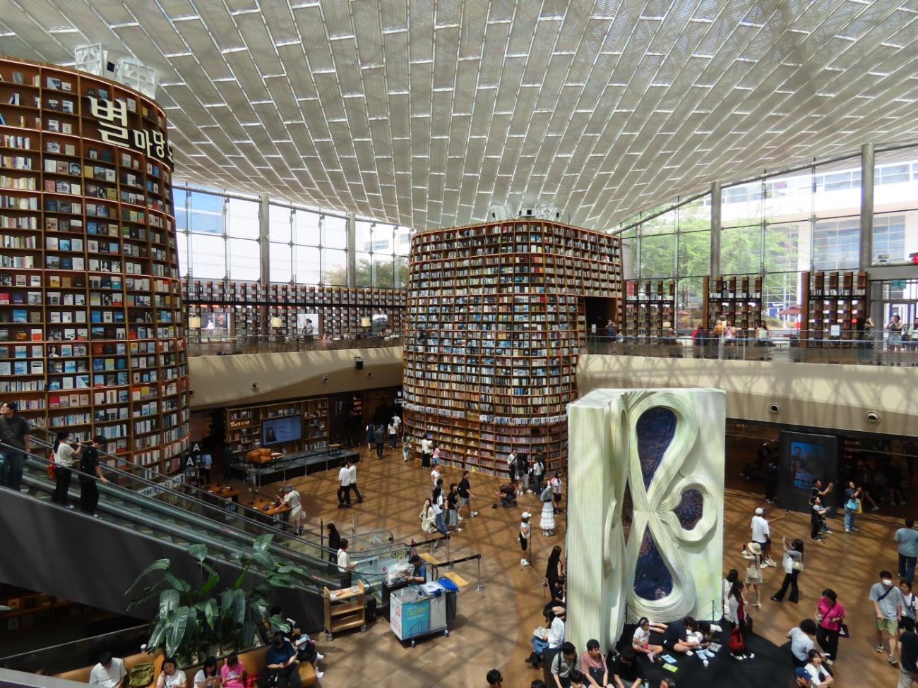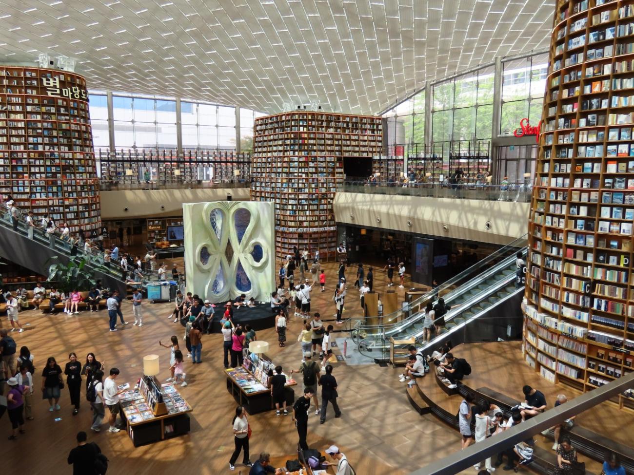 Vi går derefter ind i indkøbscenteret Coex og nyder, at der er aircondition. Centeret er især kendt for det flotte Starfield-bibliotek. På et tidspunkt gik det ret skidt med at få kunder i centeret, og man fandt derfor på at indrette et bibliotek, som fik rigtig meget medieomtale. Det hjalp, og i dag er centeret velbesøgt. Man skal ikke registreres for at låne en bog, og man kan heller ikke få hjælp af en bibliotekar; reglen er, at man må låne de bøger, man selv kan nå. Der sidder flere og læser rundt omkring.