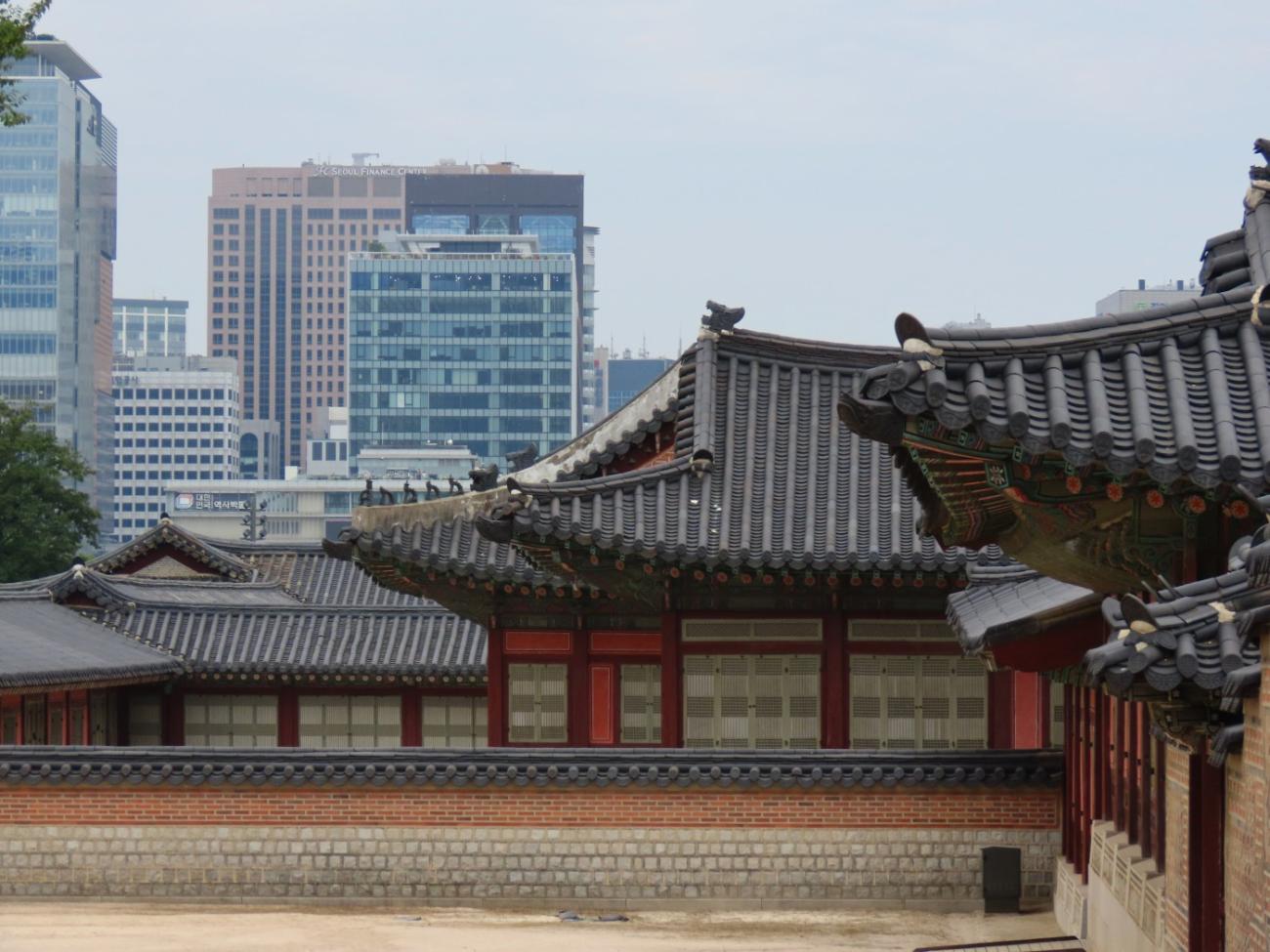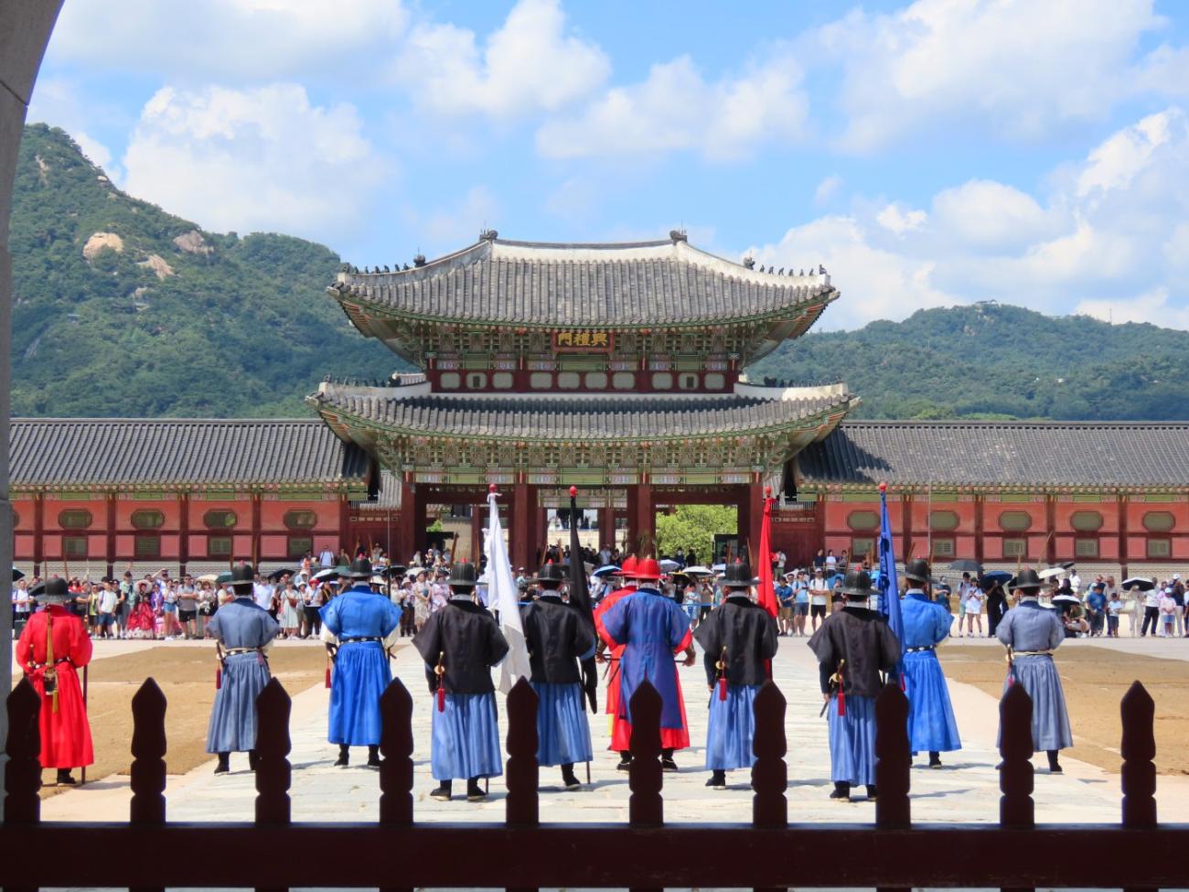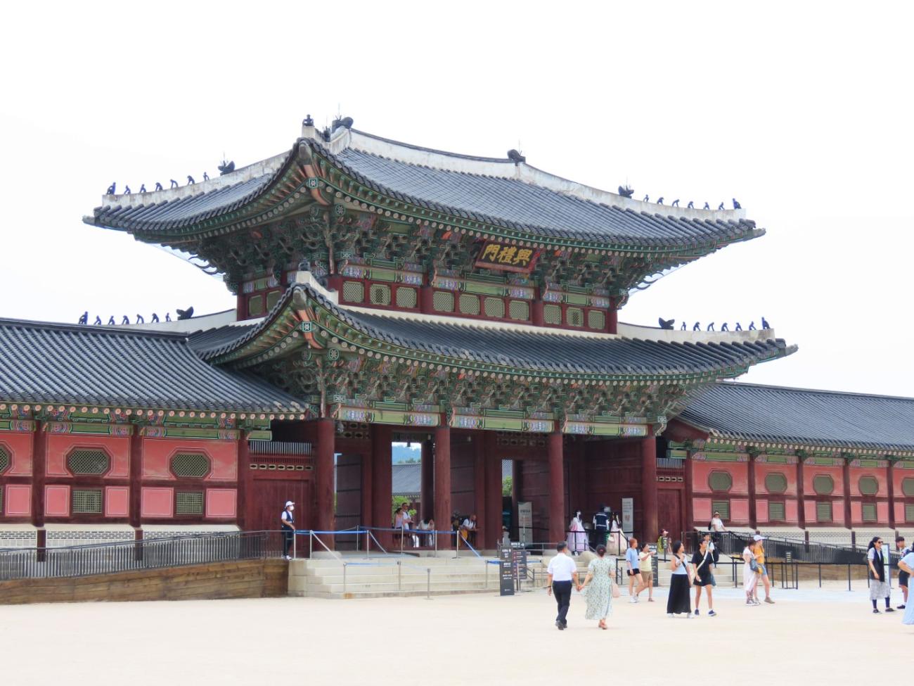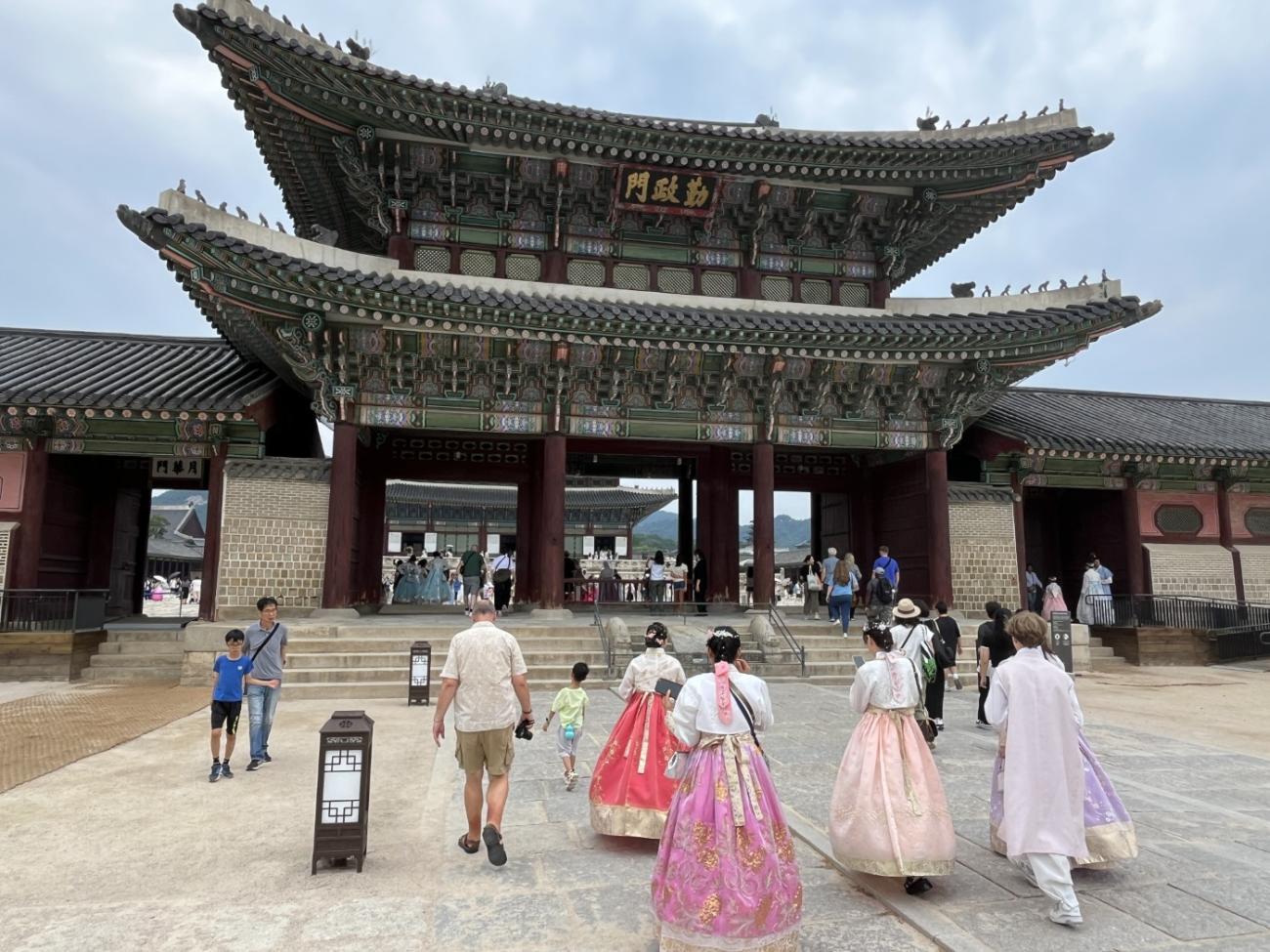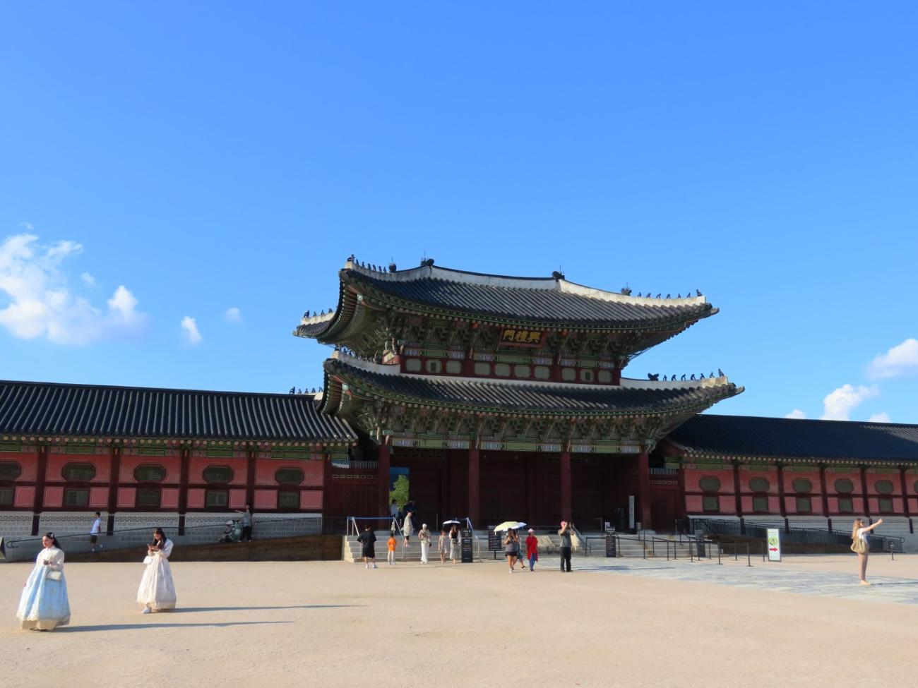 Allerede om søndagen, tre dage efter vi er kommet til Seoul, besøger vi Gyeongbokgung-paladset, der ligger tæt på vores lejlighed. Det blev oprindeligt bygget i 1395 og var det kongelige palads for Joseon-dynastiet, som gjorde Seoul til Koreas hovedstad. Paladset blev brændt ned i 1592 og stod forladt i årevis, og da Japan koloniserede Korea, nedrev de det meste af det, der var tilbage. Stedet er ved at blive genskabt og er i dag et vigtigt vartegn i Korea.