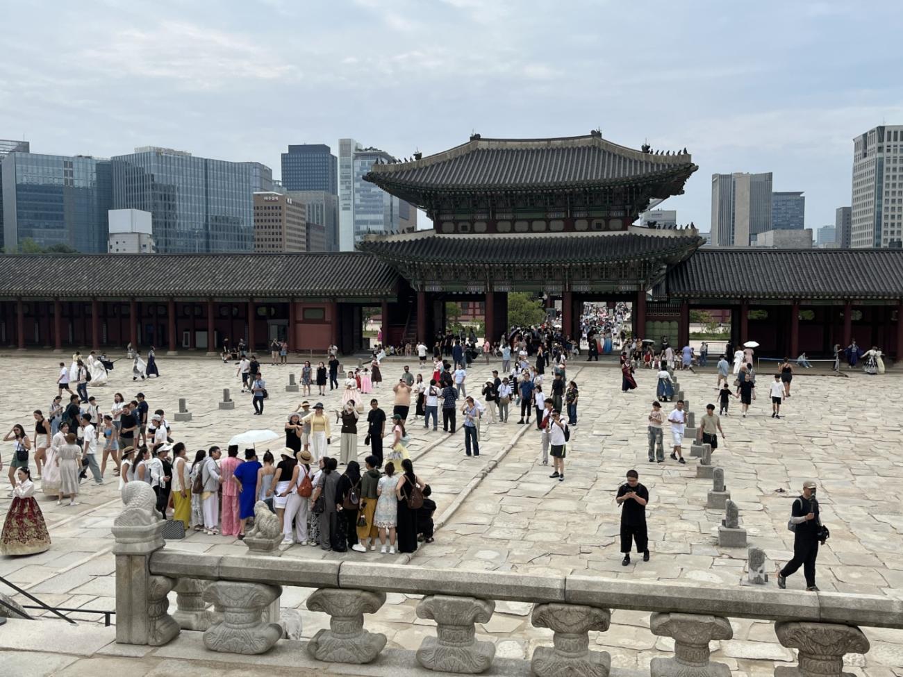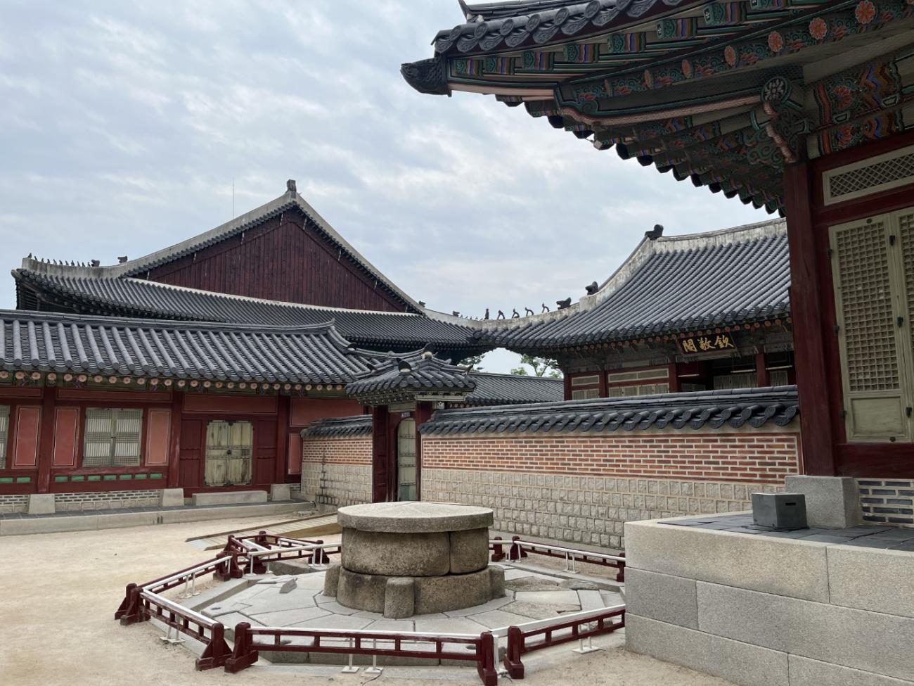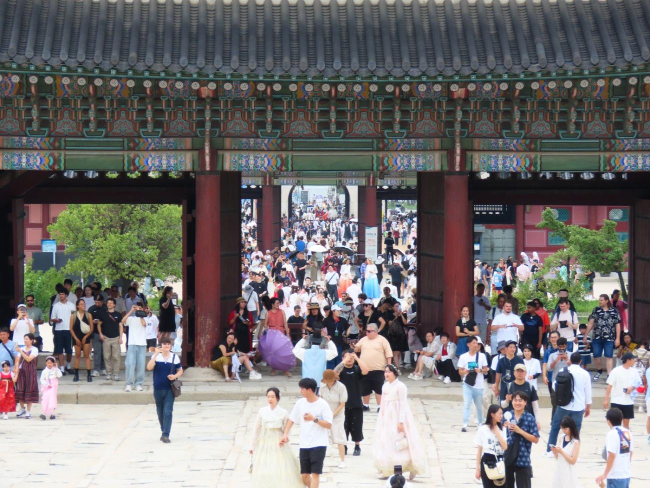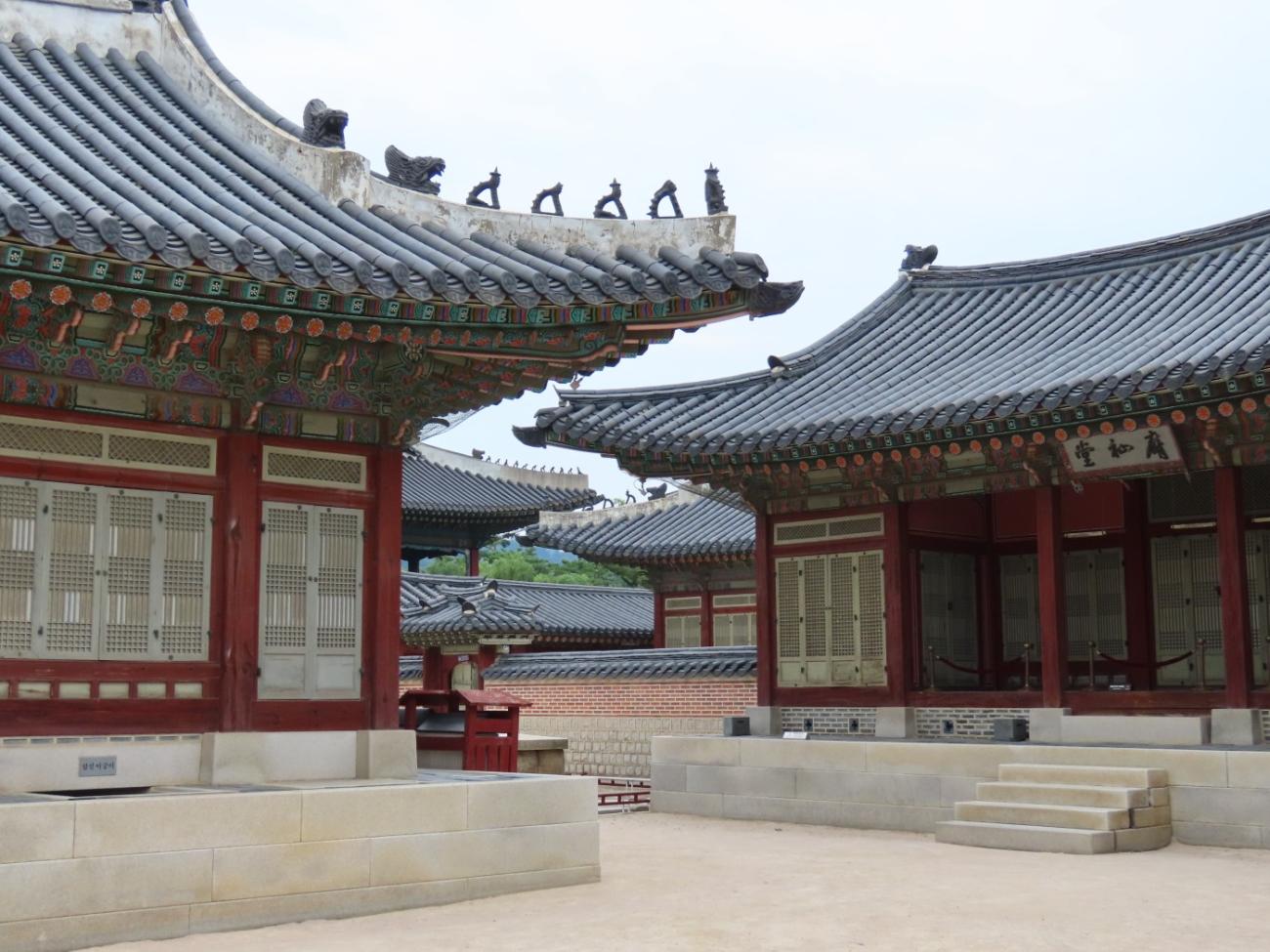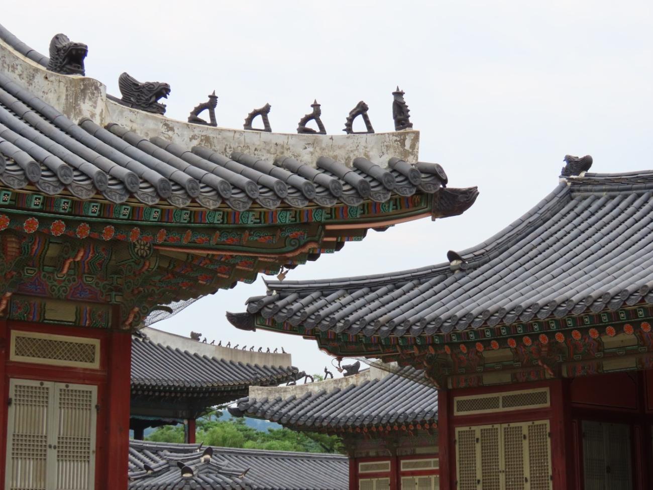 Allerede om søndagen, tre dage efter vi er kommet til Seoul, besøger vi Gyeongbokgung-paladset, der ligger tæt på vores lejlighed. Det blev oprindeligt bygget i 1395 og var det kongelige palads for Joseon-dynastiet, som gjorde Seoul til Koreas hovedstad. Paladset blev brændt ned i 1592 og stod forladt i årevis, og da Japan koloniserede Korea, nedrev de det meste af det, der var tilbage. Stedet er ved at blive genskabt og er i dag et vigtigt vartegn i Korea.
