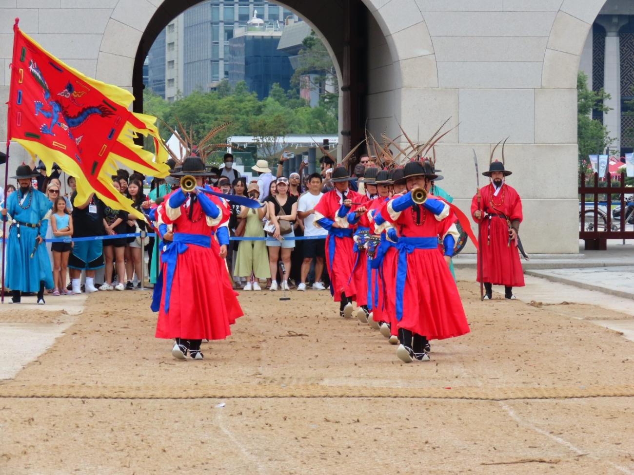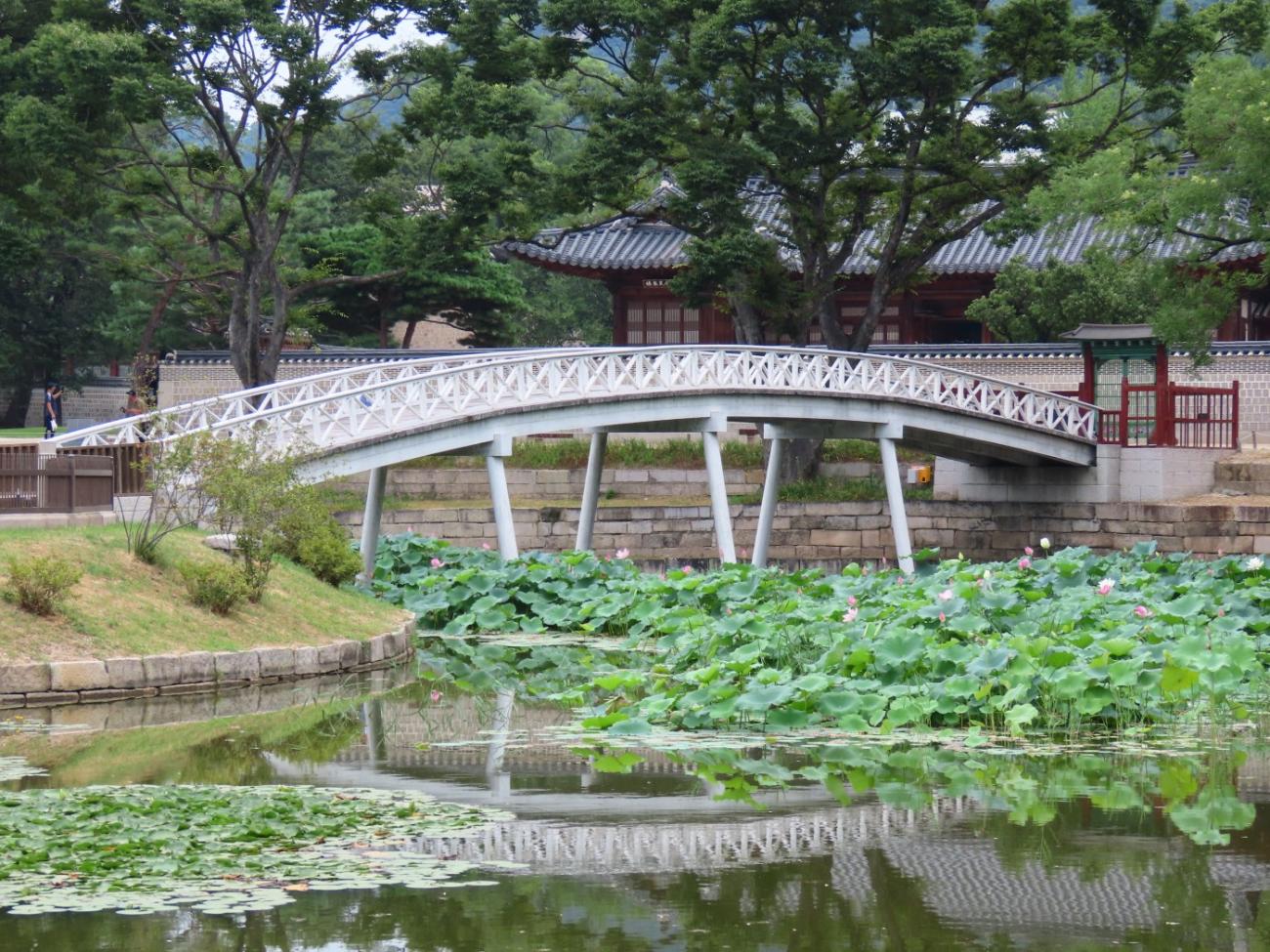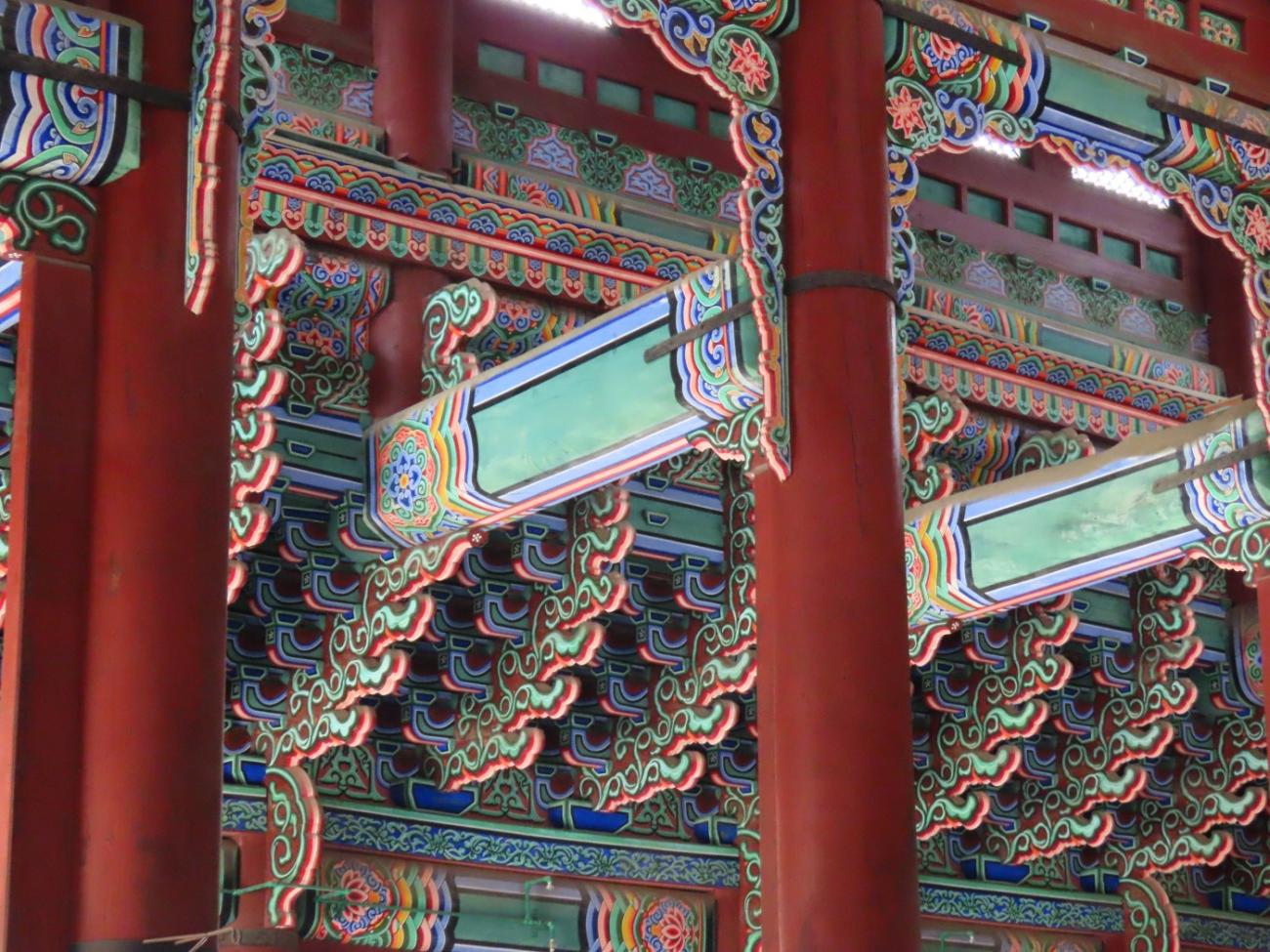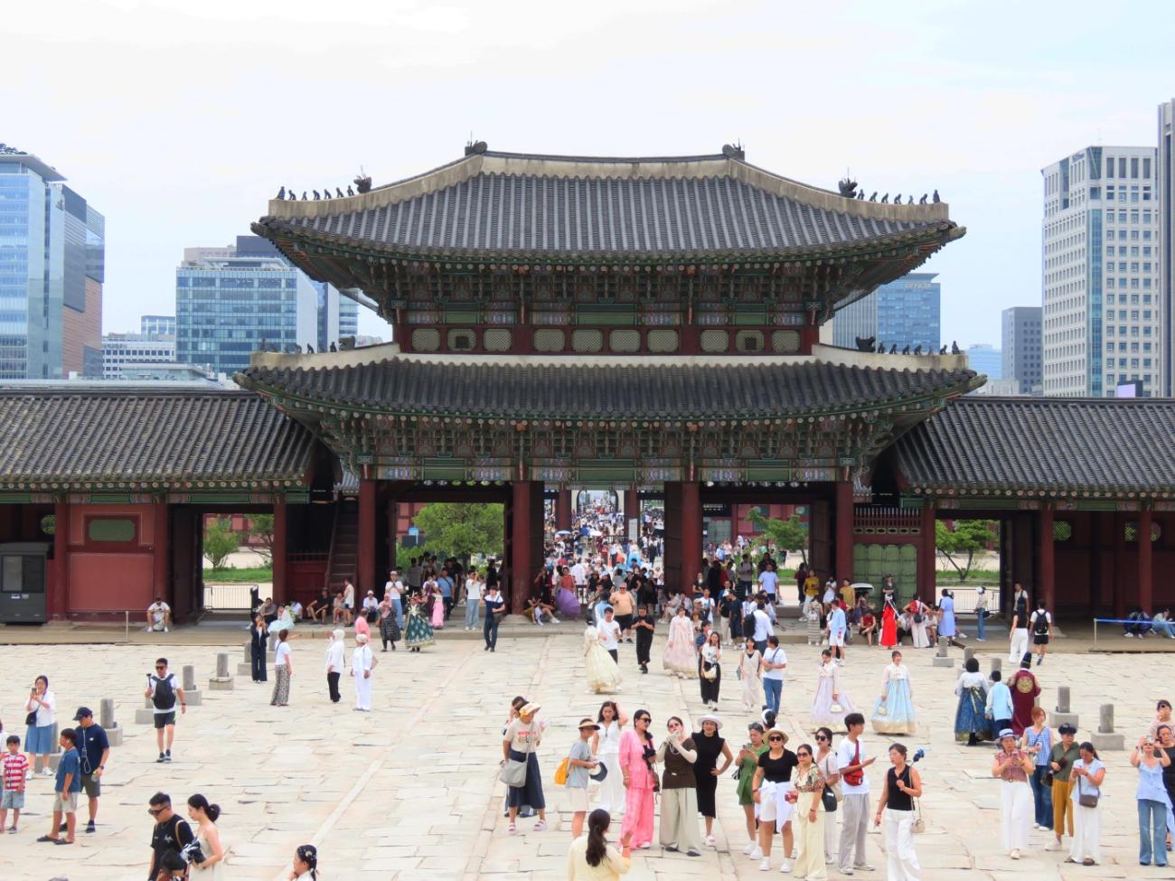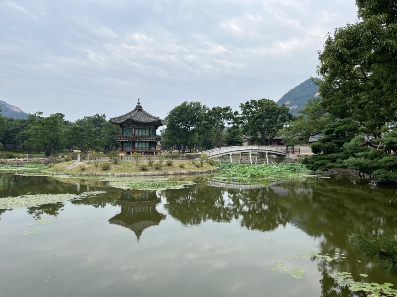 Allerede om søndagen, tre dage efter vi er kommet til Seoul, besøger vi Gyeongbokgung-paladset, der ligger tæt på vores lejlighed. Det blev oprindeligt bygget i 1395 og var det kongelige palads for Joseon-dynastiet, som gjorde Seoul til Koreas hovedstad. Paladset blev brændt ned i 1592 og stod forladt i årevis, og da Japan koloniserede Korea, nedrev de det meste af det, der var tilbage. Stedet er ved at blive genskabt og er i dag et vigtigt vartegn i Korea.