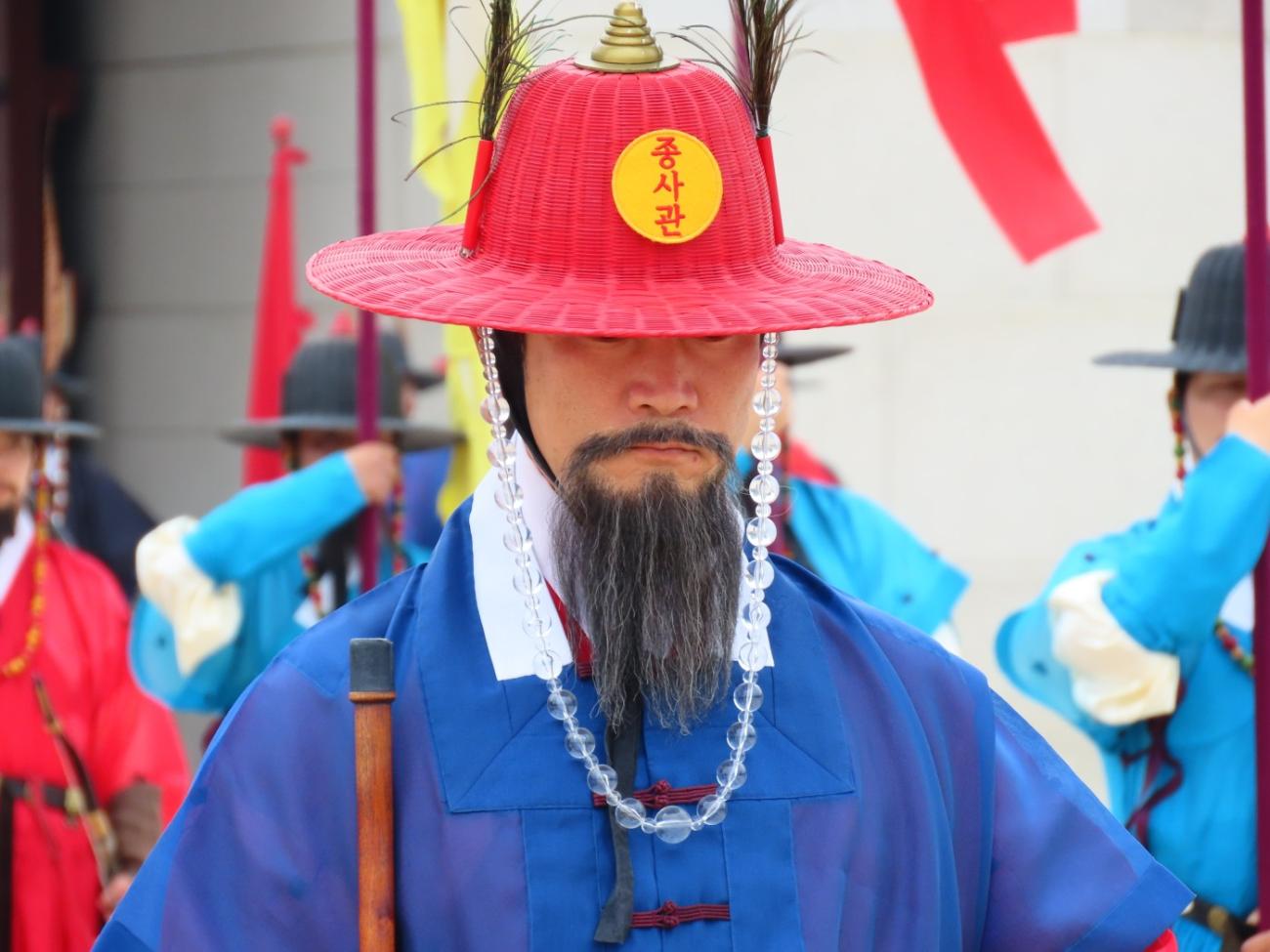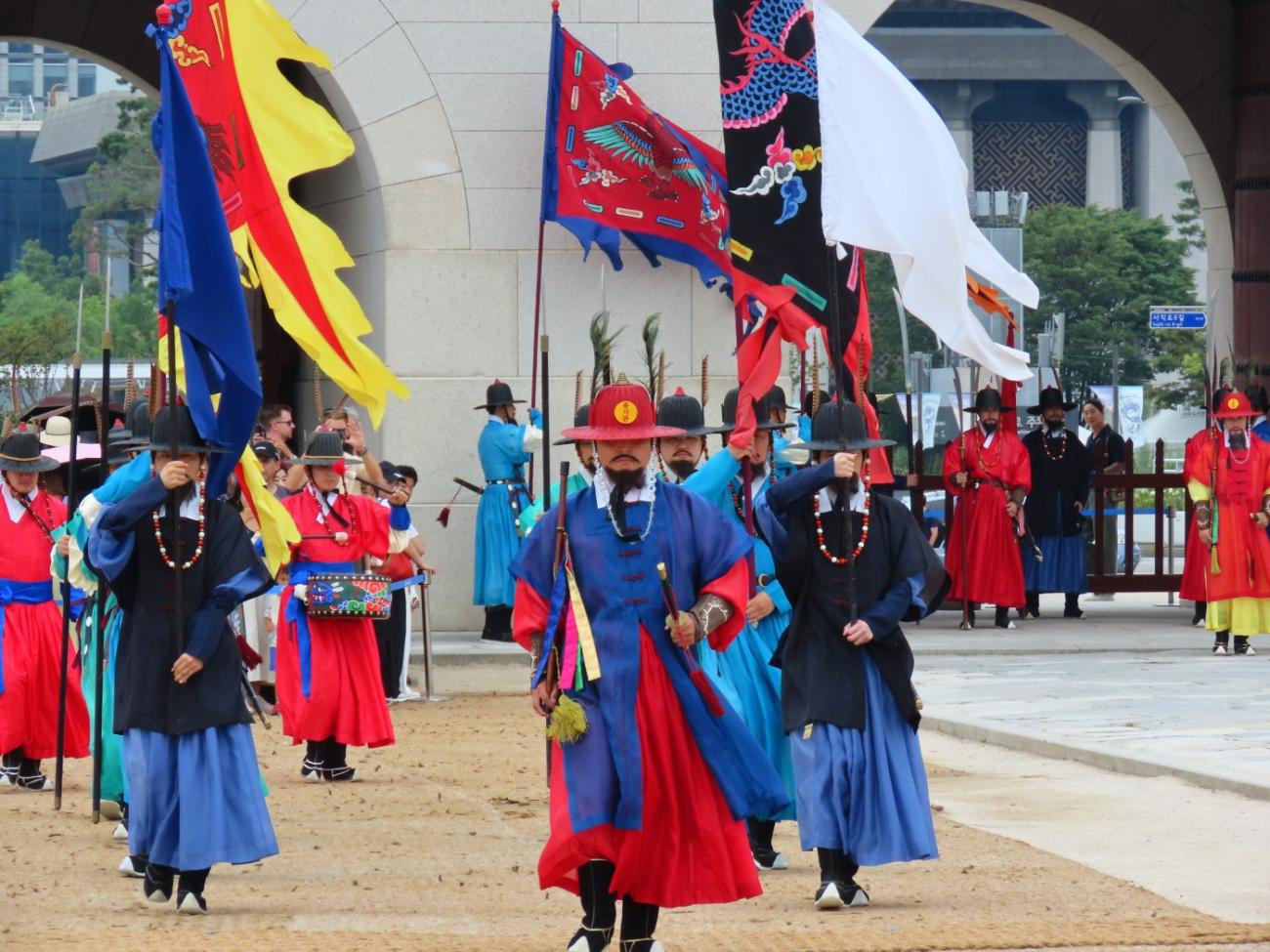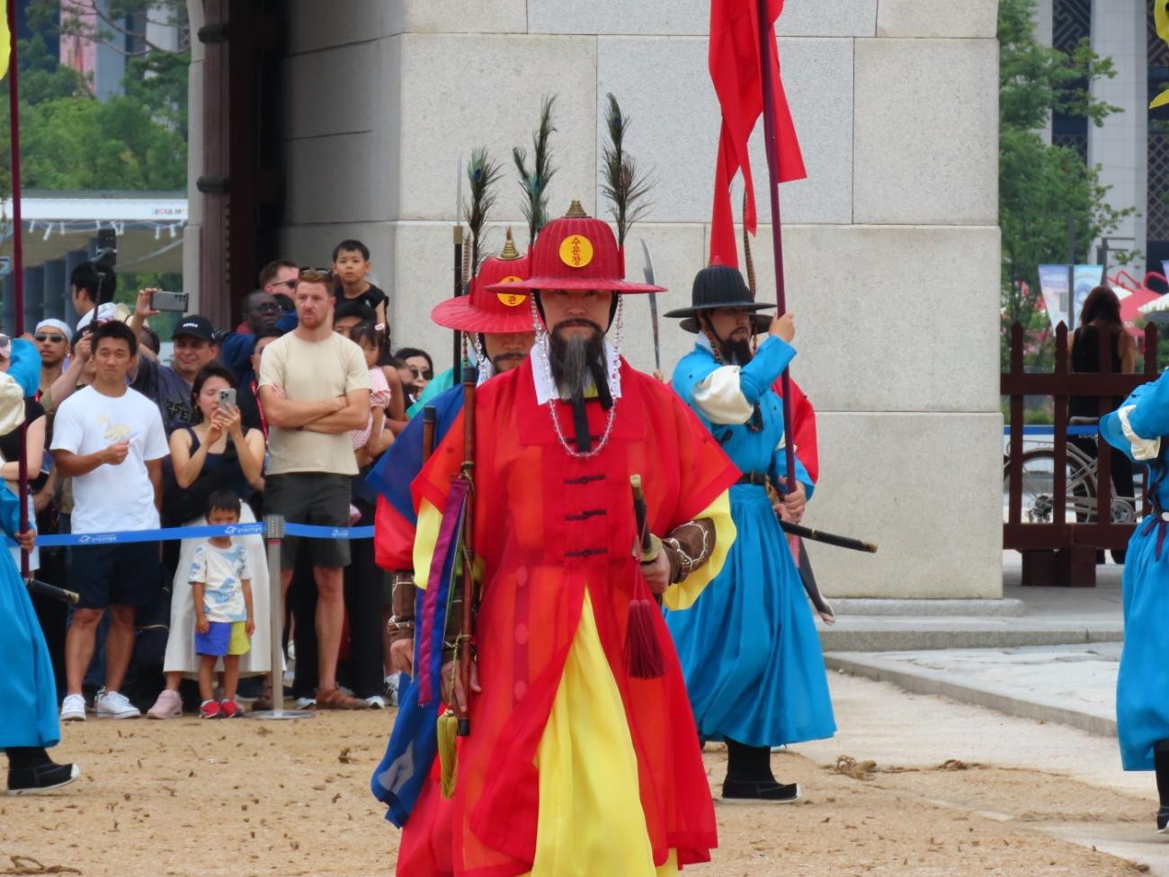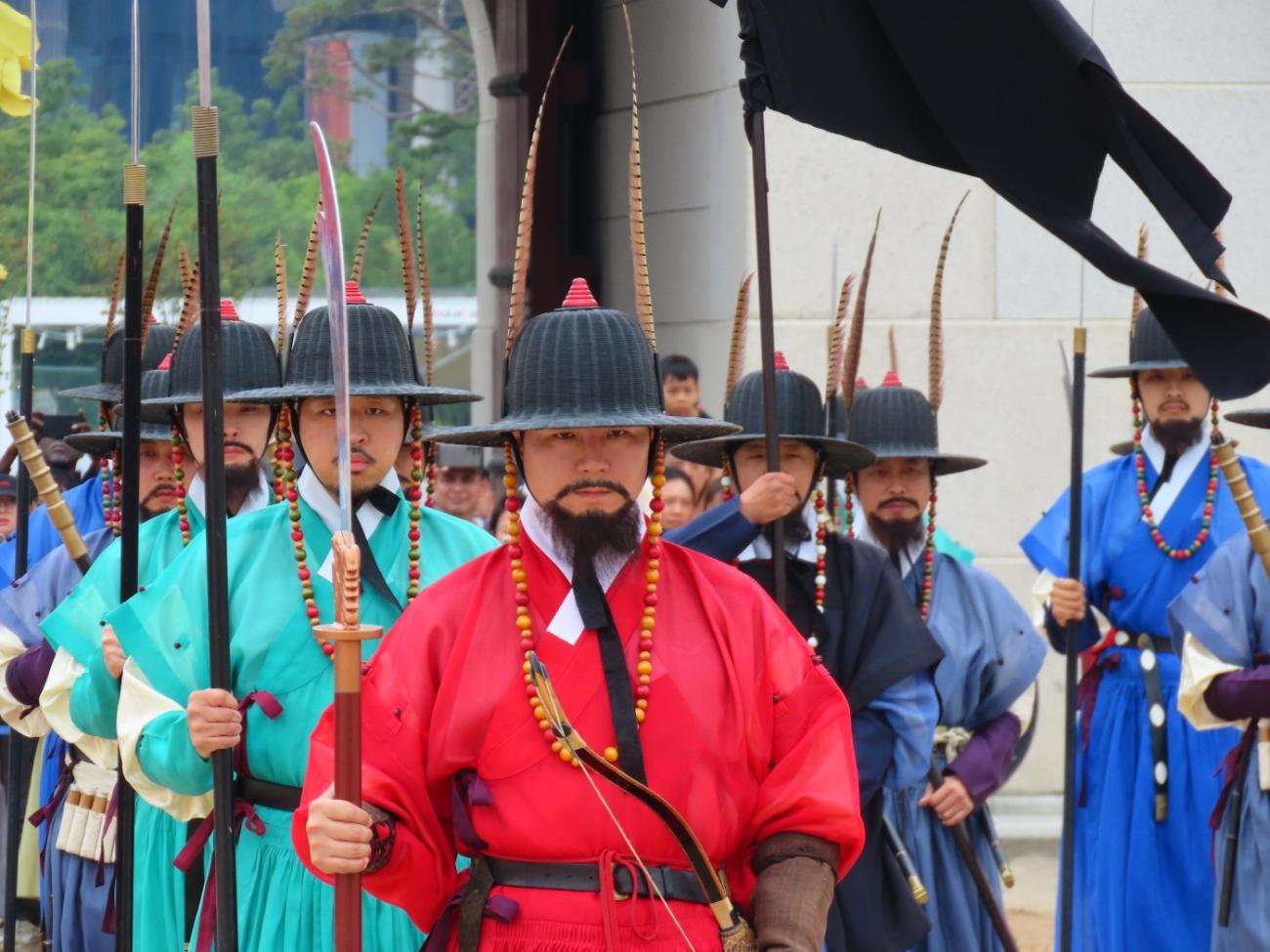 Vi kommer helt tilfældigt lige til vagtskiftet kl. 13, som er en meget farverig oplevelse. Her er rigtig mange mennesker, og en del er klædt i Hanbok, der er den traditionelle koreanske nationaldragt. Der er mange butikker, hvor man kan leje disse dragter, og de ligger ofte tæt på byens paladser, finder vi ud af. Man kommer nemlig gratis ind, hvis man er klædt i Hanbok.