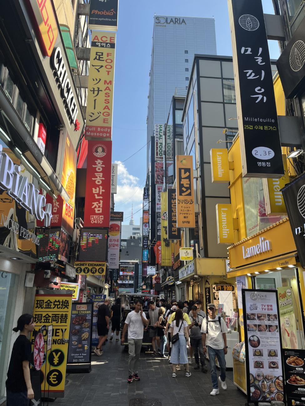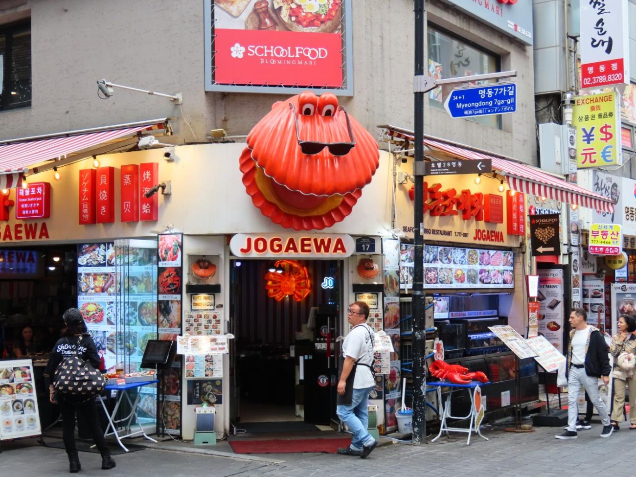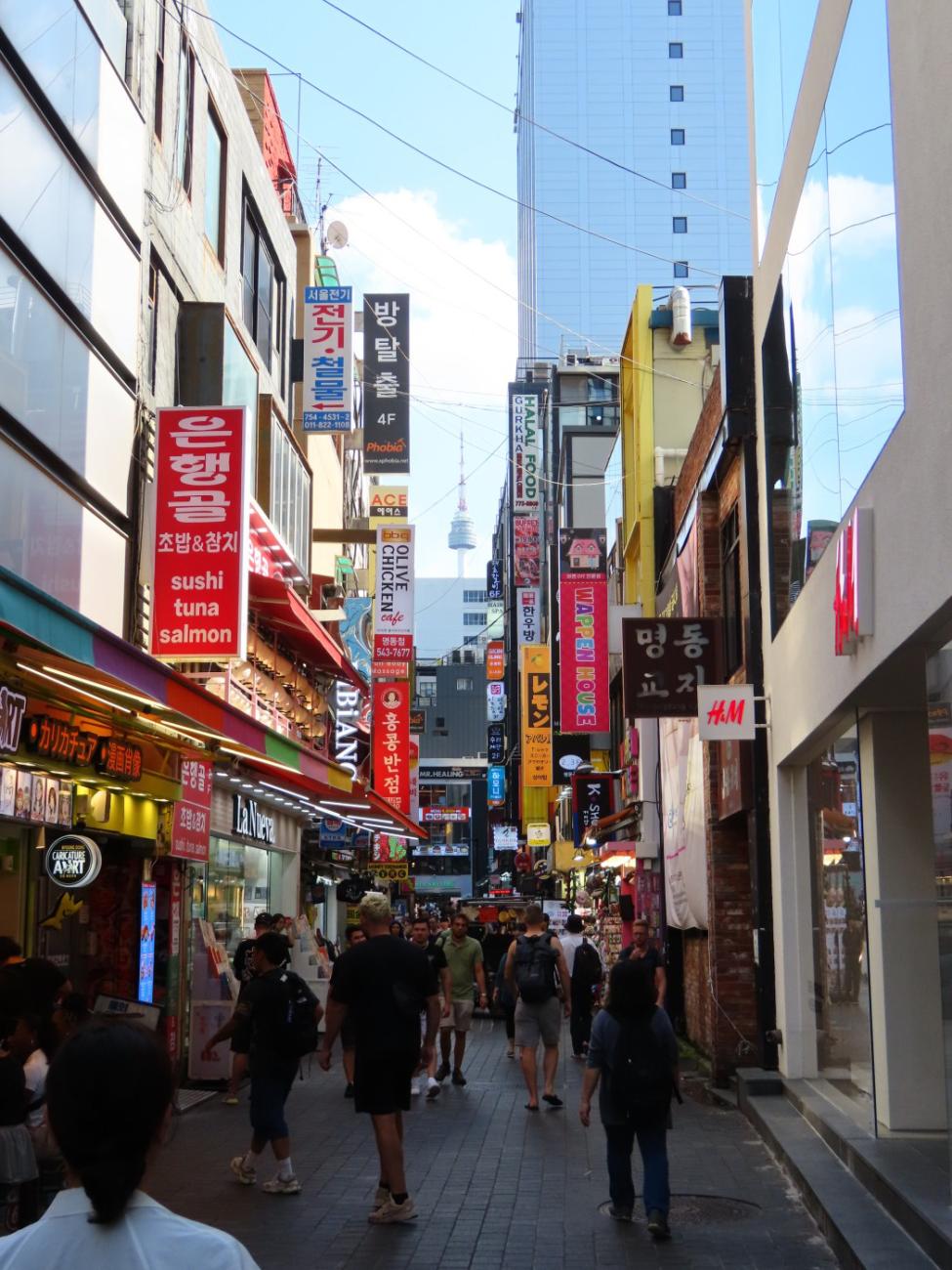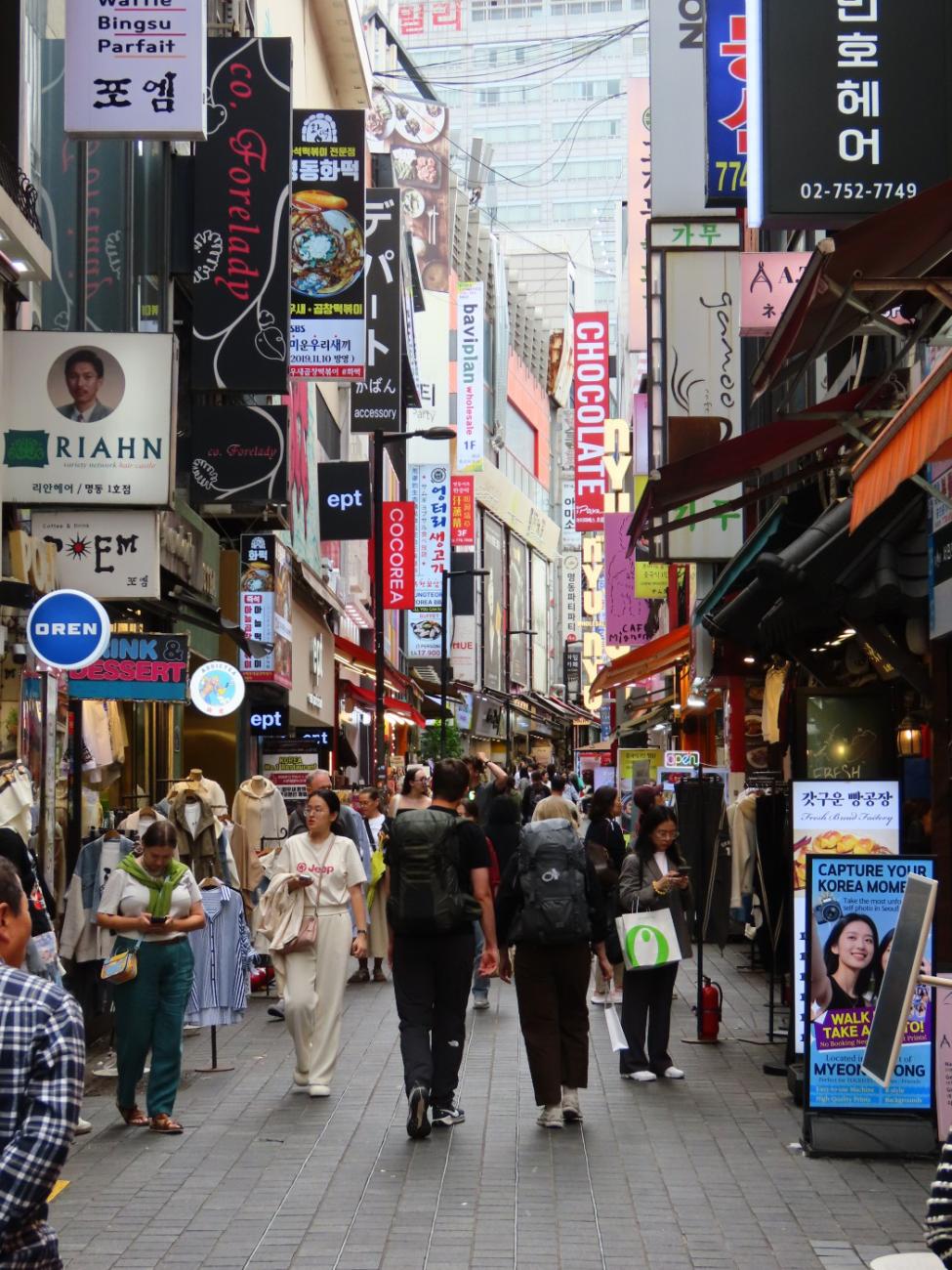 Hvis man går sydpå i forhold til både Bukchon og Ikseondong, kommer man til området Myeongdong. De første gange, vi tager derind, kører vi med metroen, men vi finder efterfølgende ud af, at det både er nemmere og hurtigere at tage en bus, og så slipper vi også for alle trapperne på metrostationerne.