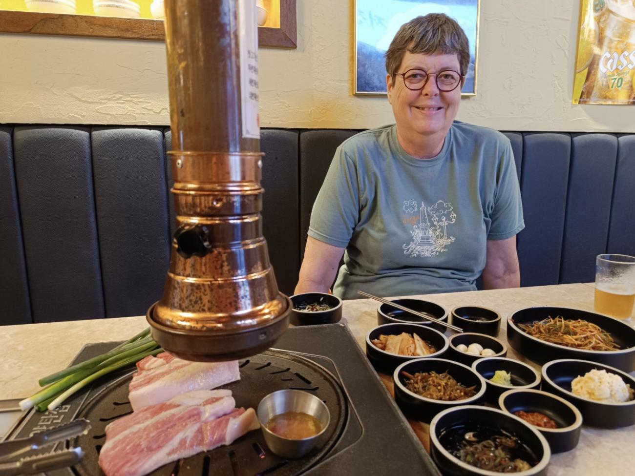 Mange af retterne i det koreanske køkken er krydret med chili, bl.a. kimchi, som er fermenteret kål, og som mange steder serveres som tilbehør. Af den grund er der flere retter, som vi ikke prøver, da Hanne er allergisk over for chili. Vi bliver dog rigtig glade for koreansk barbecue, hvor kødet, der steges nede ved bordet, ikke er krydret; det er mange af de små retter, der serveres til, derimod.