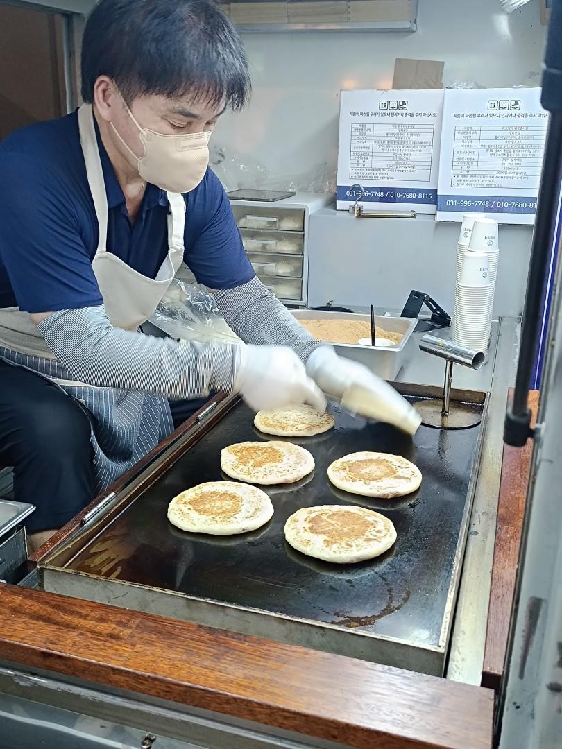 Vi prøver flere koreanske desserter, bl.a. bingsu, der er høvlet is, og hatteok, der er pandekager med kanelsukker. I weekenden holder der en vogn nede på Jahamun-ro, og her er der kø for at købe disse varme pandekager. Der er også kø foran en butik, der åbner, mens vi bor her; her sælges “salt bread”, en anden koreansk specialitet, men dem får vi nu bedre i en butik i en af gågaderne. Japanske soufflé-pandekager er også populære, og de serveres ofte med is og karamelliserede bananer.