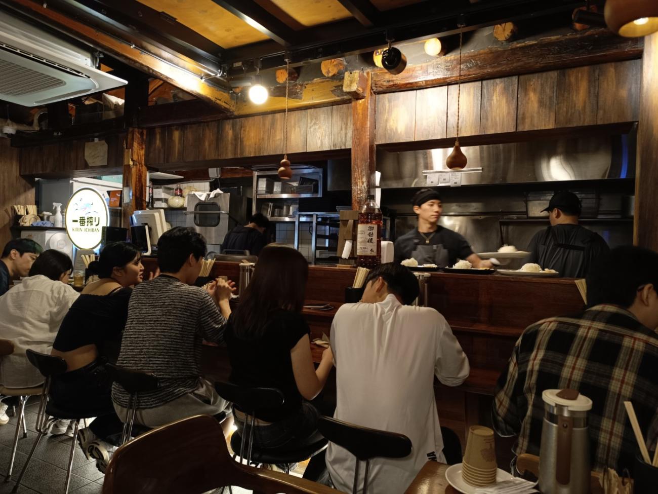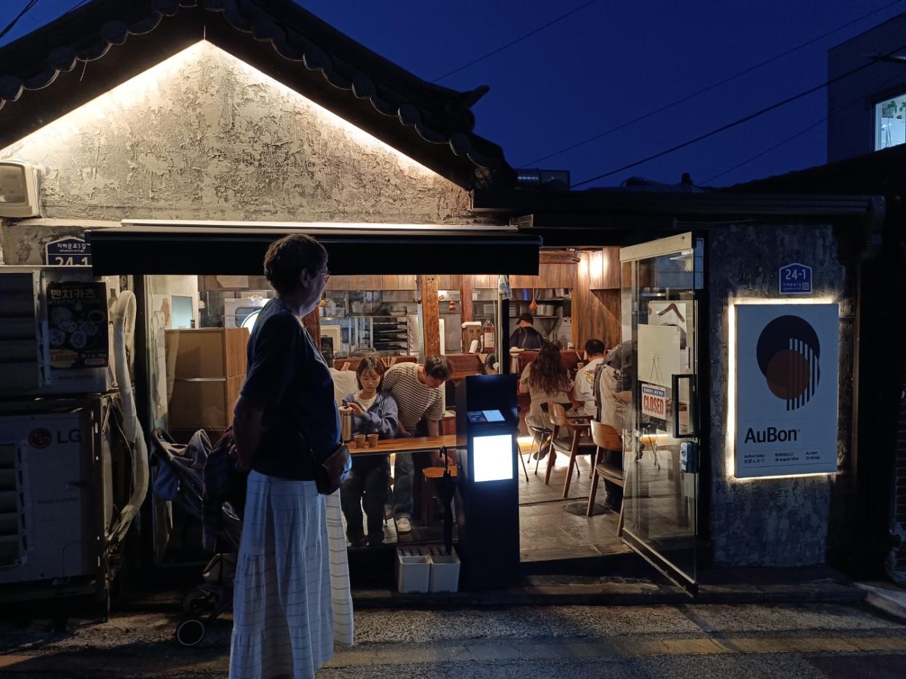 Restauranten er meget lille med kun to borde, et par pladser i vinduet og en bardisk hen langs køkkenet, så man skal helst komme omkring kl. 18.30, hvis man vil være sikker på et bord. Vi må kun vente kort tid en enkelt gang ude på gaden. Vi oplever derimod et par gange, at de sætter lukket-skiltet på døren, efter vi er kommet, da de ikke har mere kød.