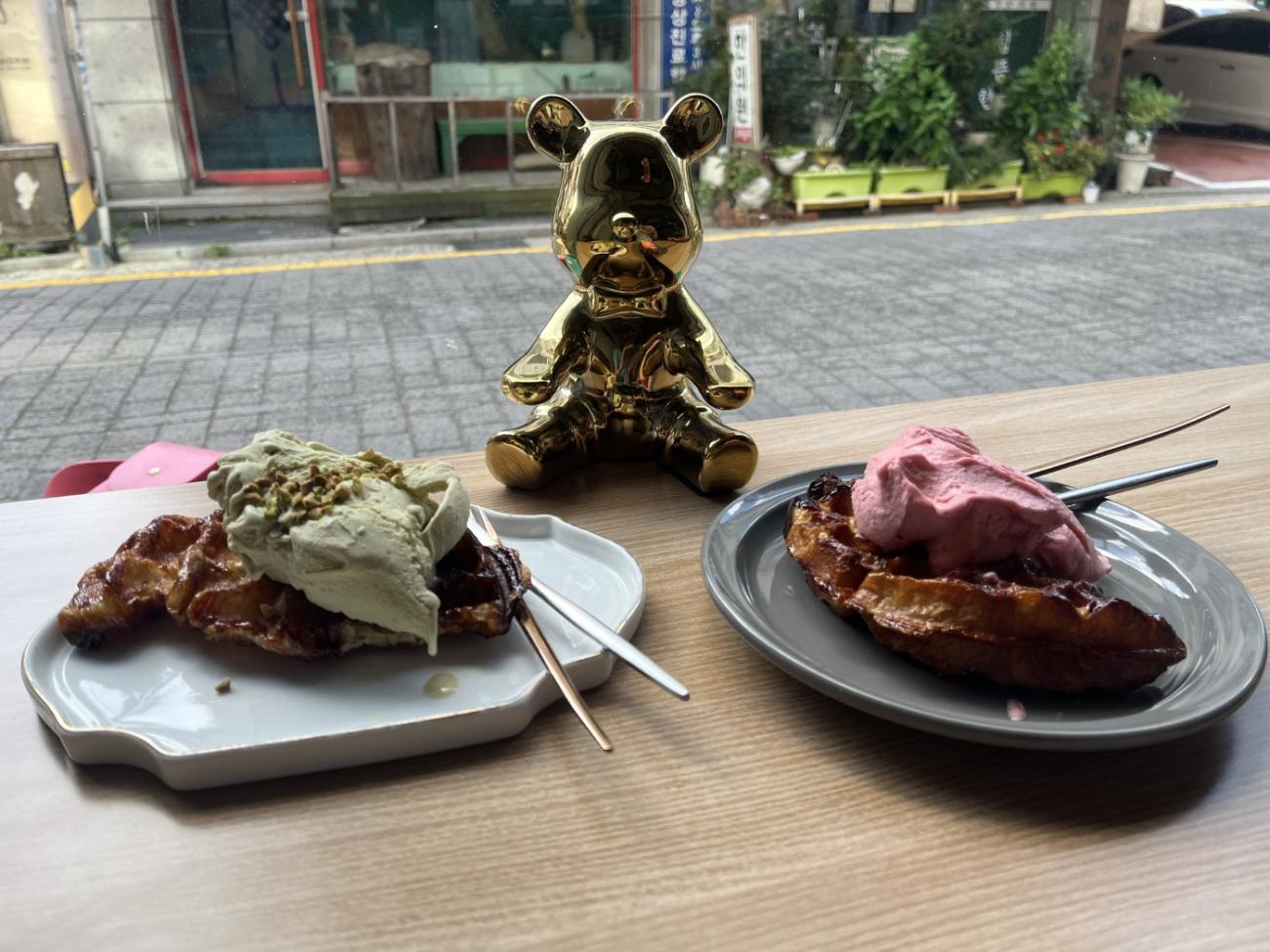 Caféen Langsom ligger på Insadong Culture Street, og her får vi bl.a. høvlet is, og hos Cafe Onhwa Ikseon i området Ikseondong får vi lækre japanske soufflé-pandekager med karamelliserede bananer.