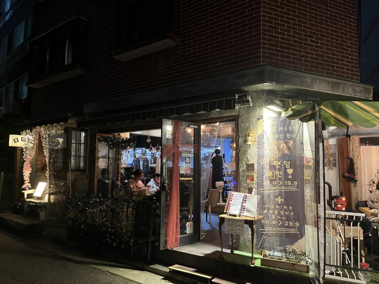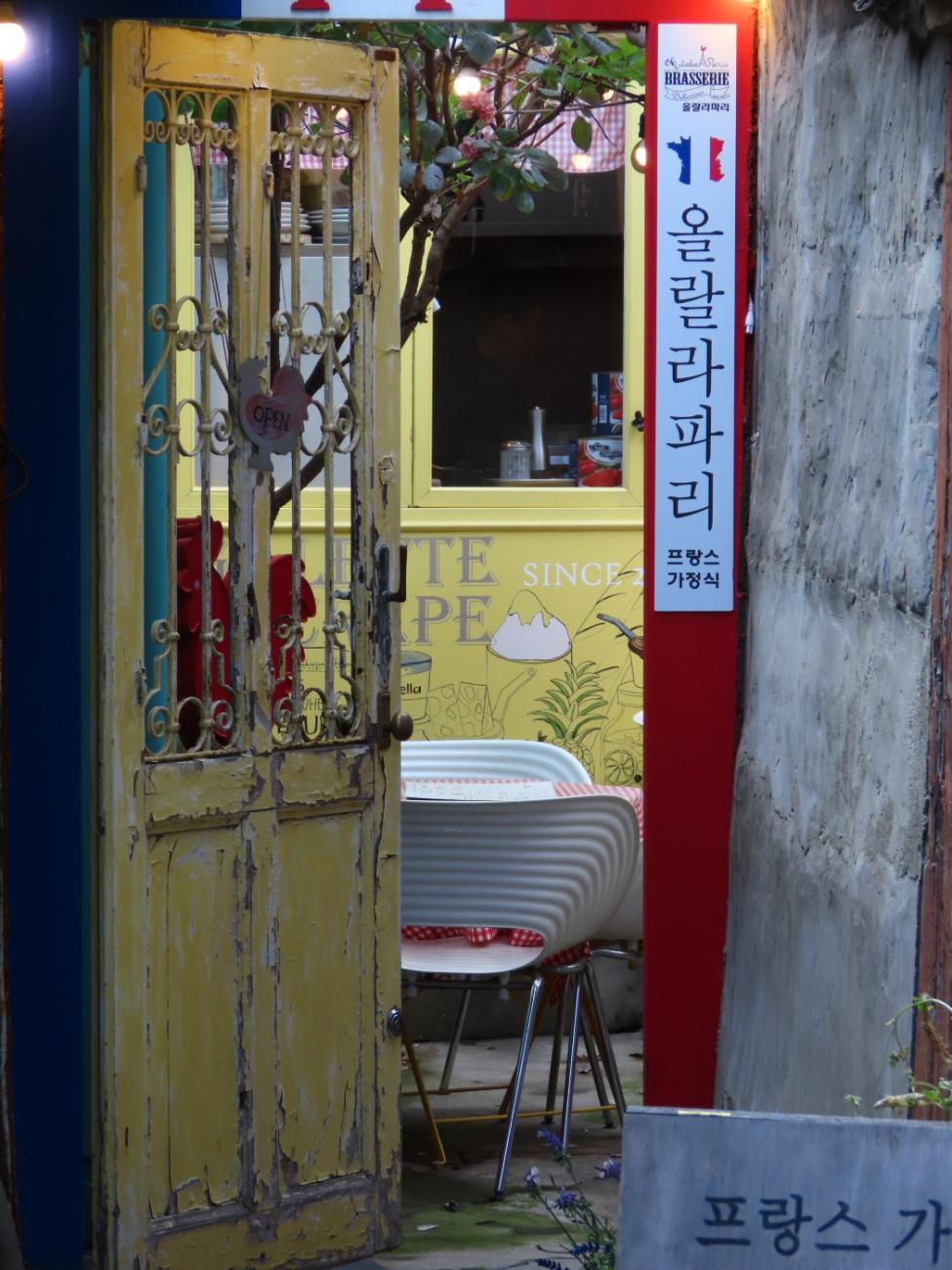 Blumentz er en tysk restaurant, der ligger syd for vores supermarked, og her får vi pølser og øl. De to franske restauranter Restaurant Maison de Paris og Oh La La Paris ligger i de små smøger i området Ikseondong. Vi får moules frites på den første, men nr. 2 er både bedre og hyggeligere.
