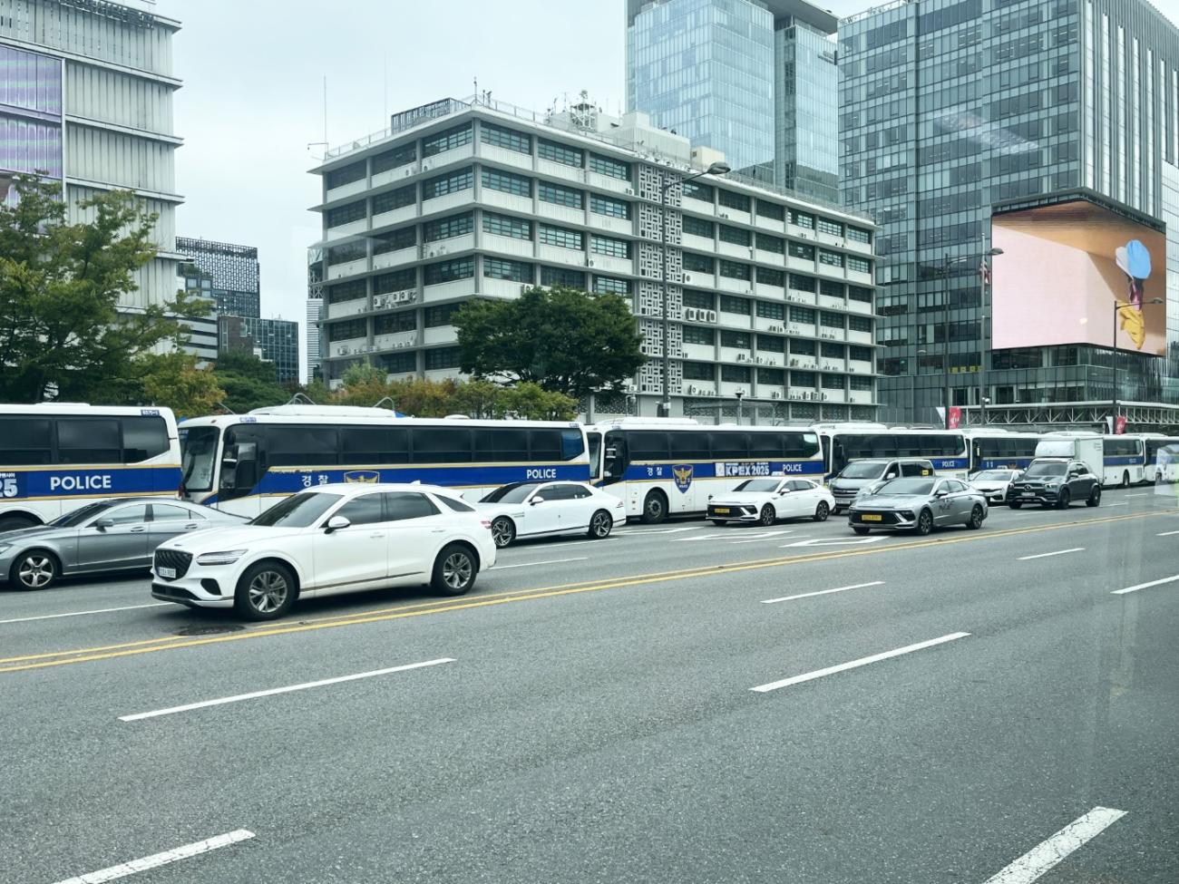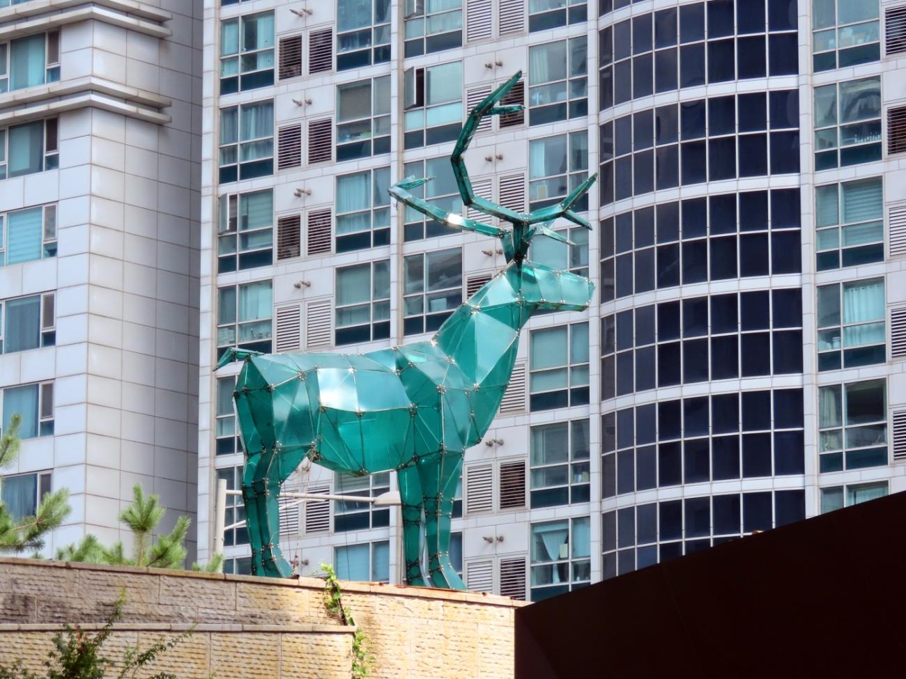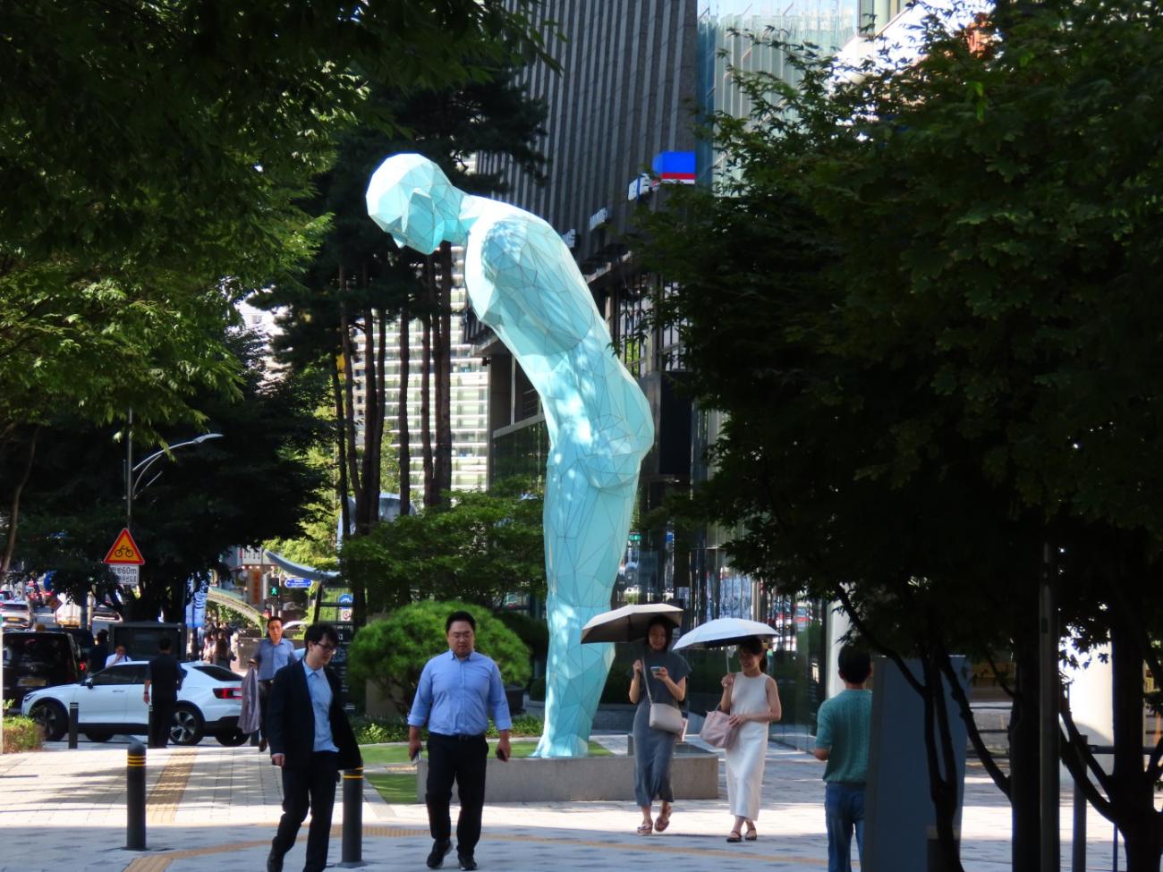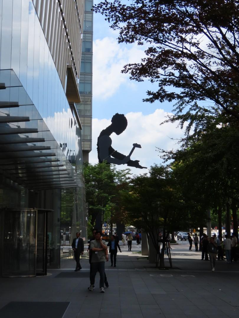 Seoul har alle steder pæne veje og fortove, og alle står pænt og venter, når der er rødt lys, uanset trafikken. Det er ligesom at være i Danmark igen. Fodgængerovergangene er alle steder delt op i to, og der er pile, der viser, hvor man skal gå, når man krydser vejen; det er der nu ikke nogen, der retter sig efter. Der er mange sjove figurer og skulpturer i gadebilledet, og vi får at vide, at det på et tidspunkt blev lovbefalet at opføre en skulptur, når man opfører en ny bygning.