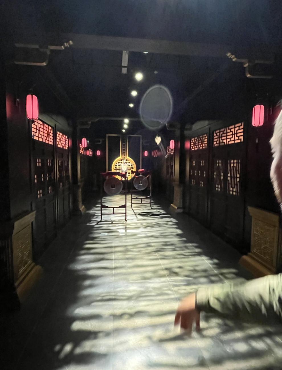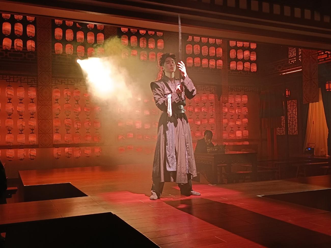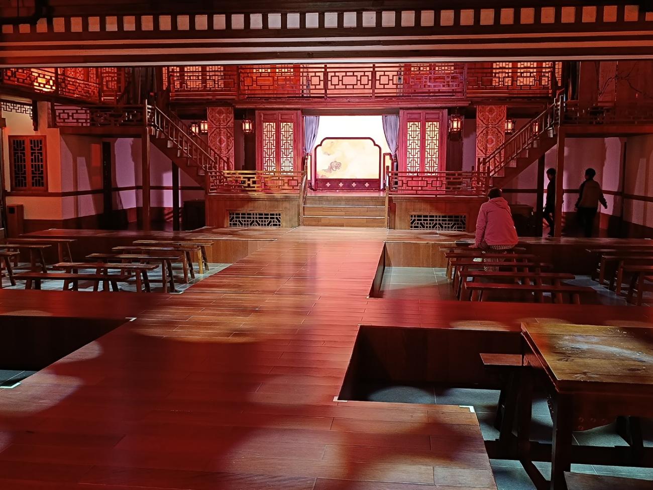 Vi kommer op i teatersalen igen, og forestillingen begynder; der er meget få tilskuere, men vi er heldigvis ikke helt alene. Alt foregår på kinesisk, men vi forstår dog så meget, at det handler om Suzhous historie. Der er sværdkampe, historier om byens håndværkere, kærlighedshistorier og fortællinger om byens berømte skole, hvor der blev undervist i digtning, dans og andre kunstarter. Vi synes alt i alt, at det er en rigtig god og meget anderledes oplevelse, og er glade for, at vi købte billetter.
