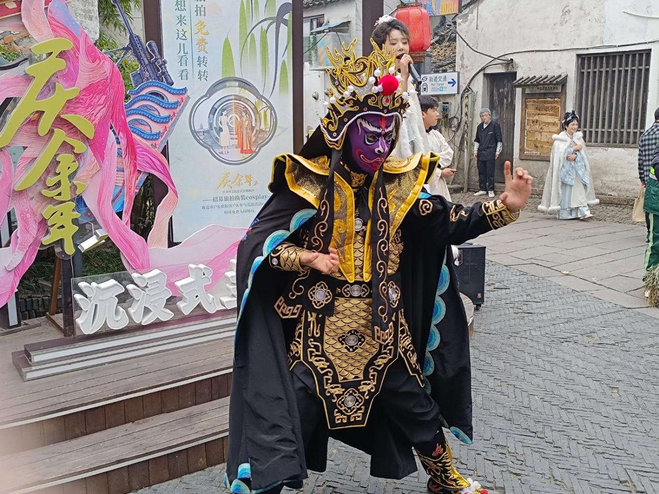 Hanne har læst, at Suzhou skulle være kendt for en speciel type opera, og ifølge Google skulle der ligge et billetkontor i Pingjiang Road, hvor man kan købe billetter til en forestilling. Vi går lidt frem og tilbage på den nævnte adresse nogle gange uden at finde noget kontor, men til gengæld er der en lille teatertrup i gaden, der reklamerer for en forestilling af en art, og vi beslutter os for at følge efter dem, da de sikkert holder til i et teater. De taler dog ikke engelsk, og vi er ret sikre på, at det ikke er den forestilling, vi er ude efter, men vi køber alligevel billetter til en forestilling ugen efter. Det er meget svært at forklare dem, at vi ikke vil i teatret med det samme, men det lykkes til sidst.