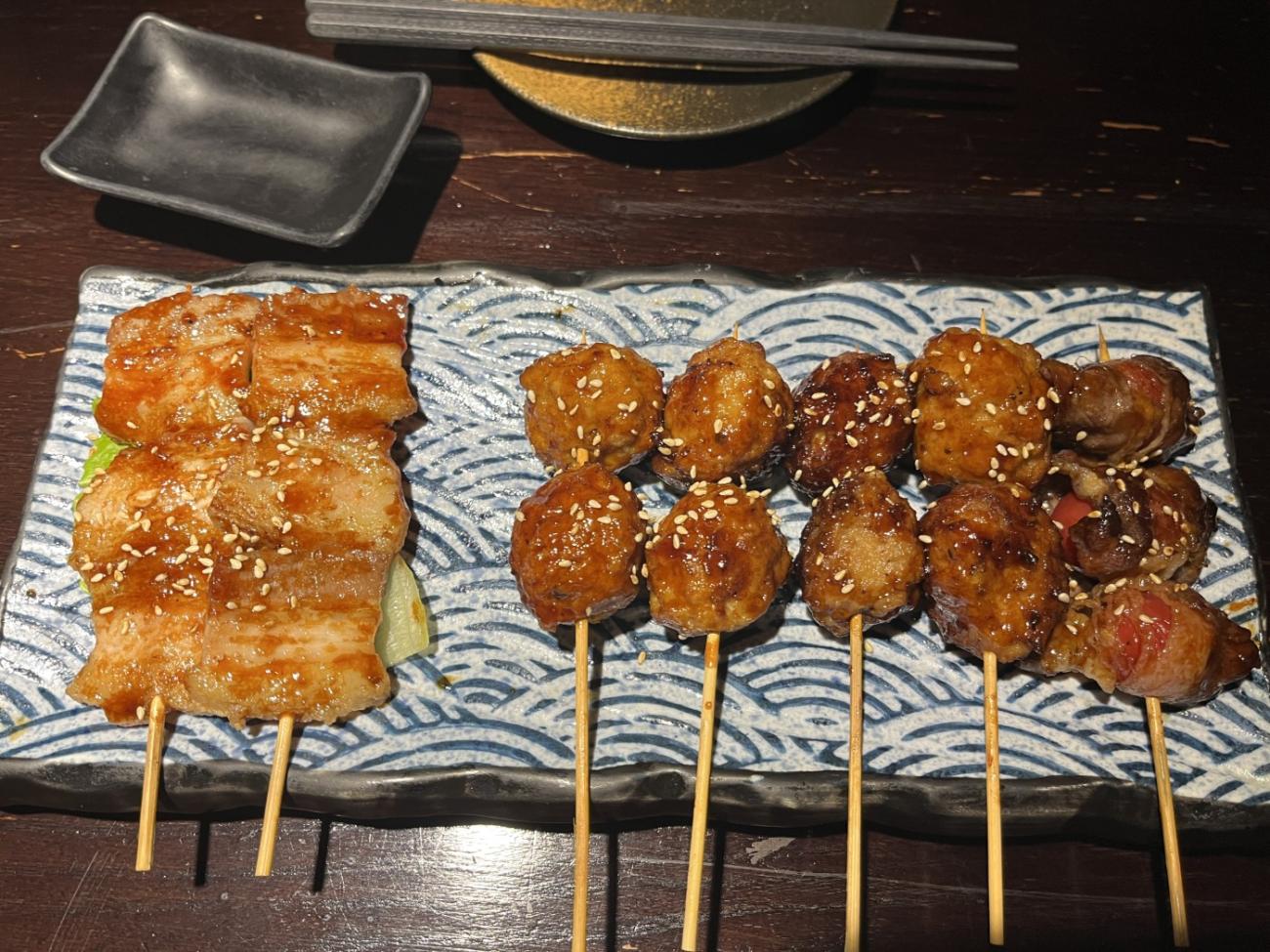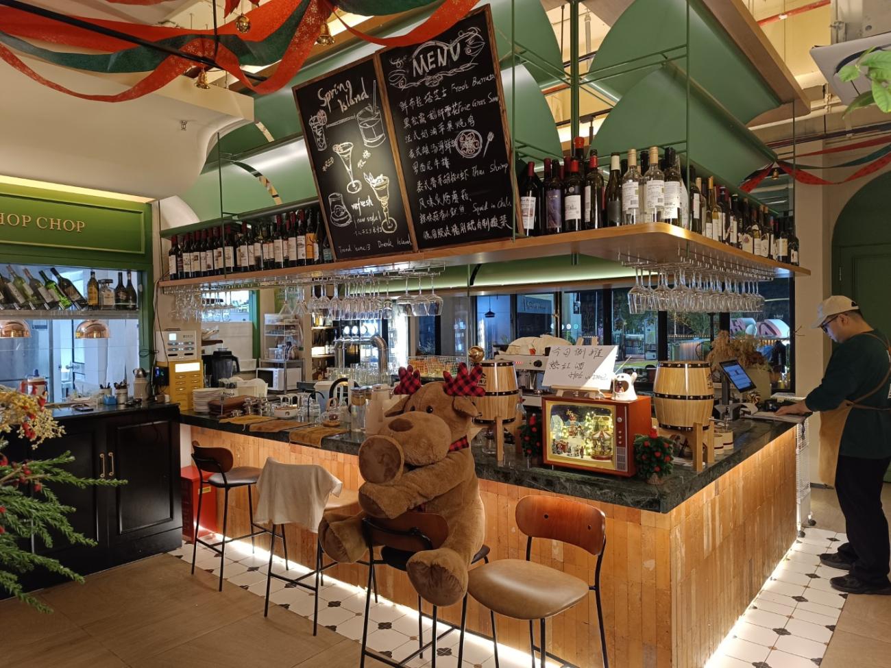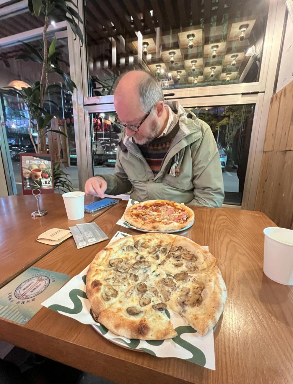Den lille japanske restaurant Kizuna ligger på det lille torv lige ved siden af hotellet. Her kommer vi flere gange og får både sticks og sushi med den japanske øl Asahi til. Det er et hyggeligt, men også lidt pudsigt sted, hvor man desværre må ryge. Chop Chop Bistro ligger på butikstorvet We Walk oppe ad en trappe, og de har ret god mad, bl.a. en charcuteritallerken, selvom de sparer lidt for meget på saltet i de andre retter. De har også en god hvedeøl på fad. Wava Pizza ligger også på We Walk, og de har udmærkede pizzaer, men her kan være temmelig koldt. De taler ikke engelsk, og første gang vi kommer, ligner den kvindelige ekspedient en, der er ved at gå i panik, men da vi efterfølgende kommer igen, er hun et stort smil. Blue Marlin Bar & Restaurant ligger oppe på Suhui Road og er en tyskinspireret restaurant med egen ølproduktion. Første gang får vi en pølsetallerken og anden gang en steak.