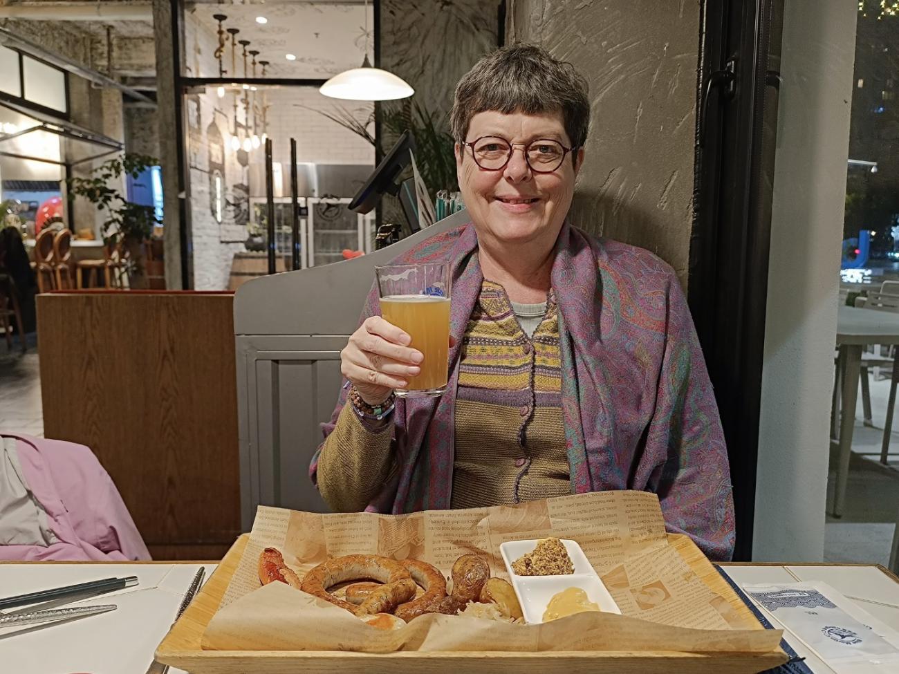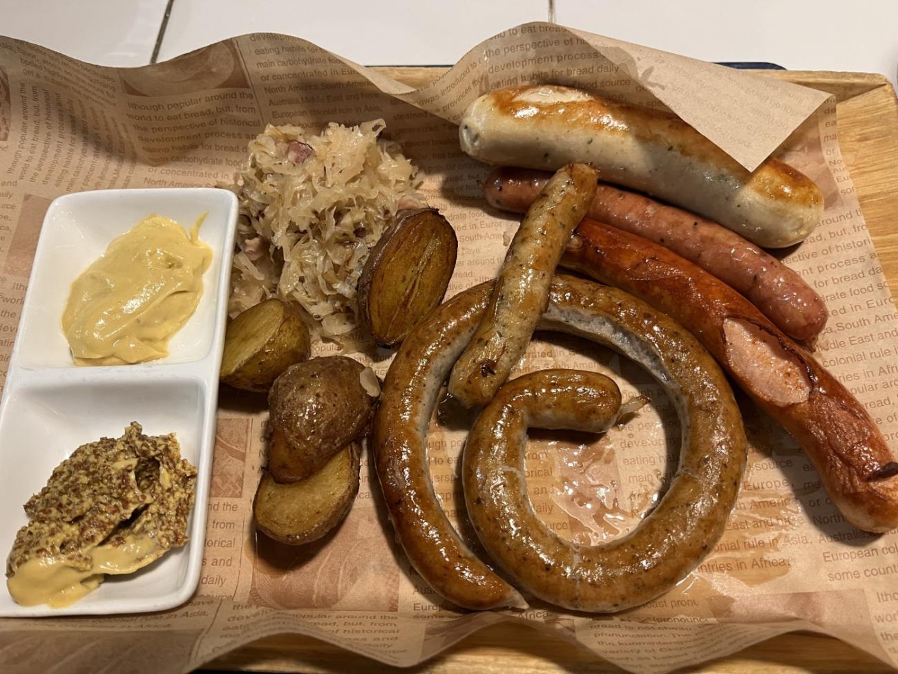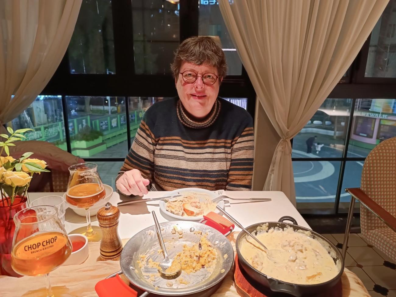 Den lille japanske restaurant Kizuna ligger på det lille torv lige ved siden af hotellet. Her kommer vi flere gange og får både sticks og sushi med den japanske øl Asahi til. Det er et hyggeligt, men også lidt pudsigt sted, hvor man desværre må ryge. Chop Chop Bistro ligger på butikstorvet We Walk oppe ad en trappe, og de har ret god mad, bl.a. en charcuteritallerken, selvom de sparer lidt for meget på saltet i de andre retter. De har også en god hvedeøl på fad. Wava Pizza ligger også på We Walk, og de har udmærkede pizzaer, men her kan være temmelig koldt. De taler ikke engelsk, og første gang vi kommer, ligner den kvindelige ekspedient en, der er ved at gå i panik, men da vi efterfølgende kommer igen, er hun et stort smil. Blue Marlin Bar & Restaurant ligger oppe på Suhui Road og er en tyskinspireret restaurant med egen ølproduktion. Første gang får vi en pølsetallerken og anden gang en steak.