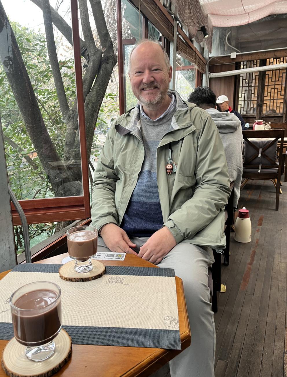 Inde i centrum besøger vi den meget lille café Yu’er Coffee, hvor vi kan sidde ud til vandet ved Pingjiang Road og Momicafe samme sted, men den er lidt kedelig, da vi kommer op på 1. sal. Vi besøger også en café, som ligger helt ud til kanalen, hvor vi får varm kakao, og i området ved Shantang Street i den nordlige del af centrum sidder vi også rigtig godt ud til en lille kanal. I den sydøstligste del af centrum i butikscenteret Renhengcang besøger vi restauranten Fennel & Laurel efter vores teaterbesøg, men vi nøjes nu med kaffe og kage.