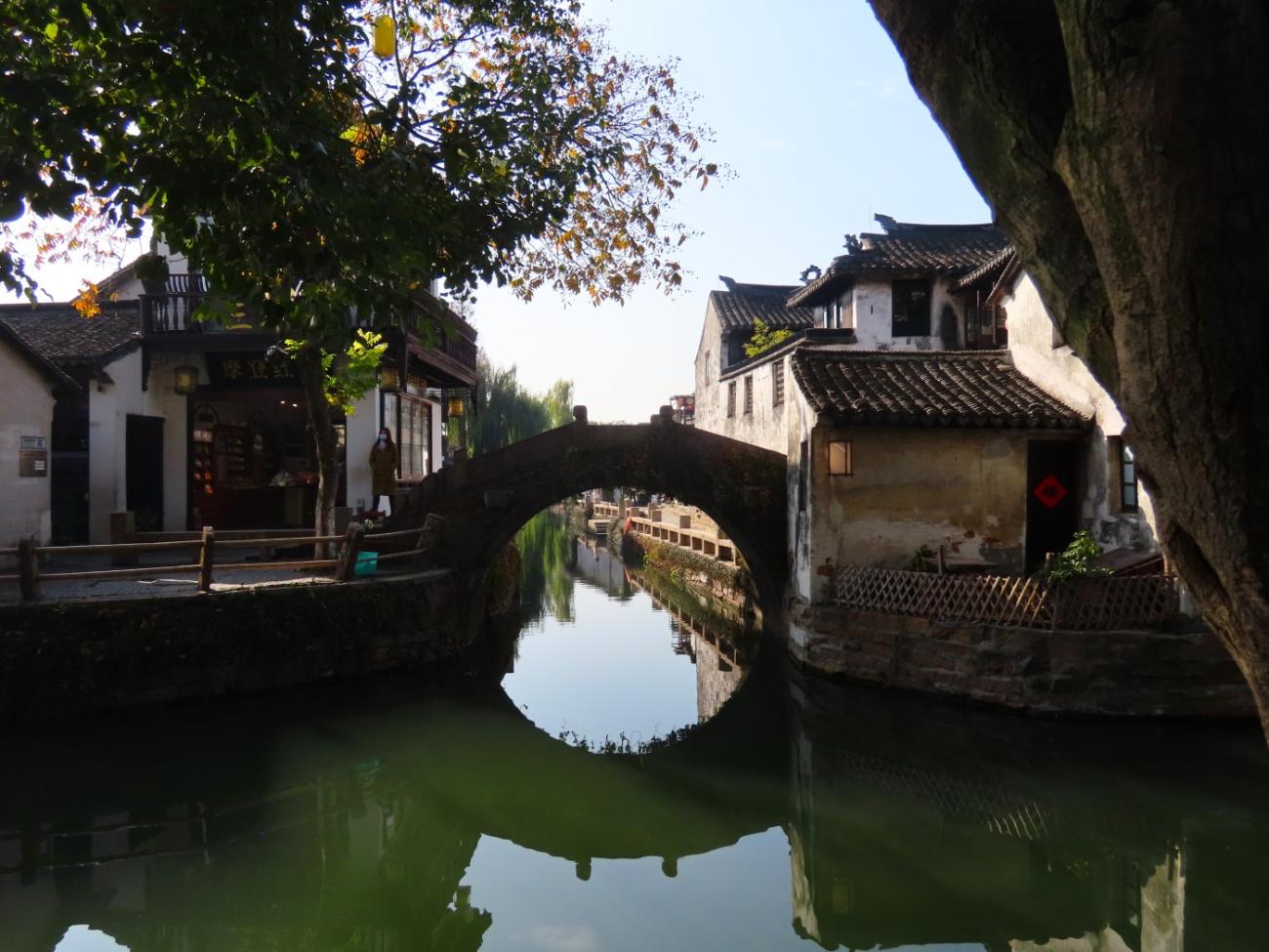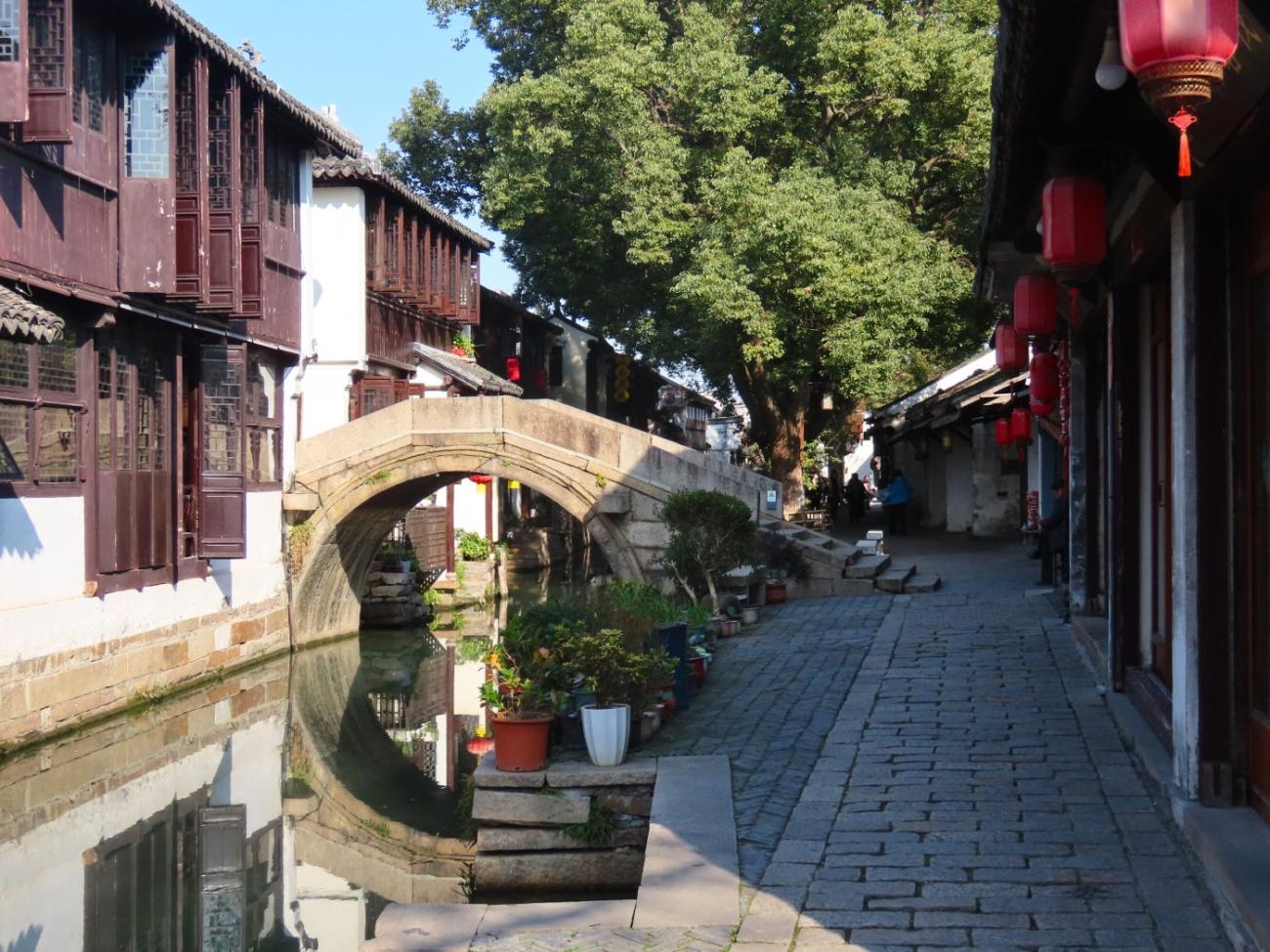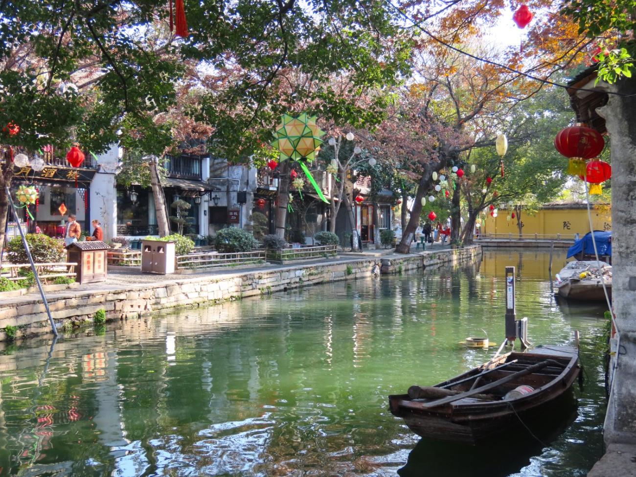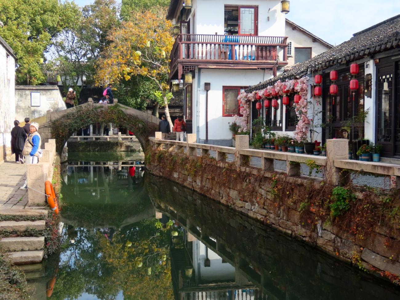 Tirsdag den 16. december beslutter vi os for at besøge endnu en af områdets smukke vandbyer, og denne gang tager vi en DiDi til Zhouzhuang, der kigger knap 50 km sydøst for Suzhou. Zhouzhuang kalder sig Kinas vandby nr. 1, og vi bliver bestemt ikke skuffede. Vi har det flotteste vejr i denne smukke by med smalle gader, hyggelige kanaler og små gamle broer, og vi nyder, at hele den gamle del af byen er helt lukket for trafik, også scootere.