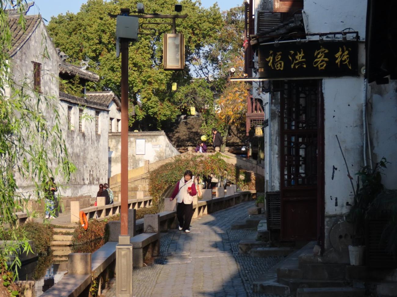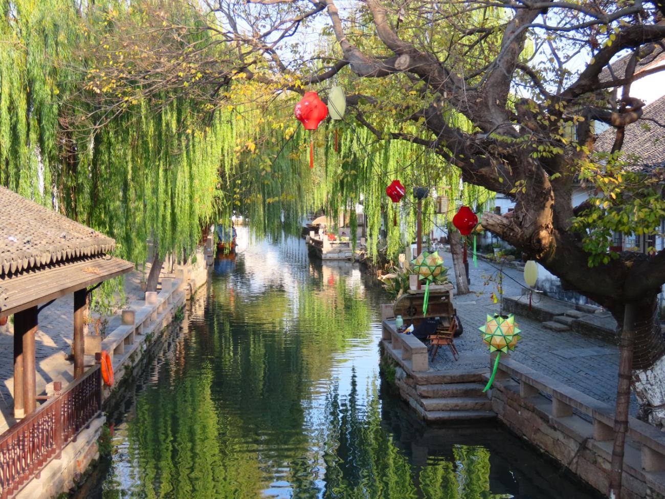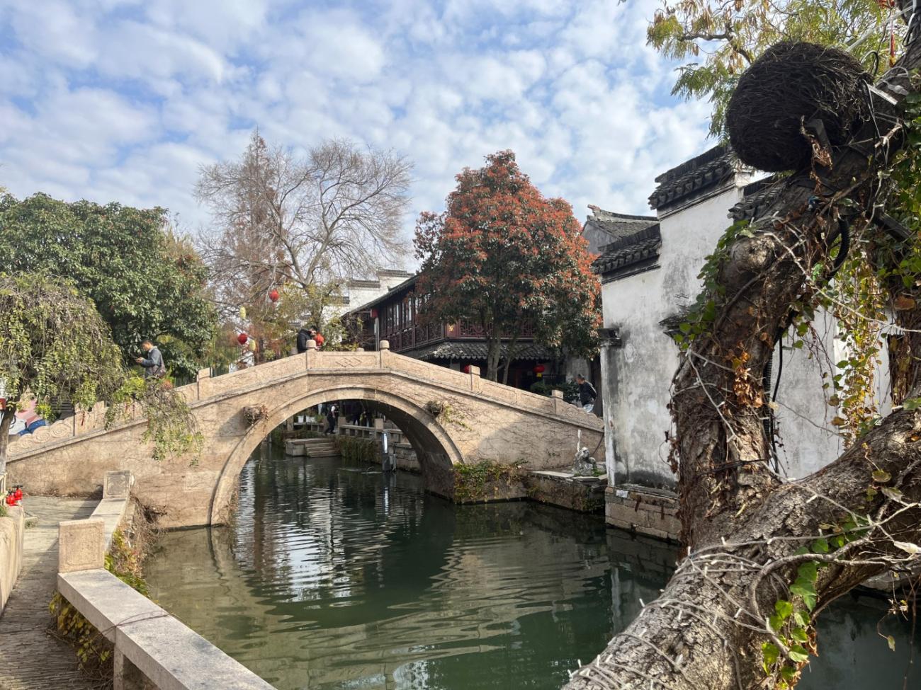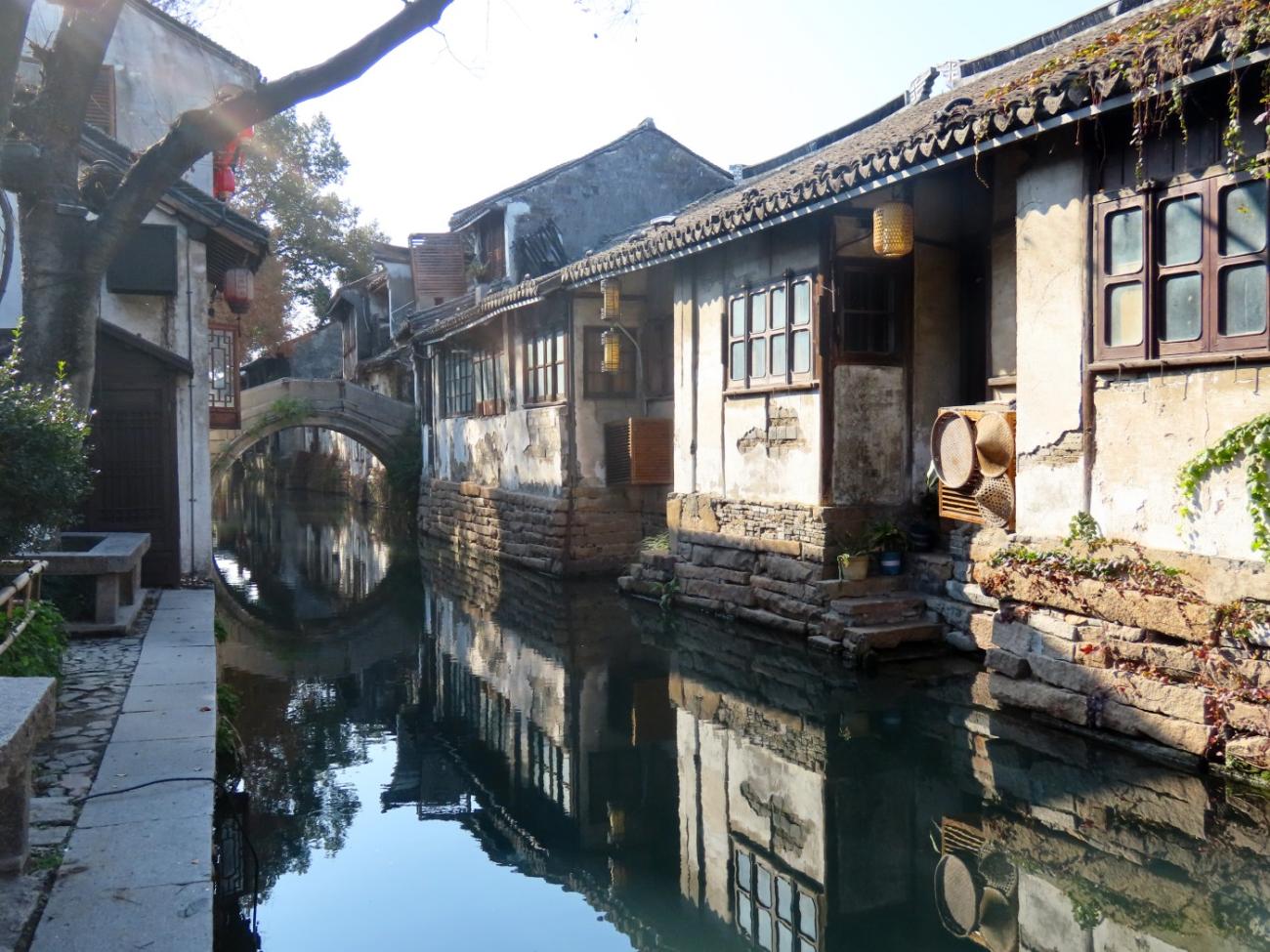 Tirsdag den 16. december beslutter vi os for at besøge endnu en af områdets smukke vandbyer, og denne gang tager vi en DiDi til Zhouzhuang, der kigger knap 50 km sydøst for Suzhou. Zhouzhuang kalder sig Kinas vandby nr. 1, og vi bliver bestemt ikke skuffede. Vi har det flotteste vejr i denne smukke by med smalle gader, hyggelige kanaler og små gamle broer, og vi nyder, at hele den gamle del af byen er helt lukket for trafik, også scootere.