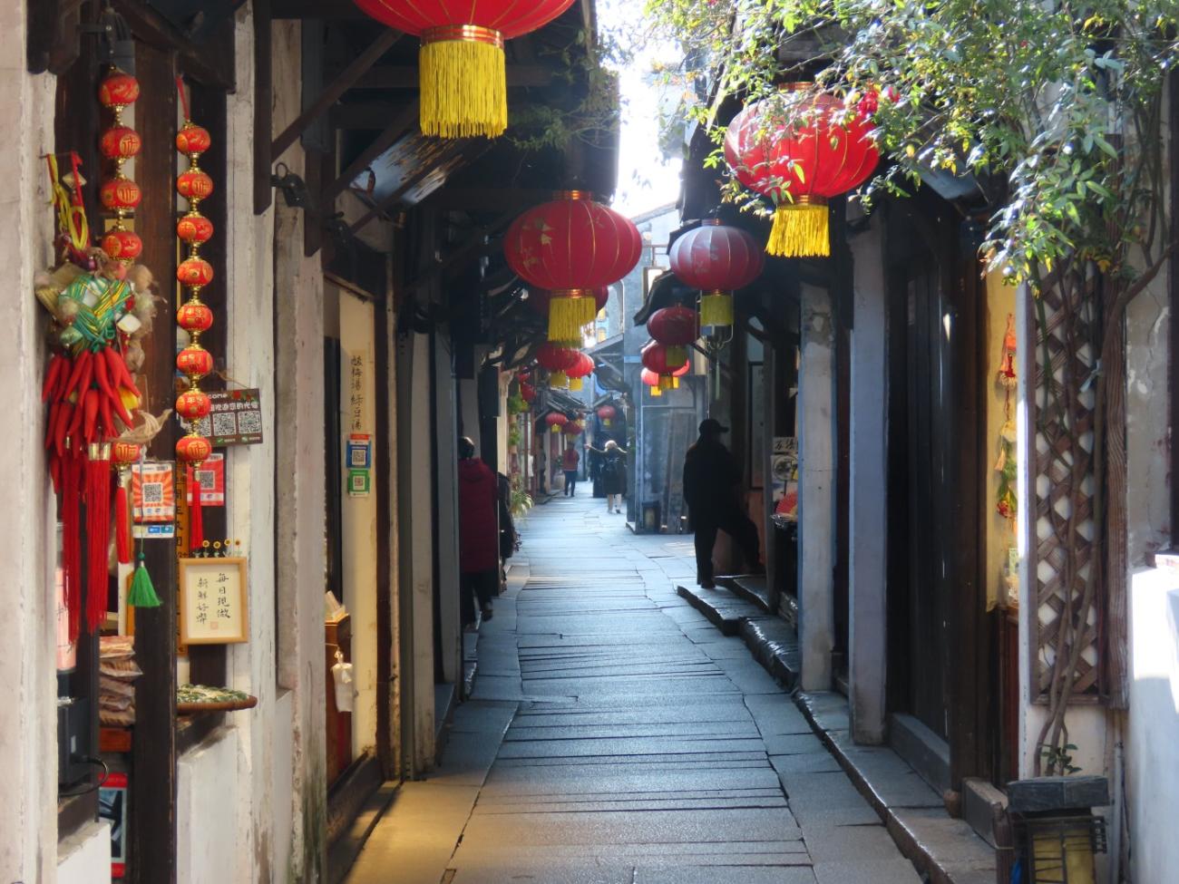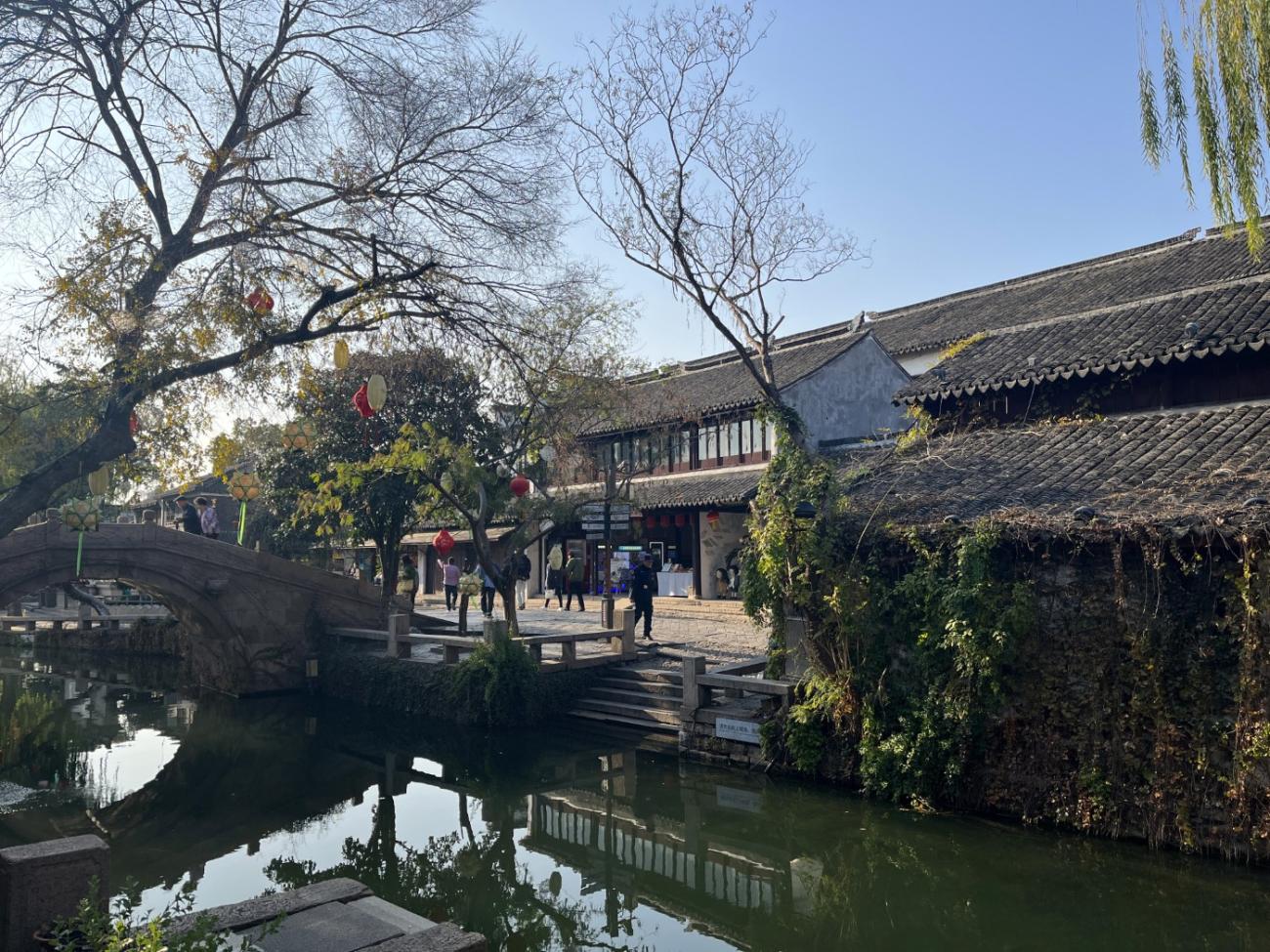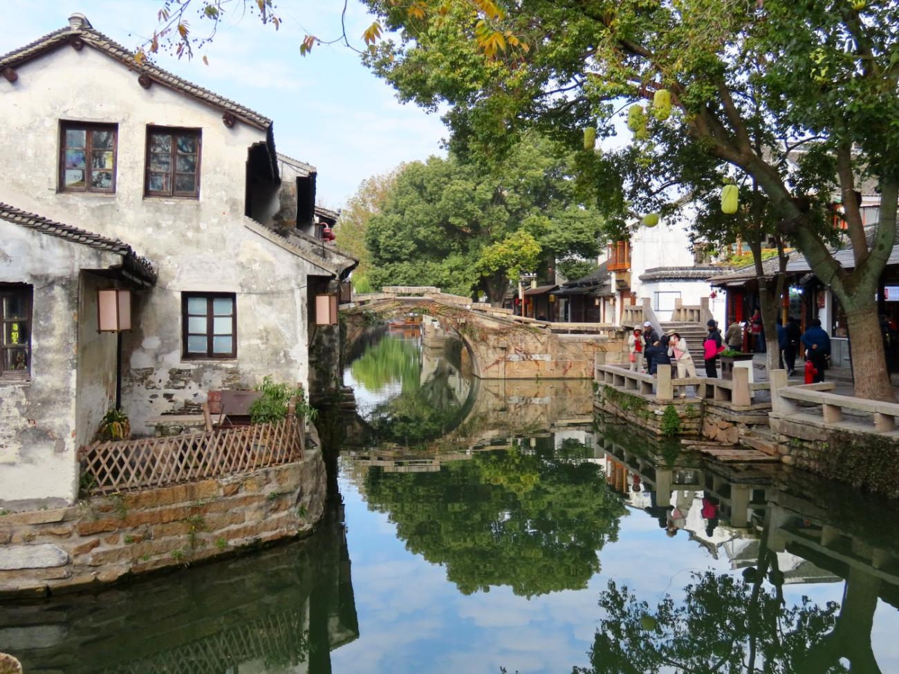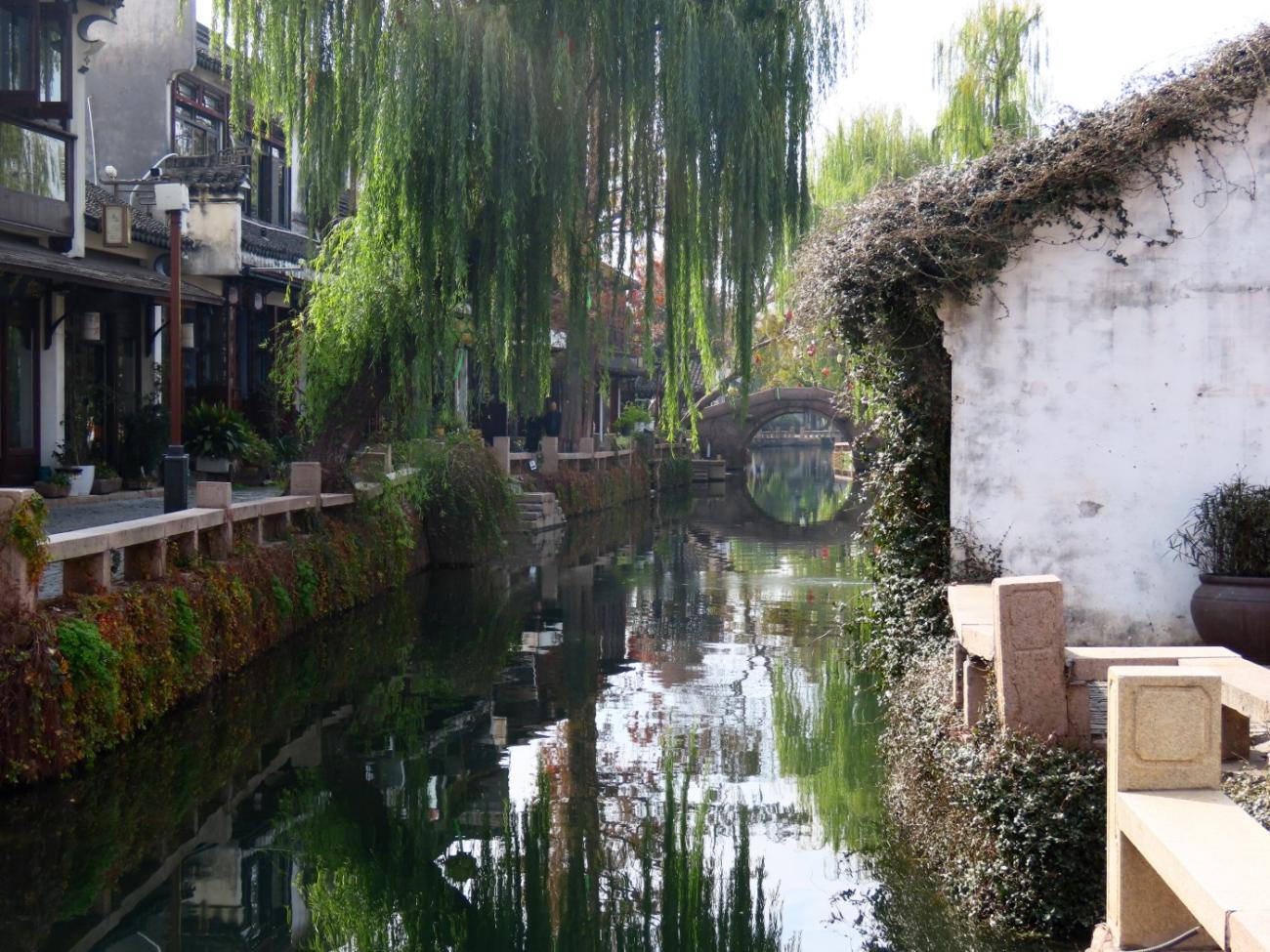 Tirsdag den 16. december beslutter vi os for at besøge endnu en af områdets smukke vandbyer, og denne gang tager vi en DiDi til Zhouzhuang, der kigger knap 50 km sydøst for Suzhou. Zhouzhuang kalder sig Kinas vandby nr. 1, og vi bliver bestemt ikke skuffede. Vi har det flotteste vejr i denne smukke by med smalle gader, hyggelige kanaler og små gamle broer, og vi nyder, at hele den gamle del af byen er helt lukket for trafik, også scootere.