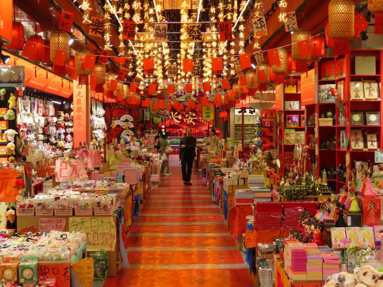 Der er gode muligheder for at købe souvenirs i Xi’an, og vi får købt flere ting i turistområdet ved Shuyuanmen Street, hvor boder med alt fra vifter, kalligrafisæt og træfigurer til magneter, stempler og smykker ligger tæt. Her er hyggeligt, og sælgerne er heldigvis ikke alt for pågående, så vi kan kigge på tingene i ro og mag og bliver også helt gode til at prutte om prisen. Vi får også købt lidt souvenirs i det muslimske kvarter, og Hanne får købt en krukke håndcreme, som åbenbart er det helt store nogle steder i Kina; der er flere flotte butikker, som kun sælger håndcreme.