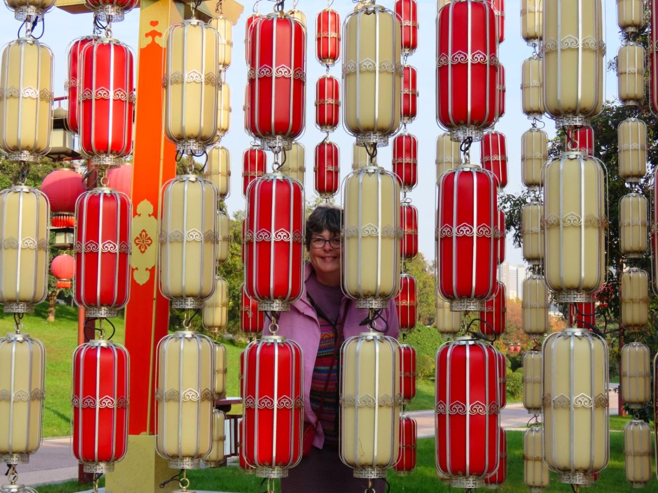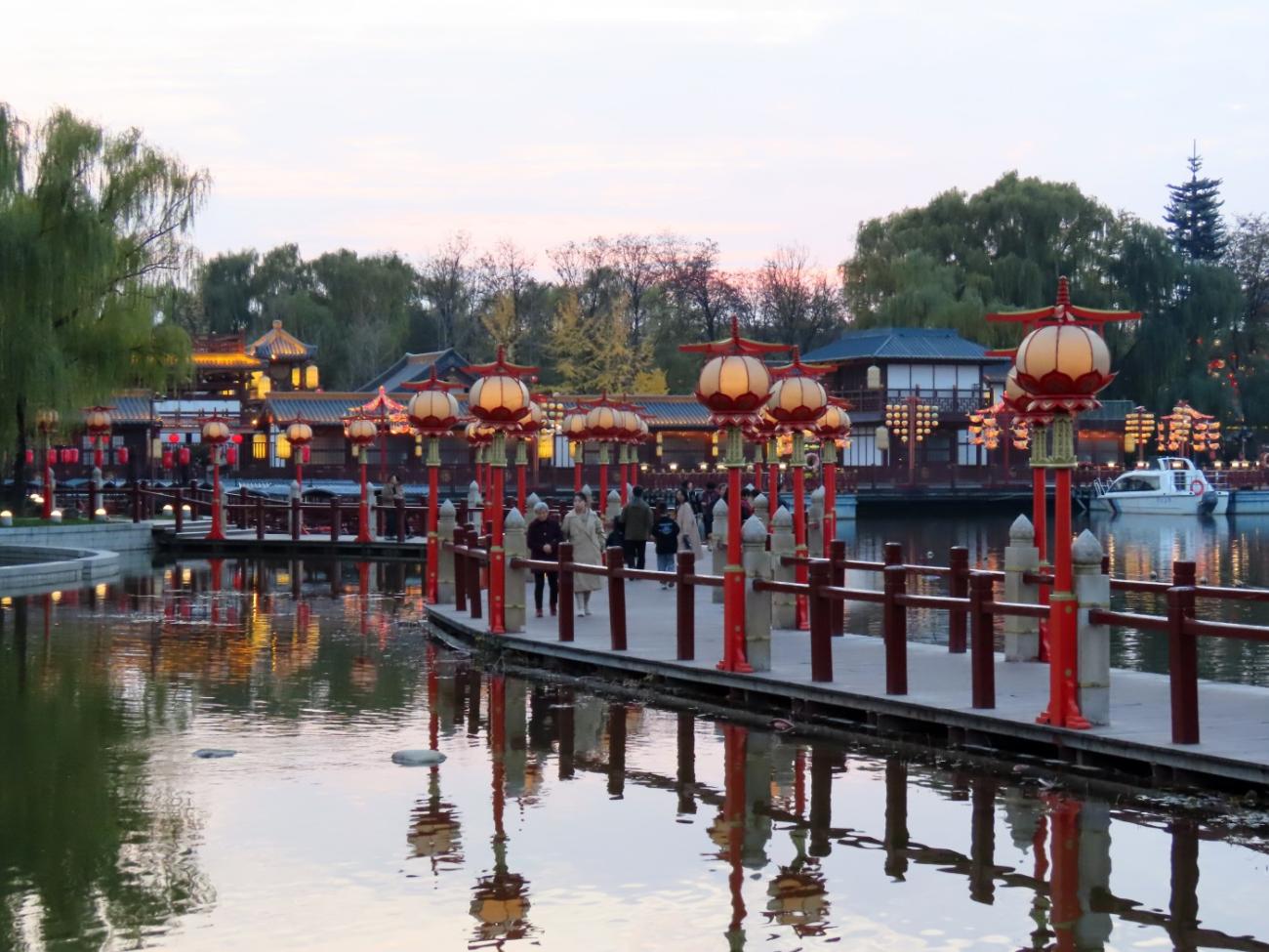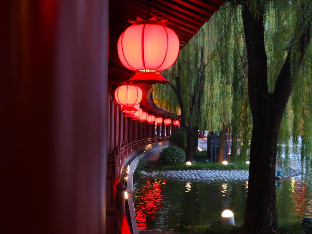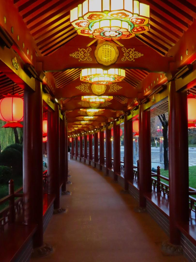 Det er et meget stort område med flotte bygninger, et tempel, skulpturer, springvand, små kanaler, butikker og restauranter, og en stor del af området består af en meget stor sø, som vi når rundt om et par gange, så vi både kan se de mange flotte bygninger og ikke mindst den meget smukke søjlegang i dagslys, og efter solen er gået ned. Her er også en lille teaterforestilling og på et senere tidspunkt en musikgruppe, der optræder. Da vi forlader parken efter 3 timer og 30 minutter og 9 km i benene kan vi nyde, at alle lanternerne er blevet tændt, og vi er glade for, at vi fik besøgt dette smukke sted.