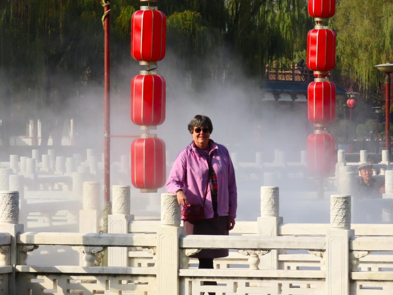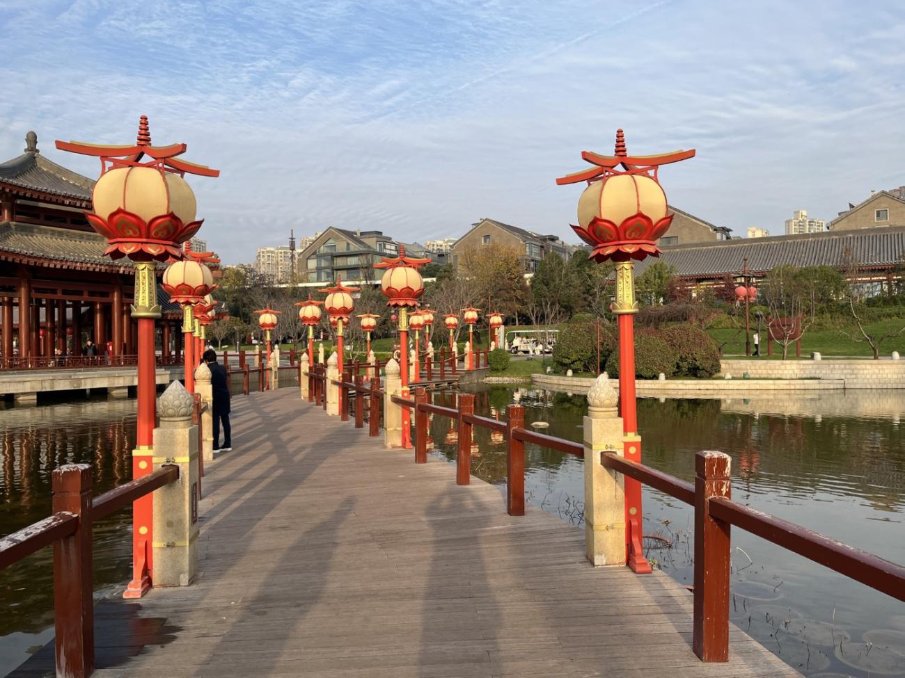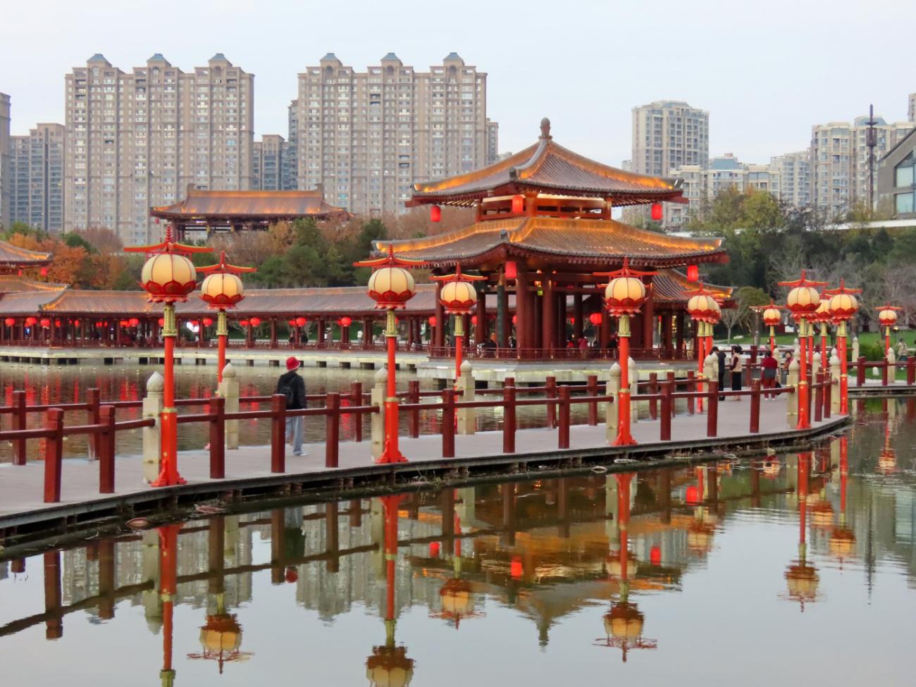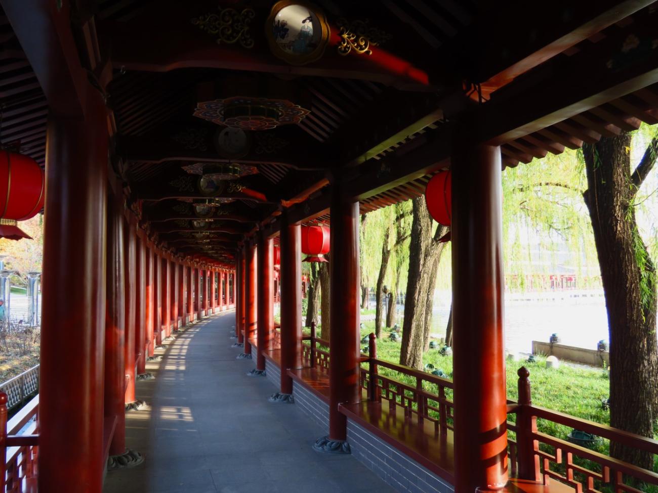 Det er et meget stort område med flotte bygninger, et tempel, skulpturer, springvand, små kanaler, butikker og restauranter, og en stor del af området består af en meget stor sø, som vi når rundt om et par gange, så vi både kan se de mange flotte bygninger og ikke mindst den meget smukke søjlegang i dagslys, og efter solen er gået ned. Her er også en lille teaterforestilling og på et senere tidspunkt en musikgruppe, der optræder. Da vi forlader parken efter 3 timer og 30 minutter og 9 km i benene kan vi nyde, at alle lanternerne er blevet tændt, og vi er glade for, at vi fik besøgt dette smukke sted.