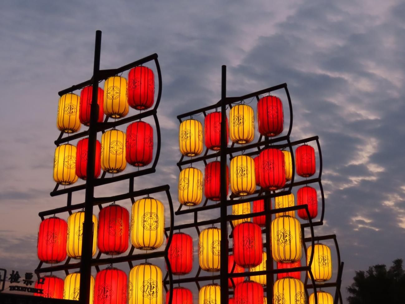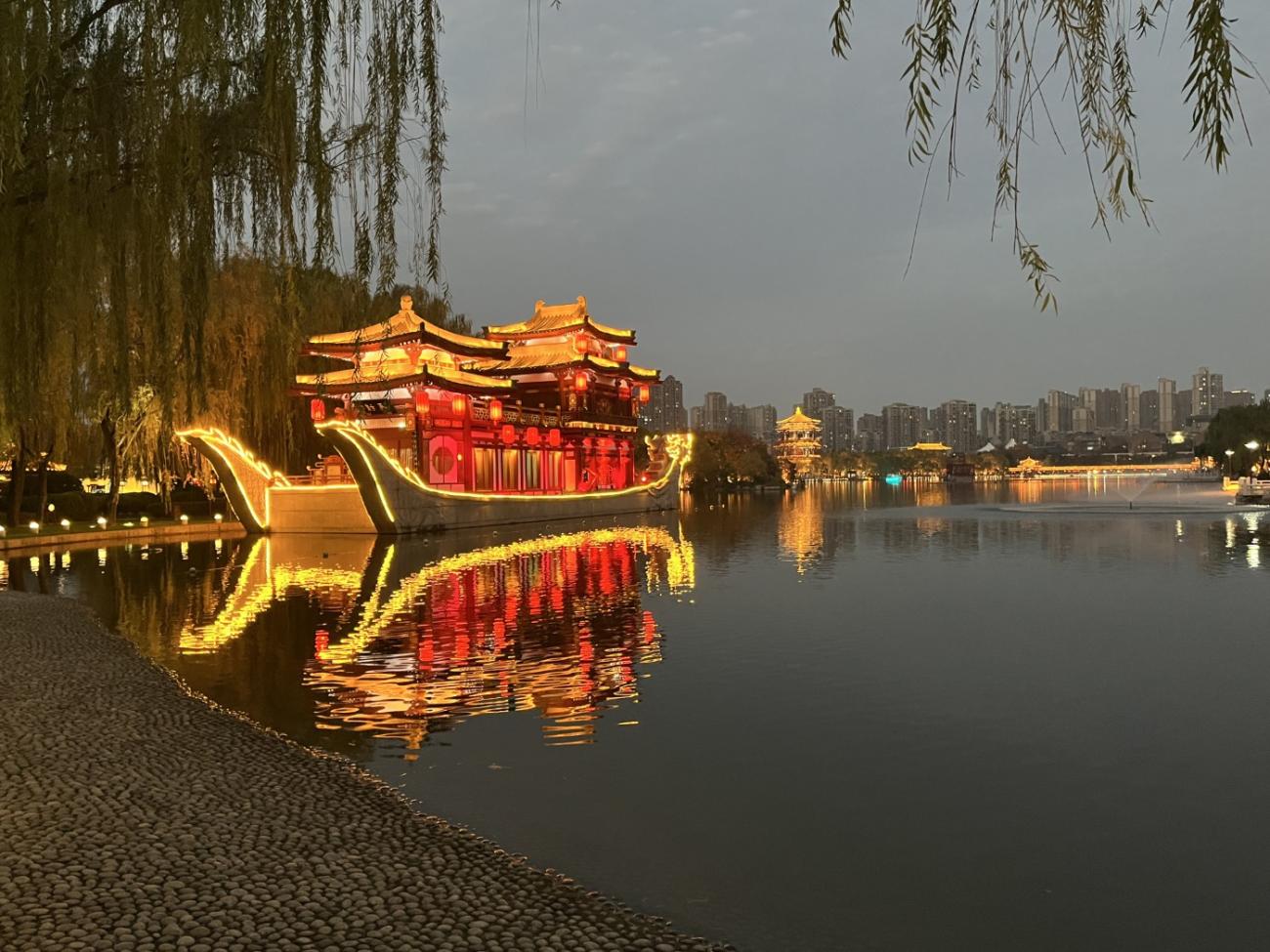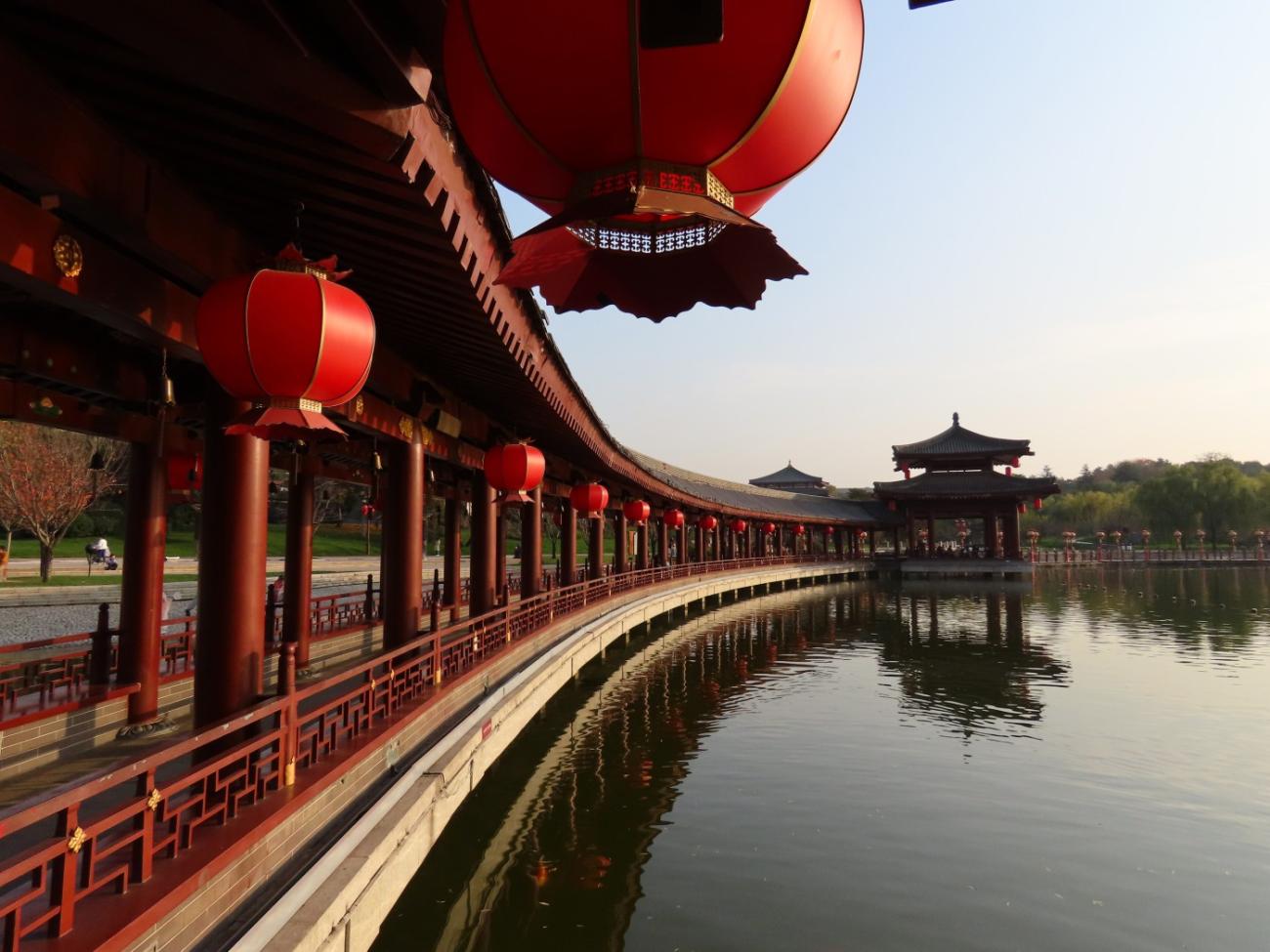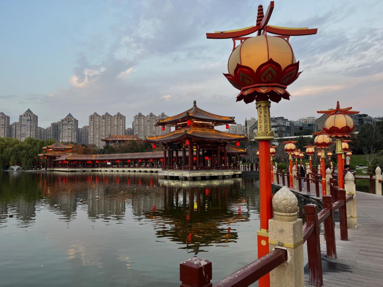 Det er et meget stort område med flotte bygninger, et tempel, skulpturer, springvand, små kanaler, butikker og restauranter, og en stor del af området består af en meget stor sø, som vi når rundt om et par gange, så vi både kan se de mange flotte bygninger og ikke mindst den meget smukke søjlegang i dagslys, og efter solen er gået ned. Her er også en lille teaterforestilling og på et senere tidspunkt en musikgruppe, der optræder. Da vi forlader parken efter 3 timer og 30 minutter og 9 km i benene kan vi nyde, at alle lanternerne er blevet tændt, og vi er glade for, at vi fik besøgt dette smukke sted.