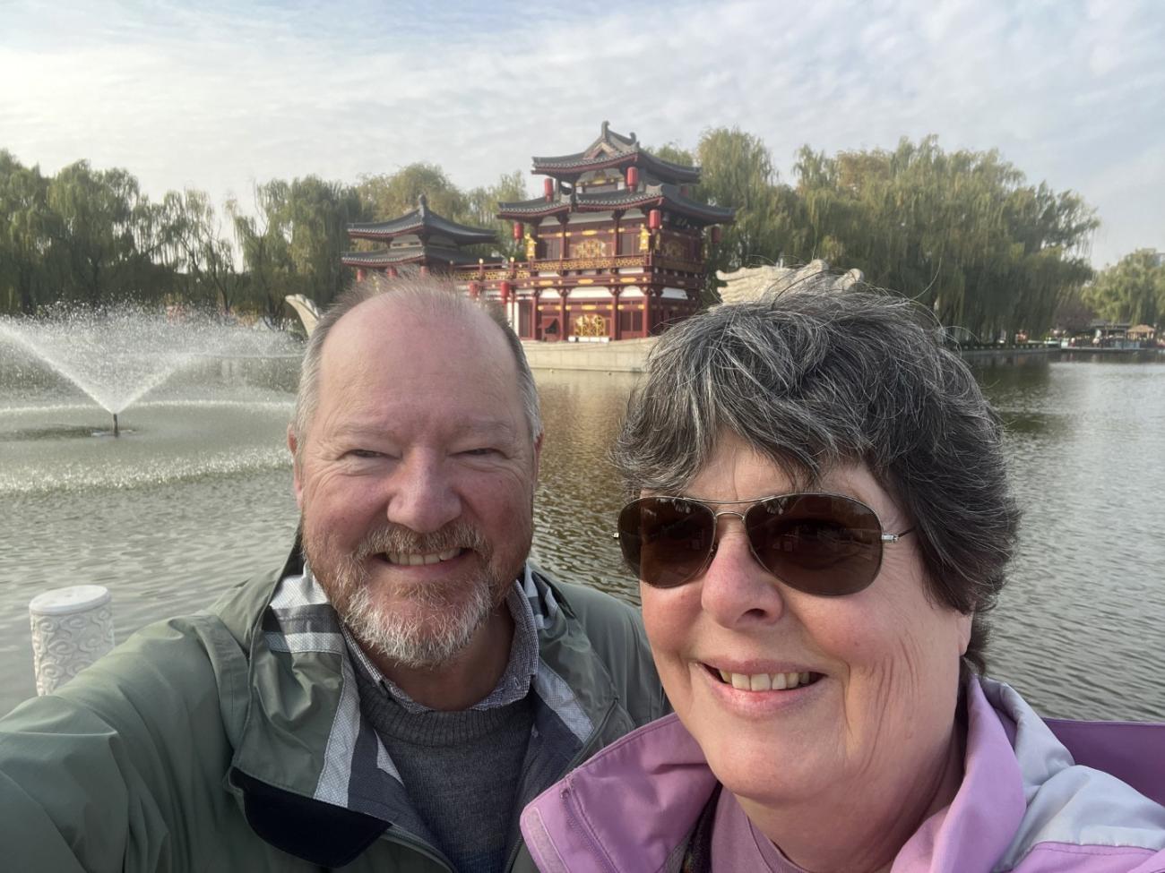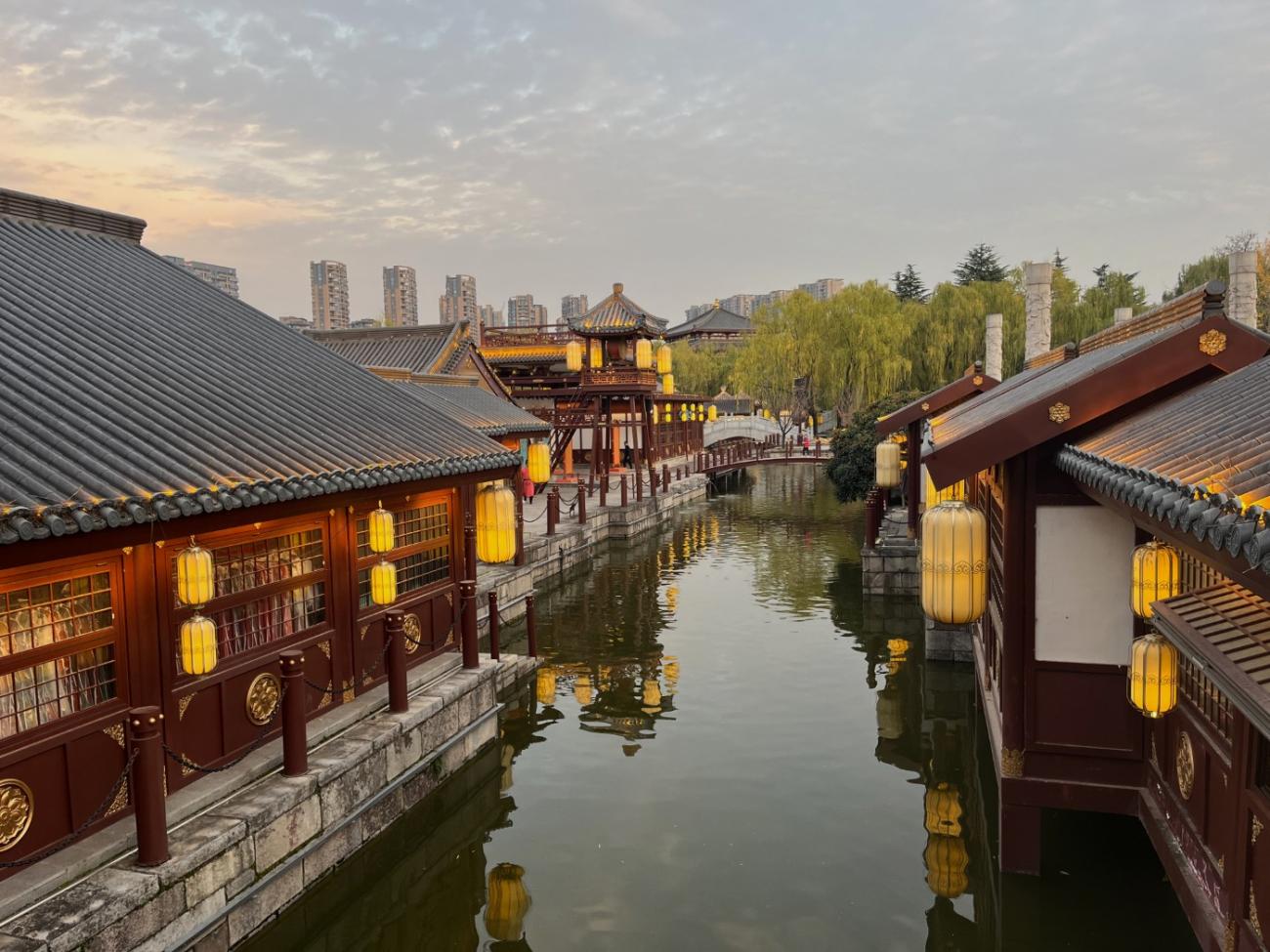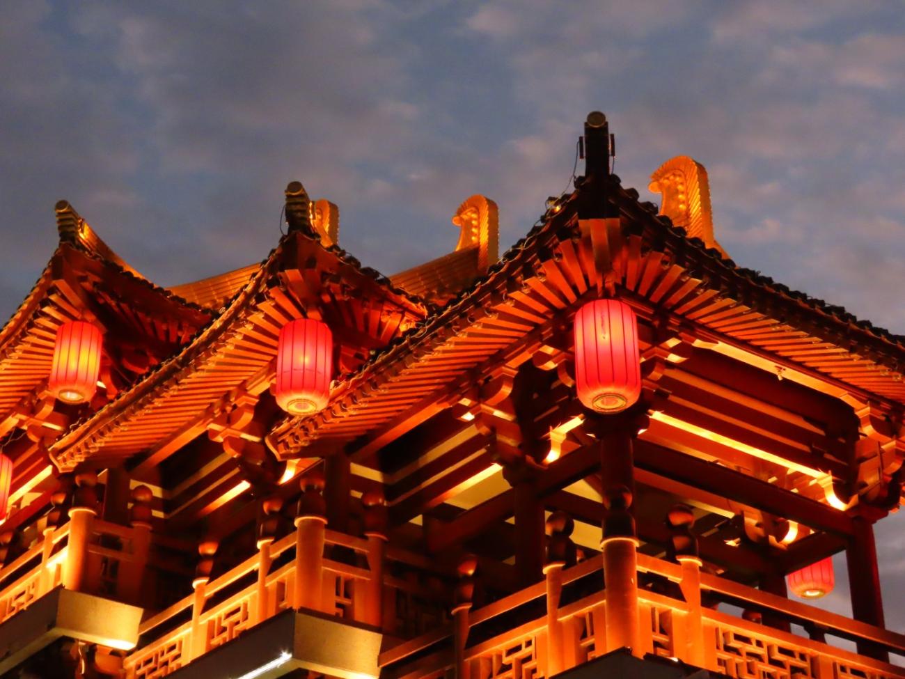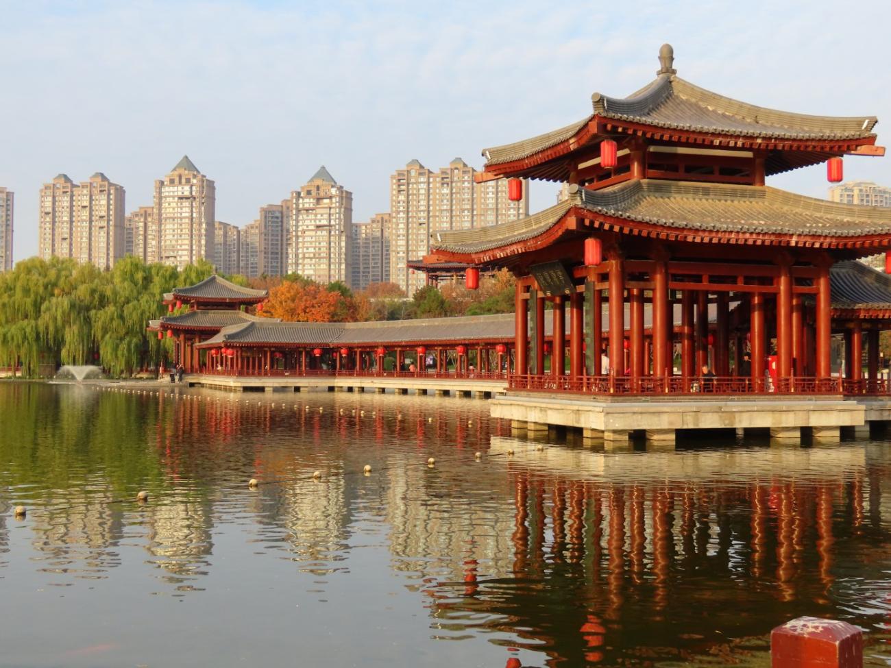 Det er et meget stort område med flotte bygninger, et tempel, skulpturer, springvand, små kanaler, butikker og restauranter, og en stor del af området består af en meget stor sø, som vi når rundt om et par gange, så vi både kan se de mange flotte bygninger og ikke mindst den meget smukke søjlegang i dagslys, og efter solen er gået ned. Her er også en lille teaterforestilling og på et senere tidspunkt en musikgruppe, der optræder. Da vi forlader parken efter 3 timer og 30 minutter og 9 km i benene kan vi nyde, at alle lanternerne er blevet tændt, og vi er glade for, at vi fik besøgt dette smukke sted.