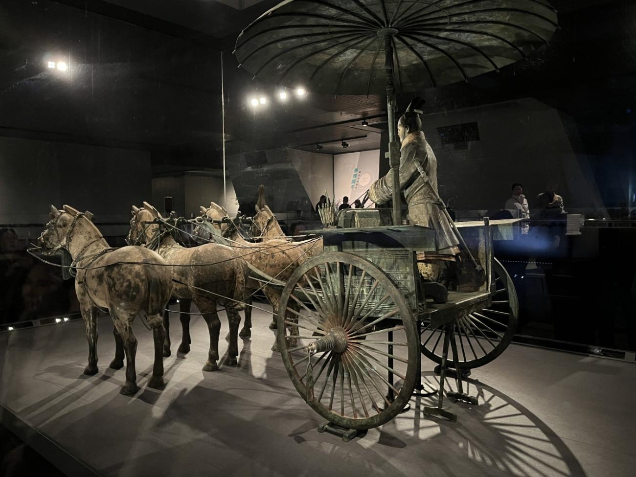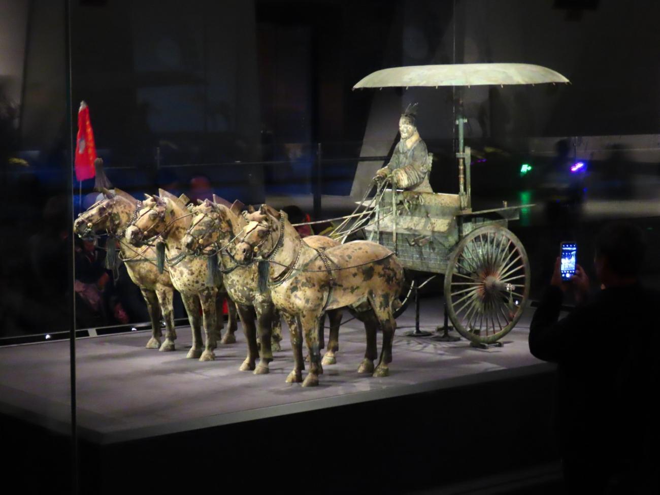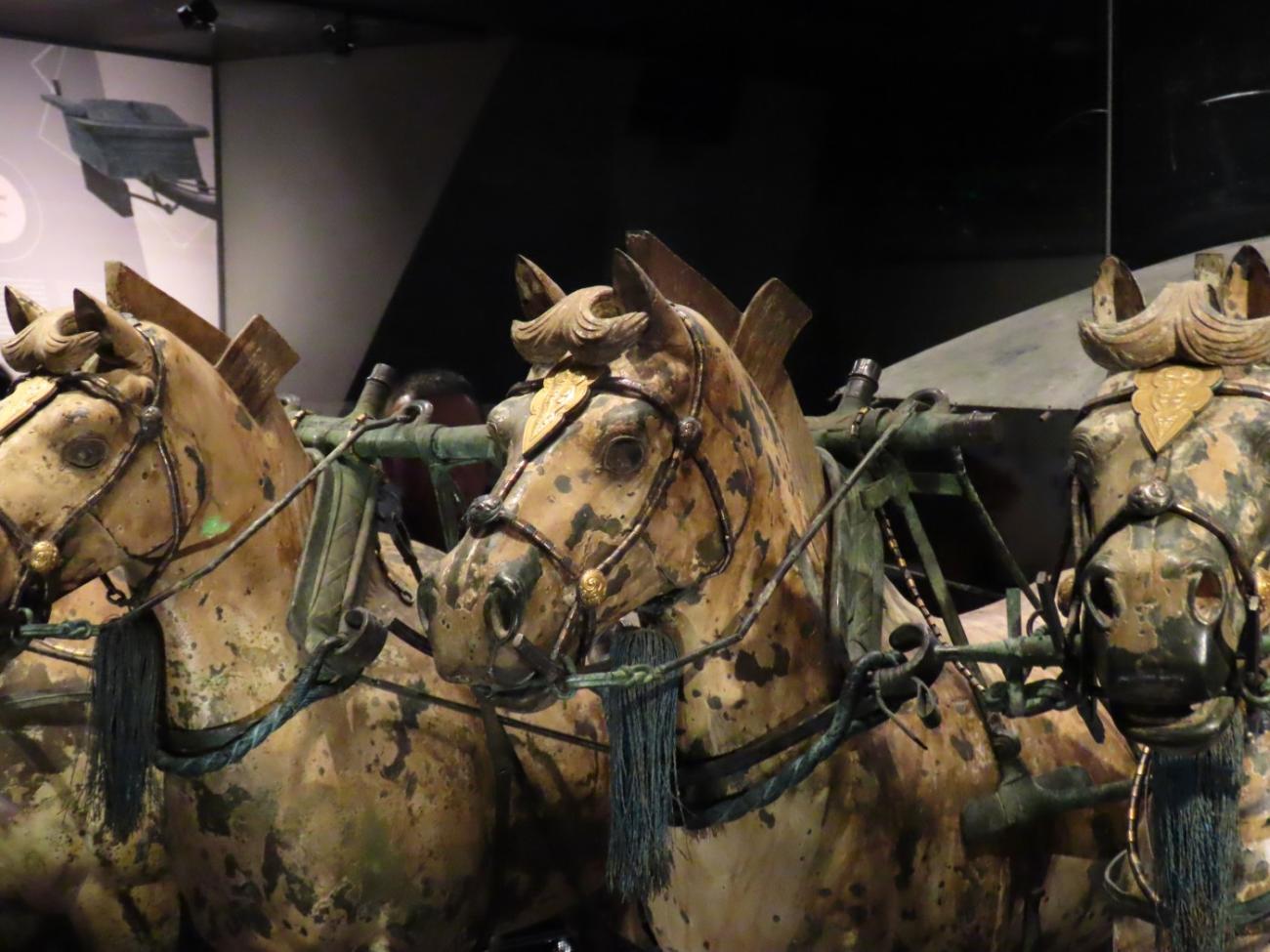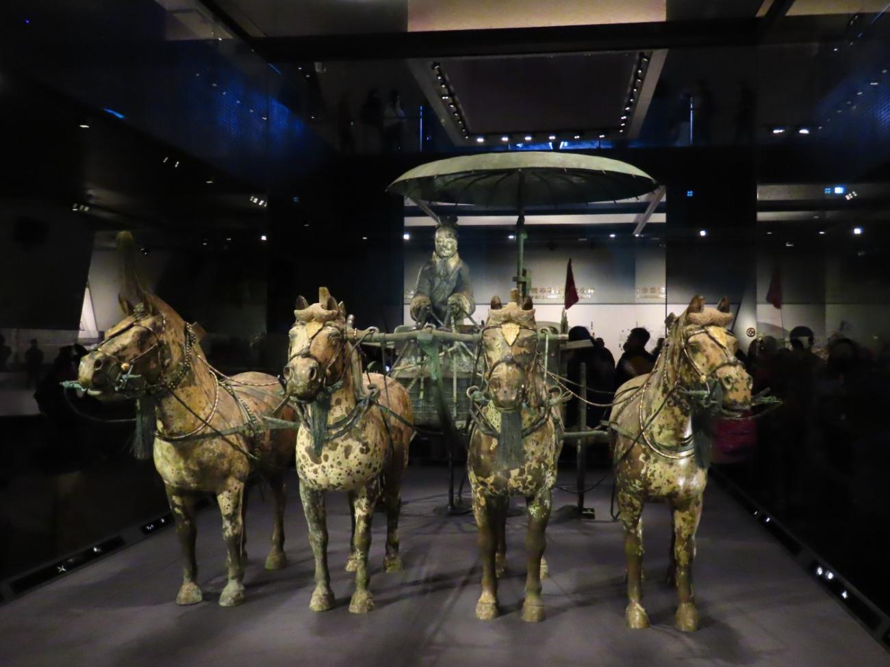 Inden vi går helt ud ad området, finder vi ud af, at vi kan besøge mausoleet for kejser Qin Shi Huangs, der ligger et par kilometer fra udgravningerne, så vi tager en shuttlebus dertil. Man kan ikke komme til at se selve mausoleet, men der er flere museer, så vi køber billetter til en lille shuttlebus, der kører rundt i det ret store område. Vi ser bl.a. nogle meget smukke bronzevogne med heste og må købe endnu en magnet.