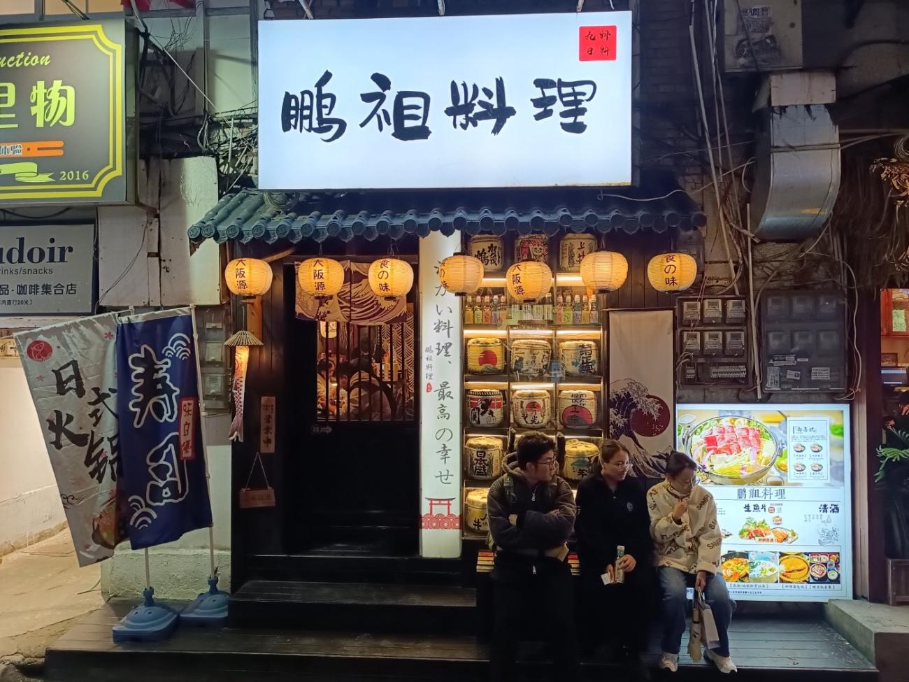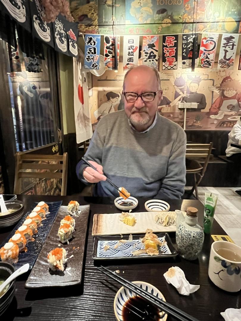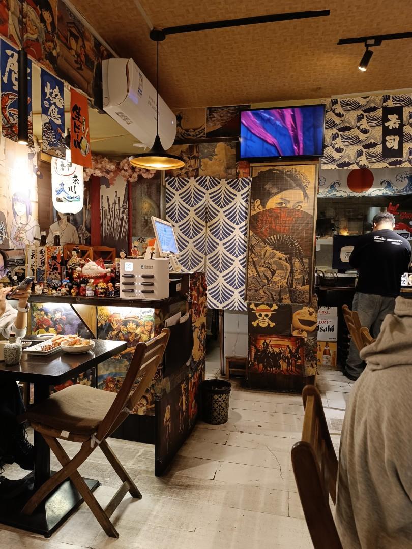 Jens Peter er blevet anbefalet en burgerbar i området lidt øst for den lille gågade, så der tager vi en DiDi op. Her er en lille hyggelig gade med flere restauranter, men vi kan ikke finde nogen burgerbar. Vi finder til gengæld en lille sushirestaurant, der hedder Pengzu Cuisine, så der går vi ind i stedet for. Her er hyggeligt, og vi får god sushi, og gæsterne ved bordet ved siden af kan fortælle, at burgerbaren er lukket for et par år siden. Vi kommer tilbage for endnu et besøg, inden vi rejser.