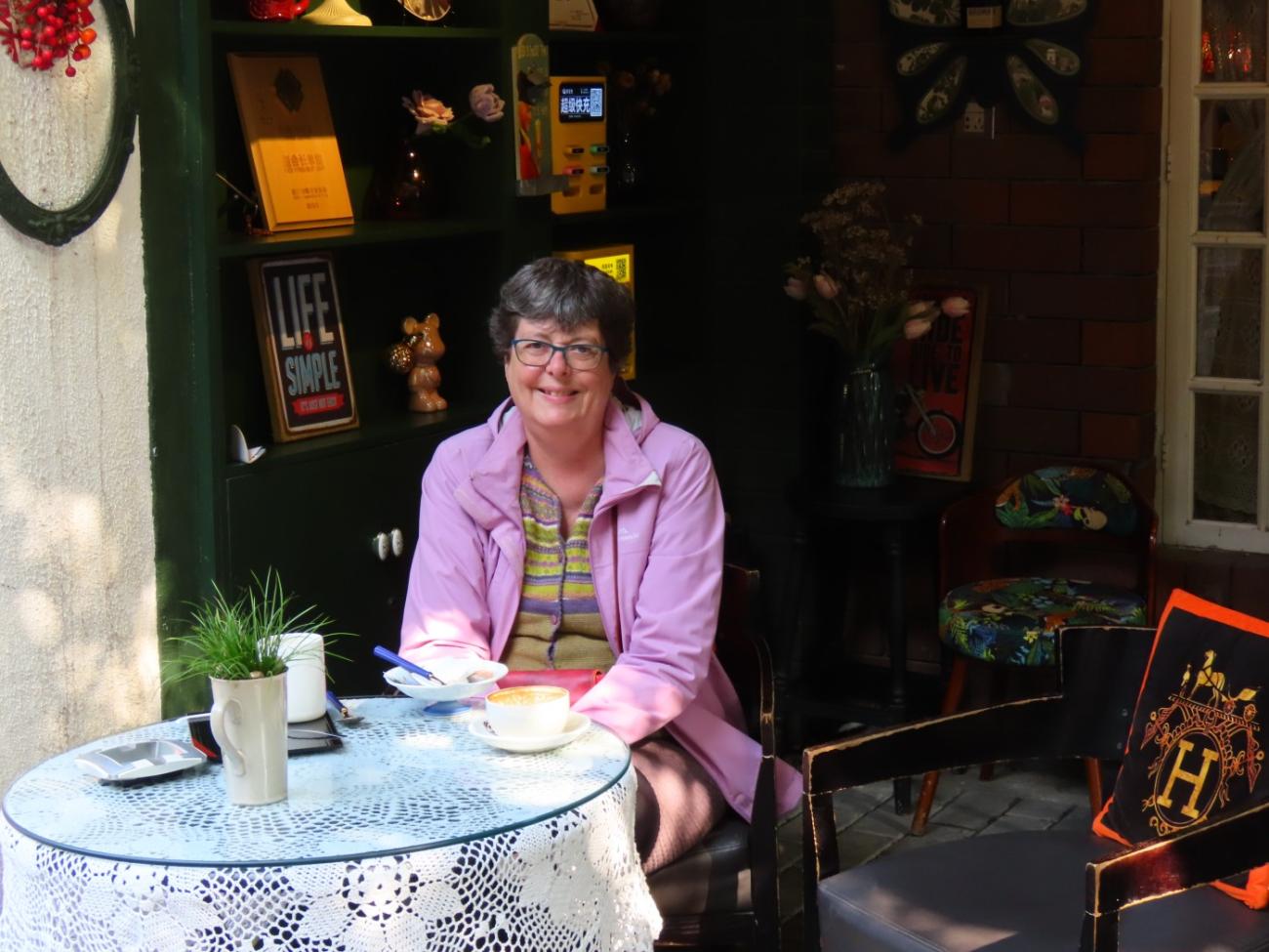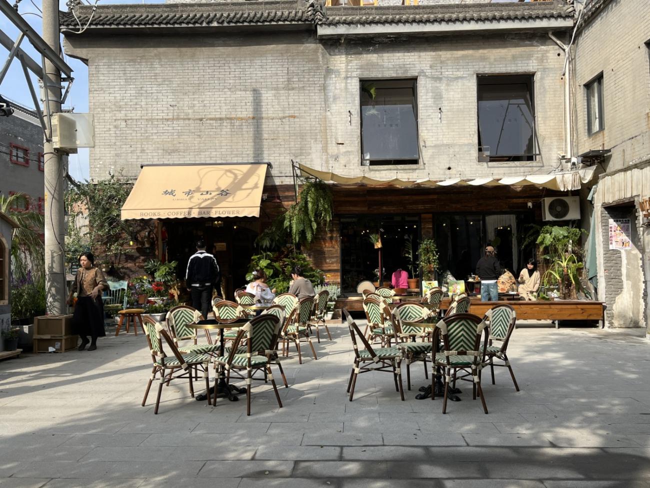 På strækningen nede ved muren i vestlig retning fra vores hotel besøger vi Heping West Coffee, hvor der er bamser alle vegne, og her får vi god te, og hos Giorgio Cafe lige ved siden af er det for meste umuligt at få bord, men da det lykkes os, må vi vente urimeligt længe på at få serveret et par scones. Caféen Urban Valley ligger tæt på den næste byport, og det er et hyggeligt og lidt alternativt sted med en stor terrasse foran, hvor der indimellem bliver underholdt med sang og guitarspil. Første gang drikker vi kaffe, men da de både har et kaffekort og et vinkort, bestiller vi gangen efter to glas hvidvin, men får serveret to glas kinesisk spiritus af en eller anden art i stedet. Det smager egentlig udmærket, men det er vist mere et drinkskort end et vinkort, så gangen efter bestiller vi to gin og tonic.