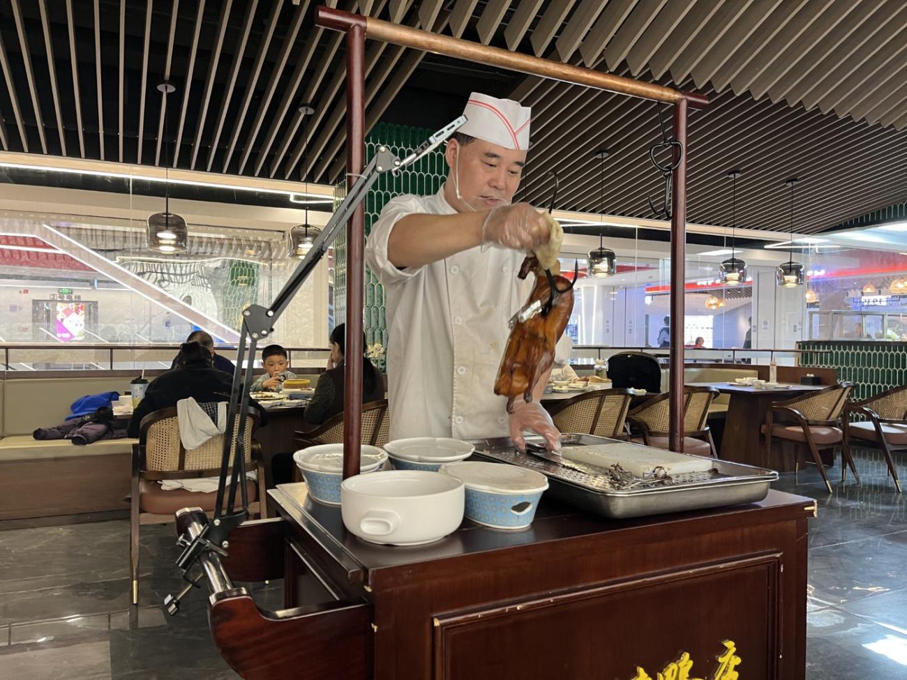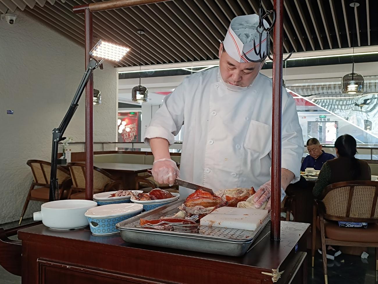 Vi besøger Xi’an Roast Duck Restaurant i det lille center Hengsen Union Plaza to gange. Her bestiller vi en hel and, som bliver skåret ud i tynde skiver nede ved bordet, og derefter ruller vi andekødet ind i nogle meget tynde pandekager sammen med lidt sauce og grøntsager. Det smager godt.