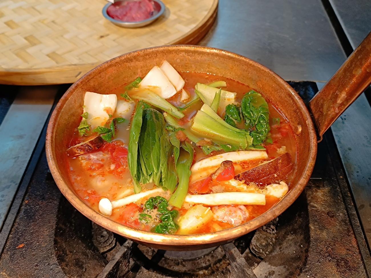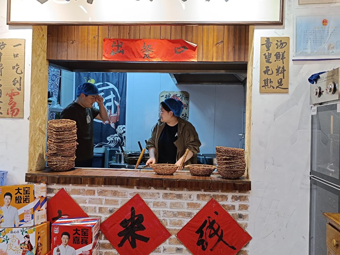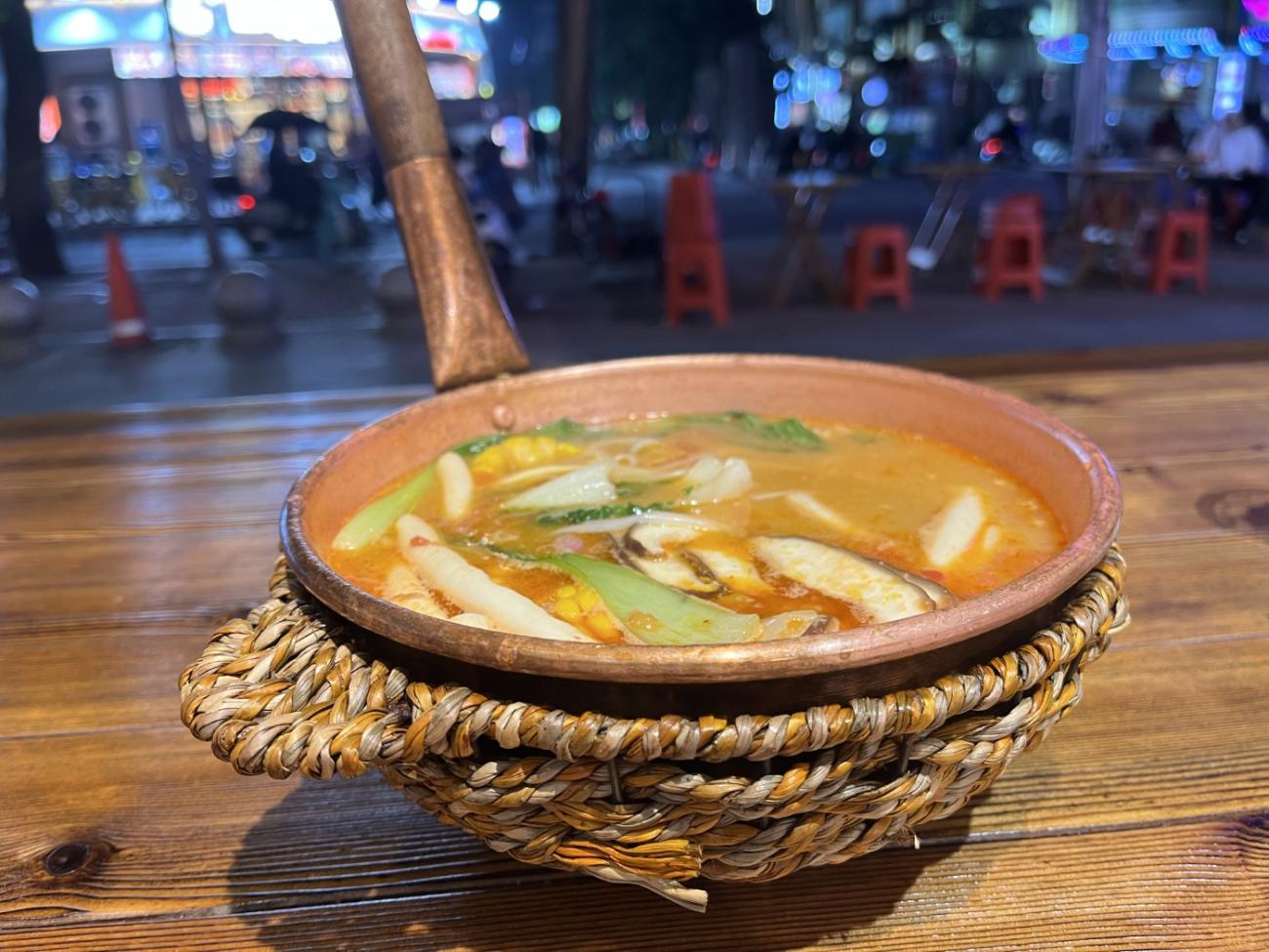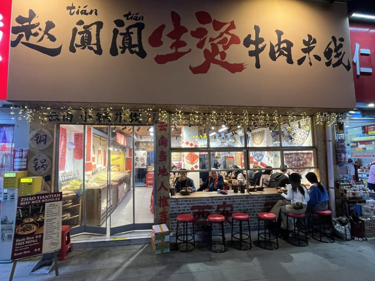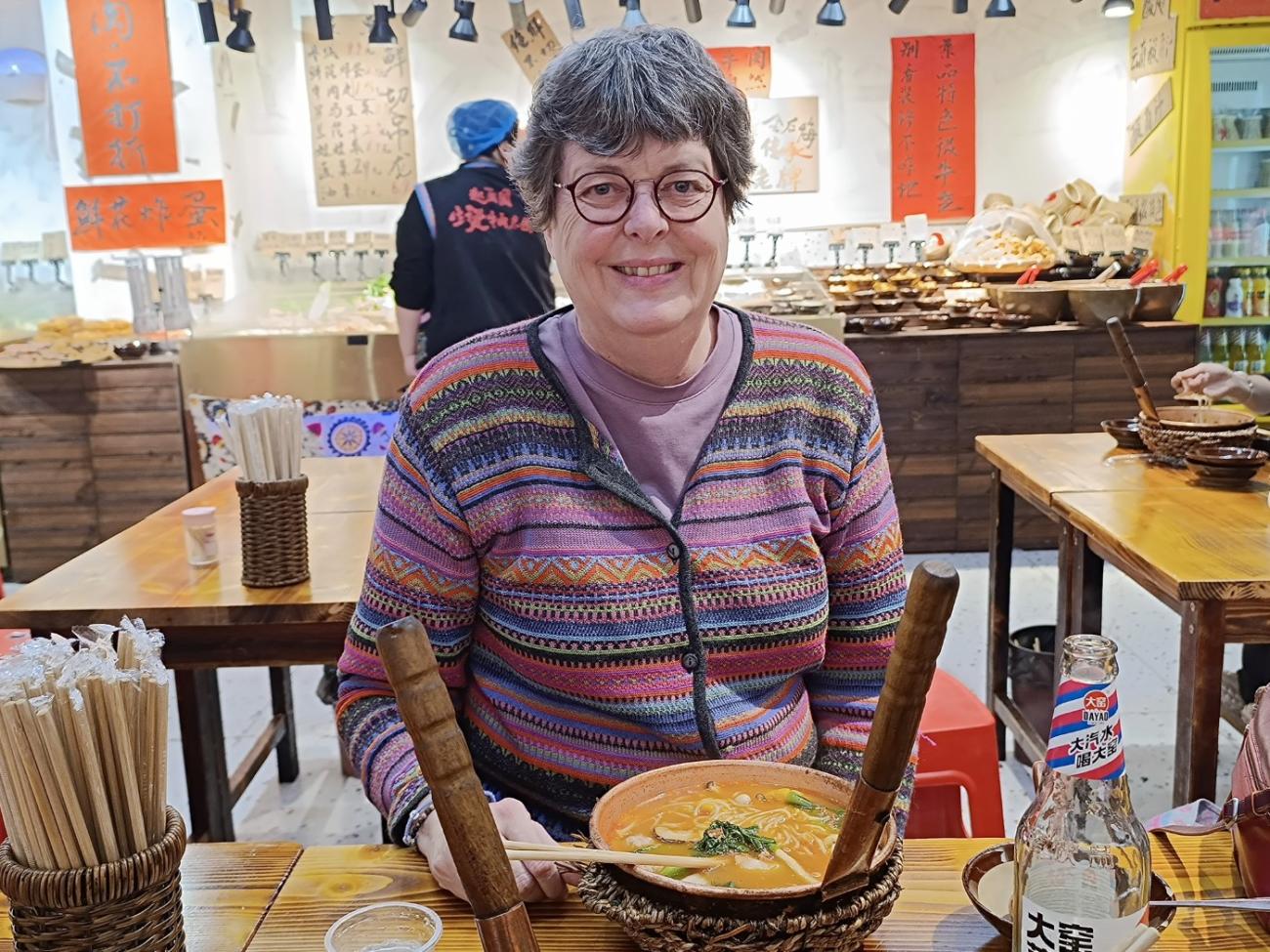 Vi ender med at komme her en del gange, da nudelsuppen smager rigtig godt, og da vi kan spise os stopmætte for 45 kr. pr. mand inkl. en sodavand. Vi vælger forskellige ting som kål, svampe, majs, kødboller og oksekødsstrimler og betaler oppe ved kassen, hvorefter det hele kommer ned i den boblende varme suppe. Vi får som de eneste serveret nede ved bordet, da de godt ved, at vi ikke forstår, når vi på kinesisk får at vide, at maden er klar. Der er ikke nogen, der taler engelsk.