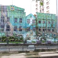 Efter lidt historiefortælling går vi langs floden ad den del, der kaldes River of Life; her er mange flotte vægmalerier, og den lille moske Masjid Jamek Sultan Abdul Samad ligger, hvor de to floder mødes. Vi går gennem markedshallen Central Market, stopper op ved det taoistiske tempel Guan Di og går derefter gennem handelsgaden Jalan Petaling, hvor vi får mulighed for at smage frugten durian. Den har ry for at være meget ildelugtende, og guiden Hakim deler derfor plastikhandsker ud. Vi siger pænt nej tak, og der er da vist også kun en enkelt af de andre deltagere, der kan lide den; han kommer fra Singapore. Derefter er det tid til en forfriskning på et lille lokalt sted, hvor vi får en vandmelondrik. Sidste stop i Chinatown er i den lille baggård Kwai Chai Hong, hvor der er en række meget smukke vægmalerier.